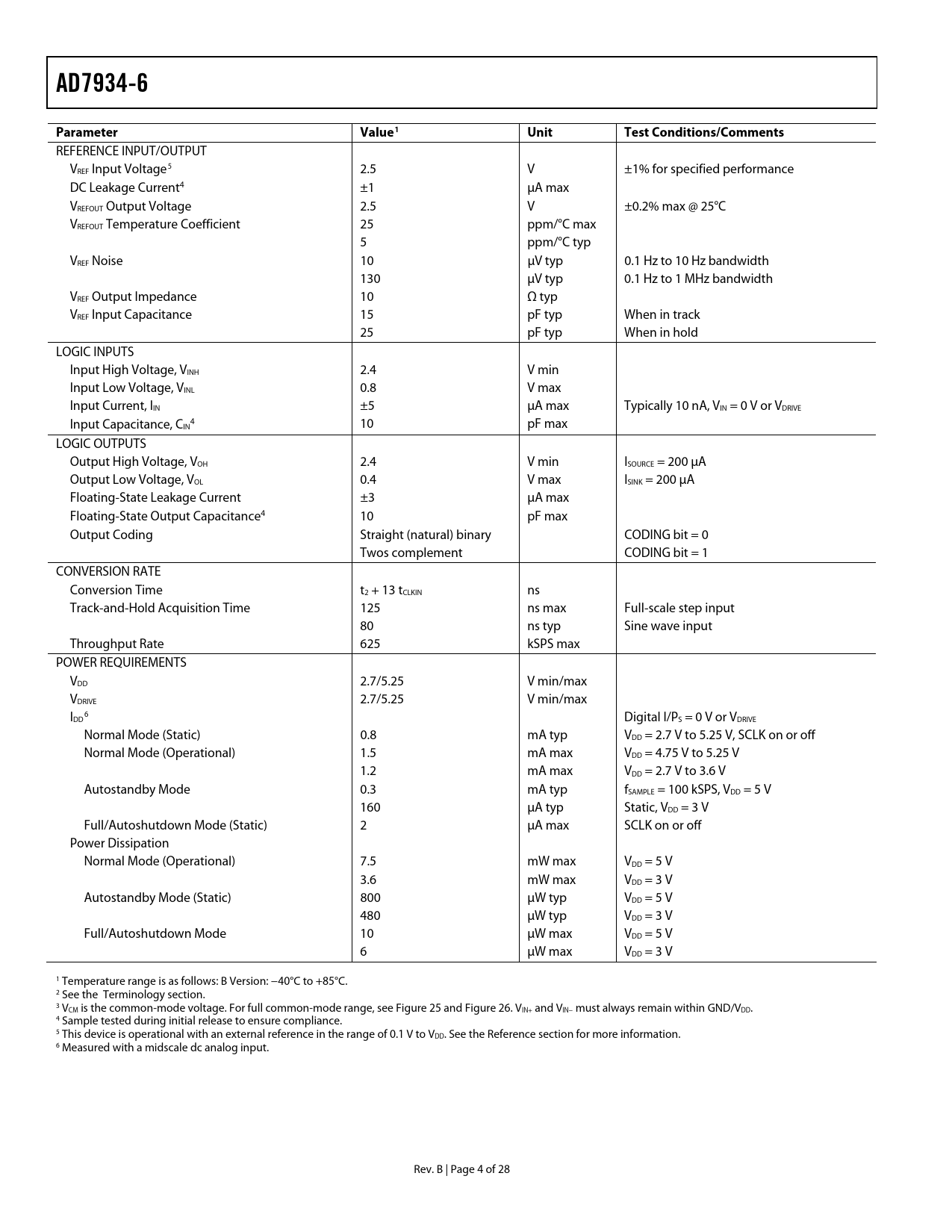 link to page 5 link to page 5 link to page 5 link to page 5 link to page 5 link to page 12 link to page 19 link to page 19 link to page 21 link to page 5 AD7934-6ParameterValue1UnitTest Conditions/Comments REFERENCE INPUT/OUTPUT VREF Input Voltage5 2.5 V ±1% for specified performance DC Leakage Current4 ±1 μA max VREFOUT Output Voltage 2.5 V ±0.2% max @ 25°C VREFOUT Temperature Coefficient 25 ppm/°C max 5 ppm/°C typ VREF Noise 10 μV typ 0.1 Hz to 10 Hz bandwidth 130 μV typ 0.1 Hz to 1 MHz bandwidth VREF Output Impedance 10 Ω typ VREF Input Capacitance 15 pF typ When in track 25 pF typ When in hold LOGIC INPUTS Input High Voltage, VINH 2.4 V min Input Low Voltage, VINL 0.8 V max Input Current, IIN ±5 μA max Typically 10 nA, VIN = 0 V or VDRIVE Input Capacitance, C 4 IN 10 pF max LOGIC OUTPUTS Output High Voltage, VOH 2.4 V min ISOURCE = 200 μA Output Low Voltage, VOL 0.4 V max ISINK = 200 μA Floating-State Leakage Current ±3 μA max Floating-State Output Capacitance4 10 pF max Output Coding Straight (natural) binary CODING bit = 0 Twos complement CODING bit = 1 CONVERSION RATE Conversion Time t2 + 13 tCLKIN ns Track-and-Hold Acquisition Time 125 ns max Full-scale step input 80 ns typ Sine wave input Throughput Rate 625 kSPS max POWER REQUIREMENTS VDD 2.7/5.25 V min/max VDRIVE 2.7/5.25 V min/max I 6 DD Digital I/PS = 0 V or VDRIVE Normal Mode (Static) 0.8 mA typ VDD = 2.7 V to 5.25 V, SCLK on or off Normal Mode (Operational) 1.5 mA max VDD = 4.75 V to 5.25 V 1.2 mA max VDD = 2.7 V to 3.6 V Autostandby Mode 0.3 mA typ fSAMPLE = 100 kSPS, VDD = 5 V 160 μA typ Static, VDD = 3 V Full/Autoshutdown Mode (Static) 2 μA max SCLK on or off Power Dissipation Normal Mode (Operational) 7.5 mW max VDD = 5 V 3.6 mW max VDD = 3 V Autostandby Mode (Static) 800 μW typ VDD = 5 V 480 μW typ VDD = 3 V Full/Autoshutdown Mode 10 μW max VDD = 5 V 6 μW max VDD = 3 V 1 Temperature range is as follows: B Version: −40°C to +85°C. 2 See the Terminology section. 3 VCM is the common-mode voltage. For full common-mode range, see Figure 25 and Figure 26. VIN+ and VIN− must always remain within GND/VDD. 4 Sample tested during initial release to ensure compliance. 5 This device is operational with an external reference in the range of 0.1 V to VDD. See the Reference section for more information. 6 Measured with a midscale dc analog input. Rev. B | Page 4 of 28 Document Outline FEATURES FUNCTIONAL BLOCK DIAGRAM GENERAL DESCRIPTION PRODUCT HIGHLIGHTS REVISION HISTORY SPECIFICATIONS TIMING SPECIFICATIONS ABSOLUTE MAXIMUM RATINGS ESD CAUTION PIN CONFIGURATION AND FUNCTION DESCRIPTIONS TYPICAL PERFORMANCE CHARACTERISTICS TERMINOLOGY CONTROL REGISTER SEQUENCER OPERATION Writing to the Control Register to Program the Sequencer CIRCUIT INFORMATION CONVERTER OPERATION ADC TRANSFER FUNCTION TYPICAL CONNECTION DIAGRAM ANALOG INPUT STRUCTURE ANALOG INPUT CONFIGURATIONS Single-Ended Mode Differential Mode Driving Differential Inputs Using an Op Amp Pair Pseudo Differential Mode ANALOG INPUT SELECTION Traditional Multichannel Operation (SEQ0 = SEQ1 = 0) Using the Sequencer: Consecutive Sequence (SEQ0 = SEQ1 = 1) REFERENCE Digital Inputs VDRIVE Input PARALLEL INTERFACE Reading Data from the AD7934-6 Writing Data to the AD7934-6 POWER MODES OF OPERATION Normal Mode (PM1 = PM0 = 0) Autoshutdown Mode (PM1 = 0; PM0 = 1) Autostandby Mode (PM1 = 1; PM0 = 0) Full Shutdown Mode (PM1 = 1; PM0 = 1) POWER vs. THROUGHPUT RATE MICROPROCESSOR INTERFACING AD7934-6 to ADSP-21xx Interface AD7934-6 to ADSP-21065L Interface AD7934-6 to TMS32020, TMS320C25, and TMS320C5x Interface AD7934-6 to 80C186 Interface APPLICATION HINTS GROUNDING AND LAYOUT EVALUATING THE AD7934-6 PERFORMANCE OUTLINE DIMENSIONS ORDERING GUIDE
