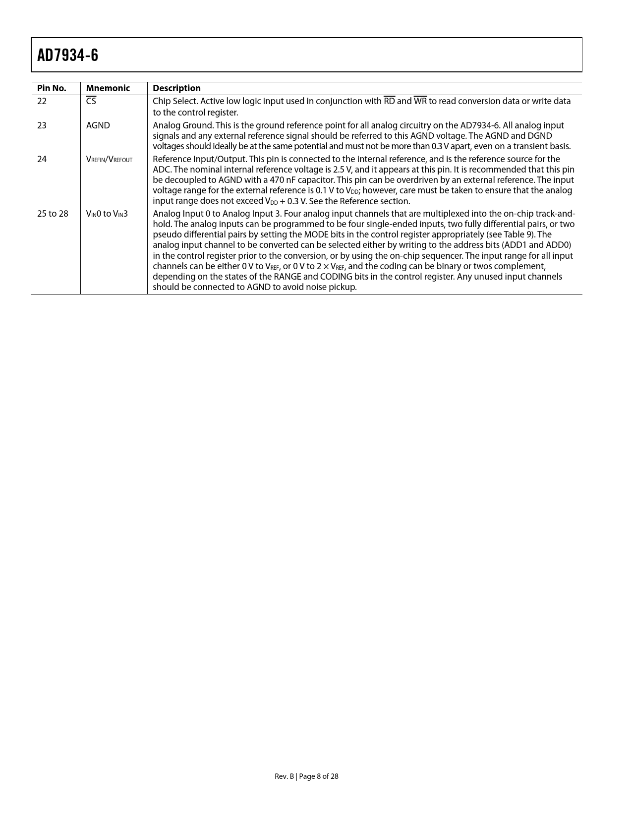 link to page 21 link to page 14 AD7934-6Pin No.MnemonicDescription 22 CS Chip Select. Active low logic input used in conjunction with RD and WR to read conversion data or write data to the control register. 23 AGND Analog Ground. This is the ground reference point for all analog circuitry on the AD7934-6. All analog input signals and any external reference signal should be referred to this AGND voltage. The AGND and DGND voltages should ideally be at the same potential and must not be more than 0.3 V apart, even on a transient basis. 24 VREFIN/VREFOUT Reference Input/Output. This pin is connected to the internal reference, and is the reference source for the ADC. The nominal internal reference voltage is 2.5 V, and it appears at this pin. It is recommended that this pin be decoupled to AGND with a 470 nF capacitor. This pin can be overdriven by an external reference. The input voltage range for the external reference is 0.1 V to VDD; however, care must be taken to ensure that the analog input range does not exceed VDD + 0.3 V. See the Reference section. 25 to 28 VIN0 to VIN3 Analog Input 0 to Analog Input 3. Four analog input channels that are multiplexed into the on-chip track-and- hold. The analog inputs can be programmed to be four single-ended inputs, two fully differential pairs, or two pseudo differential pairs by setting the MODE bits in the control register appropriately (see Table 9). The analog input channel to be converted can be selected either by writing to the address bits (ADD1 and ADD0) in the control register prior to the conversion, or by using the on-chip sequencer. The input range for all input channels can be either 0 V to VREF, or 0 V to 2 × VREF, and the coding can be binary or twos complement, depending on the states of the RANGE and CODING bits in the control register. Any unused input channels should be connected to AGND to avoid noise pickup. Rev. B | Page 8 of 28 Document Outline FEATURES FUNCTIONAL BLOCK DIAGRAM GENERAL DESCRIPTION PRODUCT HIGHLIGHTS REVISION HISTORY SPECIFICATIONS TIMING SPECIFICATIONS ABSOLUTE MAXIMUM RATINGS ESD CAUTION PIN CONFIGURATION AND FUNCTION DESCRIPTIONS TYPICAL PERFORMANCE CHARACTERISTICS TERMINOLOGY CONTROL REGISTER SEQUENCER OPERATION Writing to the Control Register to Program the Sequencer CIRCUIT INFORMATION CONVERTER OPERATION ADC TRANSFER FUNCTION TYPICAL CONNECTION DIAGRAM ANALOG INPUT STRUCTURE ANALOG INPUT CONFIGURATIONS Single-Ended Mode Differential Mode Driving Differential Inputs Using an Op Amp Pair Pseudo Differential Mode ANALOG INPUT SELECTION Traditional Multichannel Operation (SEQ0 = SEQ1 = 0) Using the Sequencer: Consecutive Sequence (SEQ0 = SEQ1 = 1) REFERENCE Digital Inputs VDRIVE Input PARALLEL INTERFACE Reading Data from the AD7934-6 Writing Data to the AD7934-6 POWER MODES OF OPERATION Normal Mode (PM1 = PM0 = 0) Autoshutdown Mode (PM1 = 0; PM0 = 1) Autostandby Mode (PM1 = 1; PM0 = 0) Full Shutdown Mode (PM1 = 1; PM0 = 1) POWER vs. THROUGHPUT RATE MICROPROCESSOR INTERFACING AD7934-6 to ADSP-21xx Interface AD7934-6 to ADSP-21065L Interface AD7934-6 to TMS32020, TMS320C25, and TMS320C5x Interface AD7934-6 to 80C186 Interface APPLICATION HINTS GROUNDING AND LAYOUT EVALUATING THE AD7934-6 PERFORMANCE OUTLINE DIMENSIONS ORDERING GUIDE