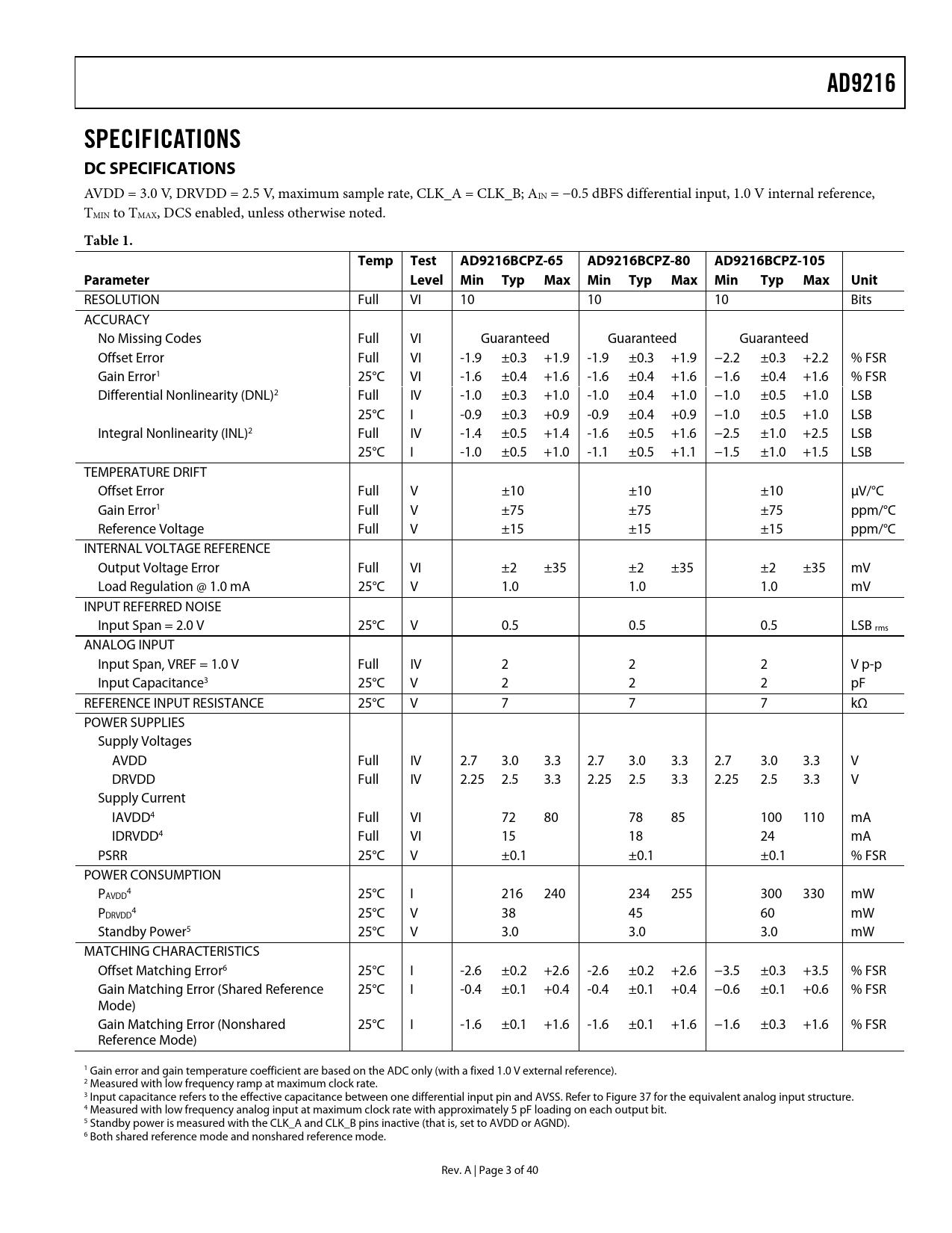 DC SPECIFICATIONS. Table 1. Temp. Test. AD9216BCPZ-65. AD9216BCPZ-80. AD9216BCPZ-105. Parameter. Level. Min. Typ. Max. Unit