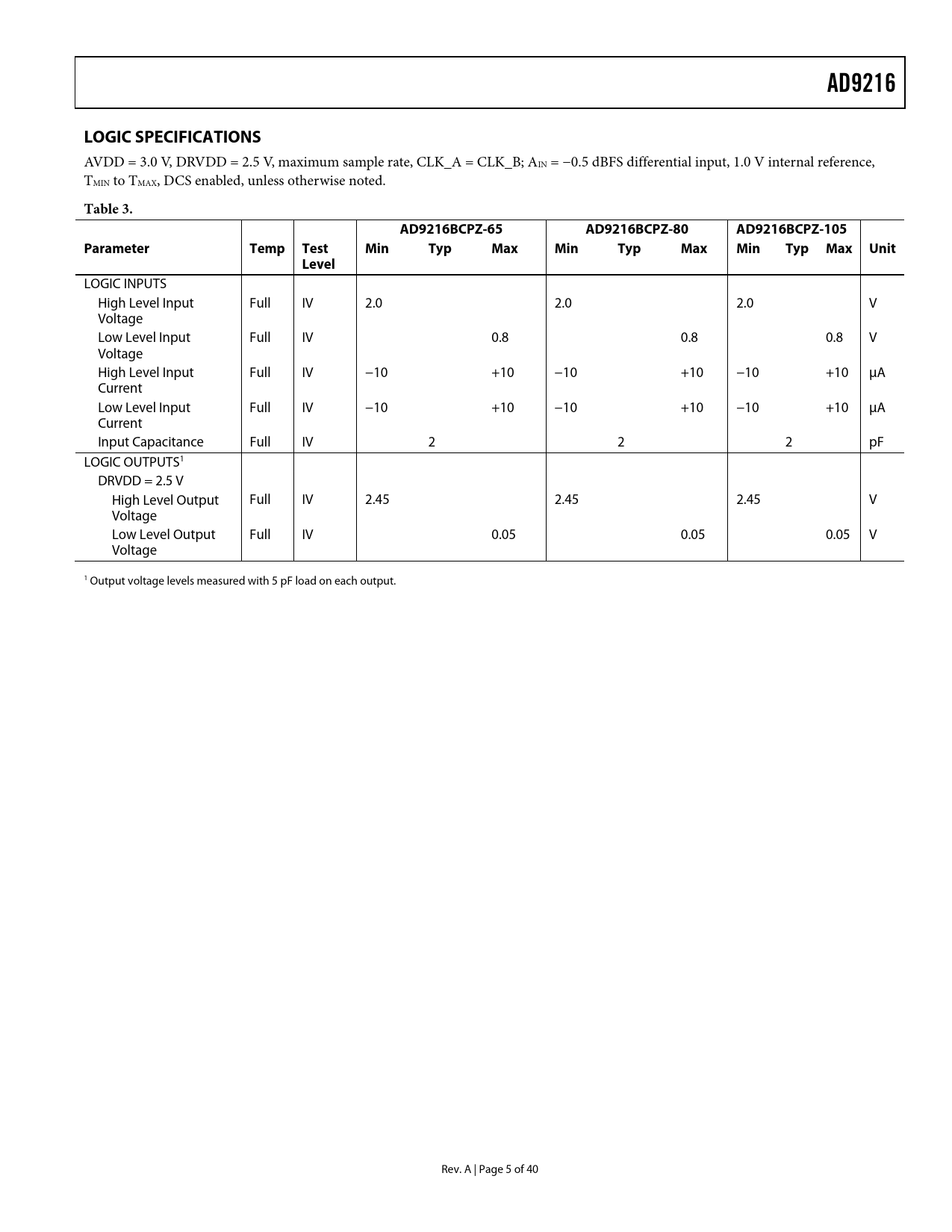 LOGIC SPECIFICATIONS. Table 3. AD9216BCPZ-65. AD9216BCPZ-80. AD9216BCPZ-105. Parameter. Temp. Test. Min. Typ. Max. Unit. Level