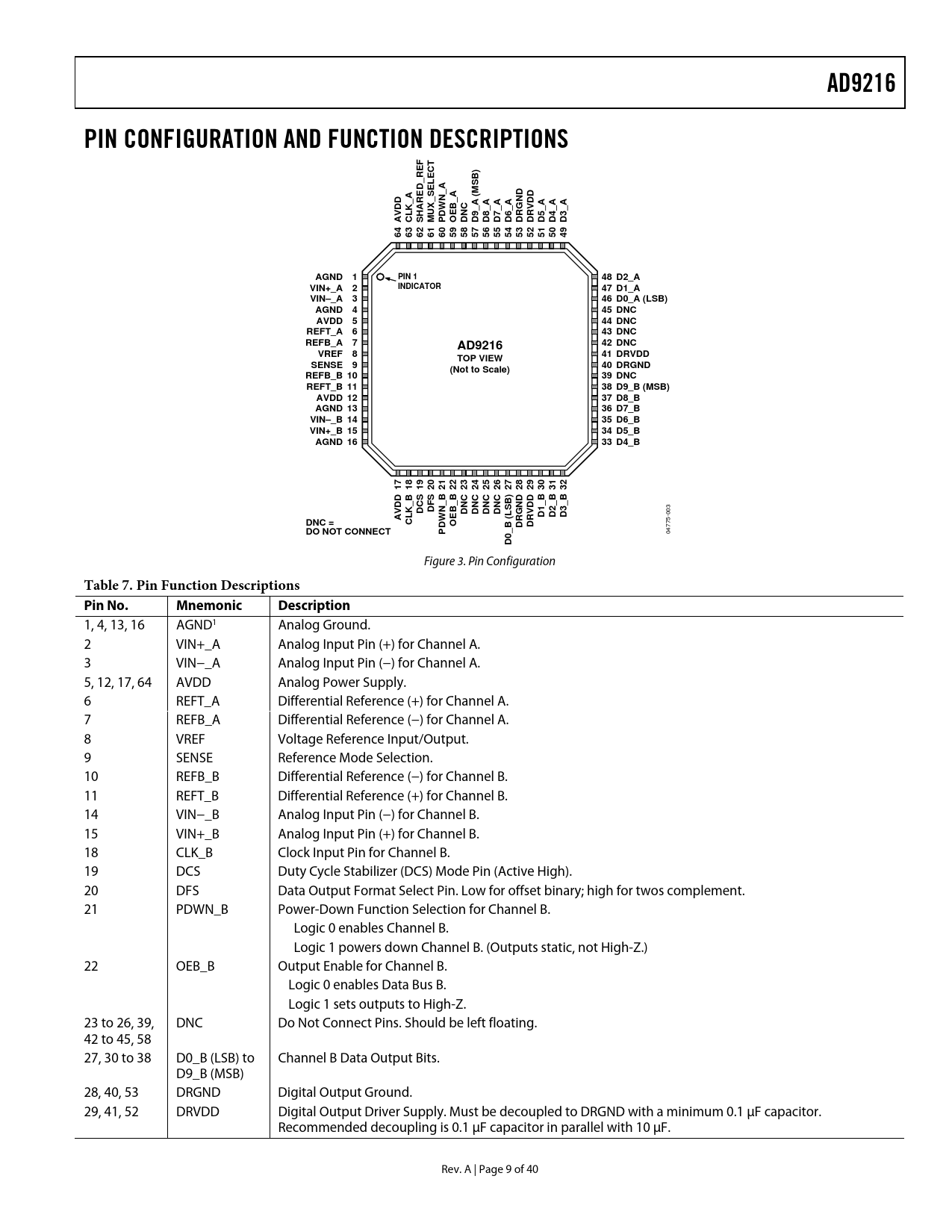 F T ) RE SB D_ M A _A ( DD DD X_SELEC WN HARE U 9_A 8_A 7_A 6_A 5_A 4_A 3_A AV CLK_ S M PD OEB_A DNC D D D D DRGND DRV D D D 64 63 62 61 60 59 58 57 56 55 54 53 52 51 50 49 AGND 1 PIN 1 48 D2_A INDICATOR VIN+_A 2 47 D1_A VIN–_A 3 46 D0_A (LSB) AGND 4 45 DNC AVDD 5 44 DNC REFT_A 6 43 DNC REFB_A 7 42 DNC AD9216 VREF 8 41 DRVDD TOP VIEW SENSE 9 40 DRGND (Not to Scale) REFB_B 10 39 DNC REFT_B 11 38 D9_B (MSB) AVDD 12 37 D8_B AGND 13 36 D7_B VIN–_B 14 35 D6_B VIN+_B 15 34 D5_B AGND 16 33 D4_B 17 18 19 20 21 22 23 24 25 26 27 28 29 30 31 32 B ) DD _B DD DCS DFS DNC DNC DNC DNC SB 1_B 2_B 3_B L AV D D D DNC = CLK_ WN ( OEB_B DRGND DRV DO NOT CONNECT PD 0_B
