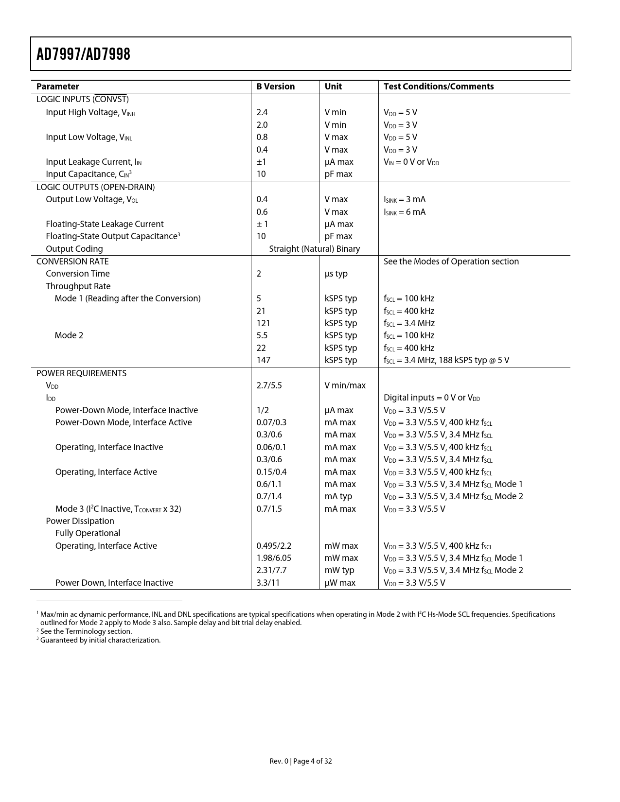link to page 28 AD7997/AD7998ParameterB VersionUnitTest Conditions/Comments LOGIC INPUTS (CONVST) Input High Voltage, VINH 2.4 V min VDD = 5 V 2.0 V min VDD = 3 V Input Low Voltage, VINL 0.8 V max VDD = 5 V 0.4 V max VDD = 3 V Input Leakage Current, IIN ±1 µA max VIN = 0 V or VDD Input Capacitance, C 3 IN 10 pF max LOGIC OUTPUTS (OPEN-DRAIN) Output Low Voltage, VOL 0.4 V max ISINK = 3 mA 0.6 V max ISINK = 6 mA Floating-State Leakage Current ± 1 µA max Floating-State Output Capacitance3 10 pF max Output Coding Straight (Natural) Binary CONVERSION RATE See the Modes of Operation section Conversion Time 2 µs typ Throughput Rate Mode 1 (Reading after the Conversion) 5 kSPS typ fSCL = 100 kHz 21 kSPS typ fSCL = 400 kHz 121 kSPS typ fSCL = 3.4 MHz Mode 2 5.5 kSPS typ fSCL = 100 kHz 22 kSPS typ fSCL = 400 kHz 147 kSPS typ fSCL = 3.4 MHz, 188 kSPS typ @ 5 V POWER REQUIREMENTS VDD 2.7/5.5 V min/max IDD Digital inputs = 0 V or VDD Power-Down Mode, Interface Inactive 1/2 µA max VDD = 3.3 V/5.5 V Power-Down Mode, Interface Active 0.07/0.3 mA max VDD = 3.3 V/5.5 V, 400 kHz fSCL 0.3/0.6 mA max VDD = 3.3 V/5.5 V, 3.4 MHz fSCL Operating, Interface Inactive 0.06/0.1 mA max VDD = 3.3 V/5.5 V, 400 kHz fSCL 0.3/0.6 mA max VDD = 3.3 V/5.5 V, 3.4 MHz fSCL Operating, Interface Active 0.15/0.4 mA max VDD = 3.3 V/5.5 V, 400 kHz fSCL 0.6/1.1 mA max VDD = 3.3 V/5.5 V, 3.4 MHz fSCL Mode 1 0.7/1.4 mA typ VDD = 3.3 V/5.5 V, 3.4 MHz fSCL Mode 2 Mode 3 (I2C Inactive, TCONVERT x 32) 0.7/1.5 mA max VDD = 3.3 V/5.5 V Power Dissipation Fully Operational Operating, Interface Active 0.495/2.2 mW max VDD = 3.3 V/5.5 V, 400 kHz fSCL 1.98/6.05 mW max VDD = 3.3 V/5.5 V, 3.4 MHz fSCL Mode 1 2.31/7.7 mW typ VDD = 3.3 V/5.5 V, 3.4 MHz fSCL Mode 2 Power Down, Interface Inactive 3.3/11 µW max VDD = 3.3 V/5.5 V 1 Max/min ac dynamic performance, INL and DNL specifications are typical specifications when operating in Mode 2 with I2C Hs-Mode SCL frequencies. Specifications outlined for Mode 2 apply to Mode 3 also. Sample delay and bit trial delay enabled. 2 See the Terminology section. 3 Guaranteed by initial characterization. Rev. 0 | Page 4 of 32 Document Outline FEATURES GENERAL DESCRIPTION FUNCTIONAL BLOCK DIAGRAM PRODUCT HIGHLIGHTS AD7997 SPECIFICATIONS AD7998 SPECIFICATIONS I2C TIMING SPECIFICATIONS ABSOLUTE MAXIMUM RATINGS ESD CAUTION PIN CONFIGURATION AND PIN FUNCTION DESCRIPTIONS TERMINOLOGY TYPICAL PERFORMANCE CHARACTERISTICS CIRCUIT INFORMATION CONVERTER OPERATION TYPICAL CONNECTION DIAGRAM ANALOG INPUT INTERNAL REGISTER STRUCTURE ADDRESS POINTER REGISTER CONFIGURATION REGISTER CONVERSION RESULT REGISTER LIMIT REGISTERS DATAHIGH Register CH1/CH2/CH3/CH4 DATALOW Register CH1/CH2/CH3/CH4 Hysteresis Register (CH1/CH2/CH3/CH4) Using the Limit Registers to Store Min/Max Conversion Result ALERT STATUS REGISTER (CH1 TO CH4) CYCLE TIMER REGISTER SAMPLE DELAY AND BIT TRIAL DELAY SERIAL INTERFACE SERIAL BUS ADDRESS WRITING TO THE AD7997/AD7998 WRITING TO THE ADDRESS POINTER REGISTER FOR A SUBSEQUENT REA WRITING A SINGLE BYTE OF DATA TO THE ALERT STATUS REGISTER O WRITING TWO BYTES OF DATA TO A LIMIT, HYSTERESIS, OR CONFIGU READING DATA FROM THE AD7997/AD7998 ALERT/BUSY PIN SMBus ALERT BUSY PLACING THE AD7997-1/AD7998-1 INTOHIGH SPEED MODE THE ADDRESS SELECT (AS) PIN MODES OF OPERATION MODE 1—USING THE PIN MODE 2 – COMMAND MODE MODE 3—AUTOMATIC CYCLE INTERVAL MODE OUTLINE DIMENSIONS ORDERING GUIDE RELATED PARTS IN I2C-COMPATIBLE ADC PRODUCT FAMILY