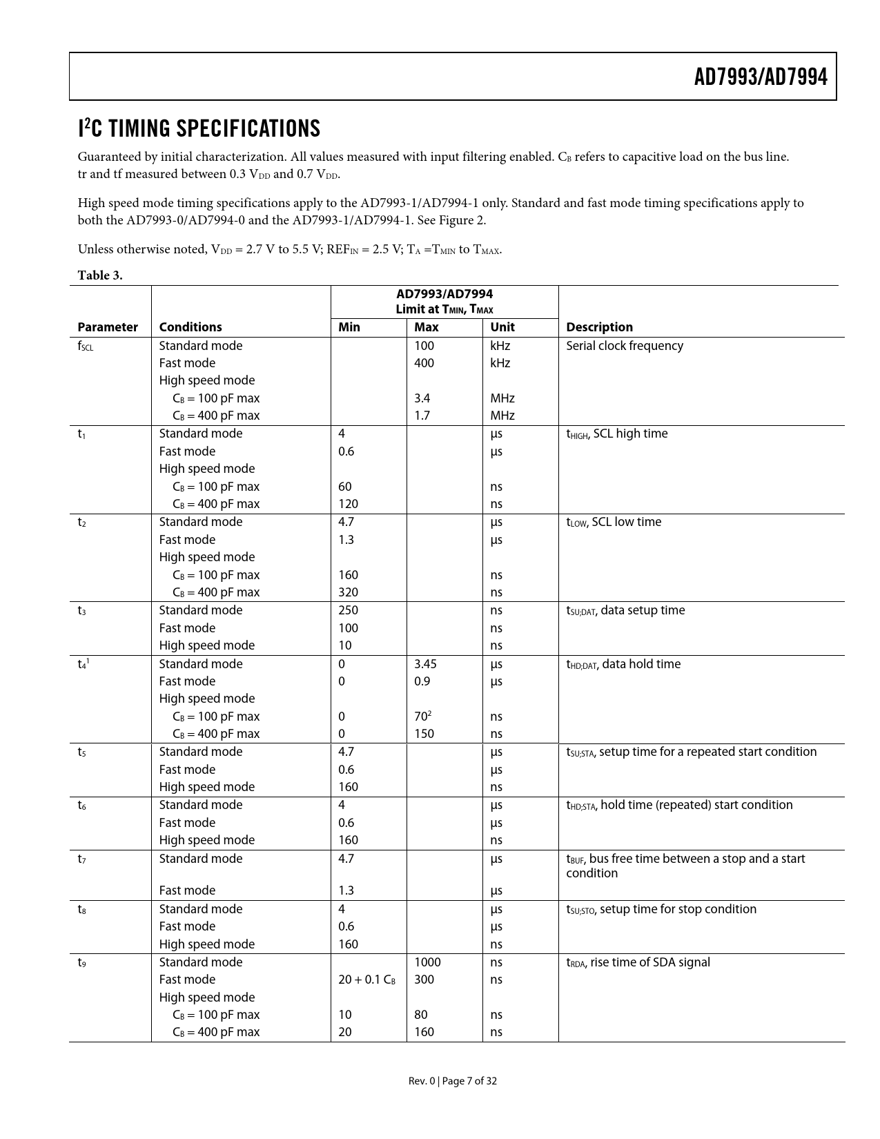 AD7993/AD7994 I2C TIMING SPECIFICATIONS Table 3 Limit at TMIN, TMAX Parameter Conditions Min Max Unit Description