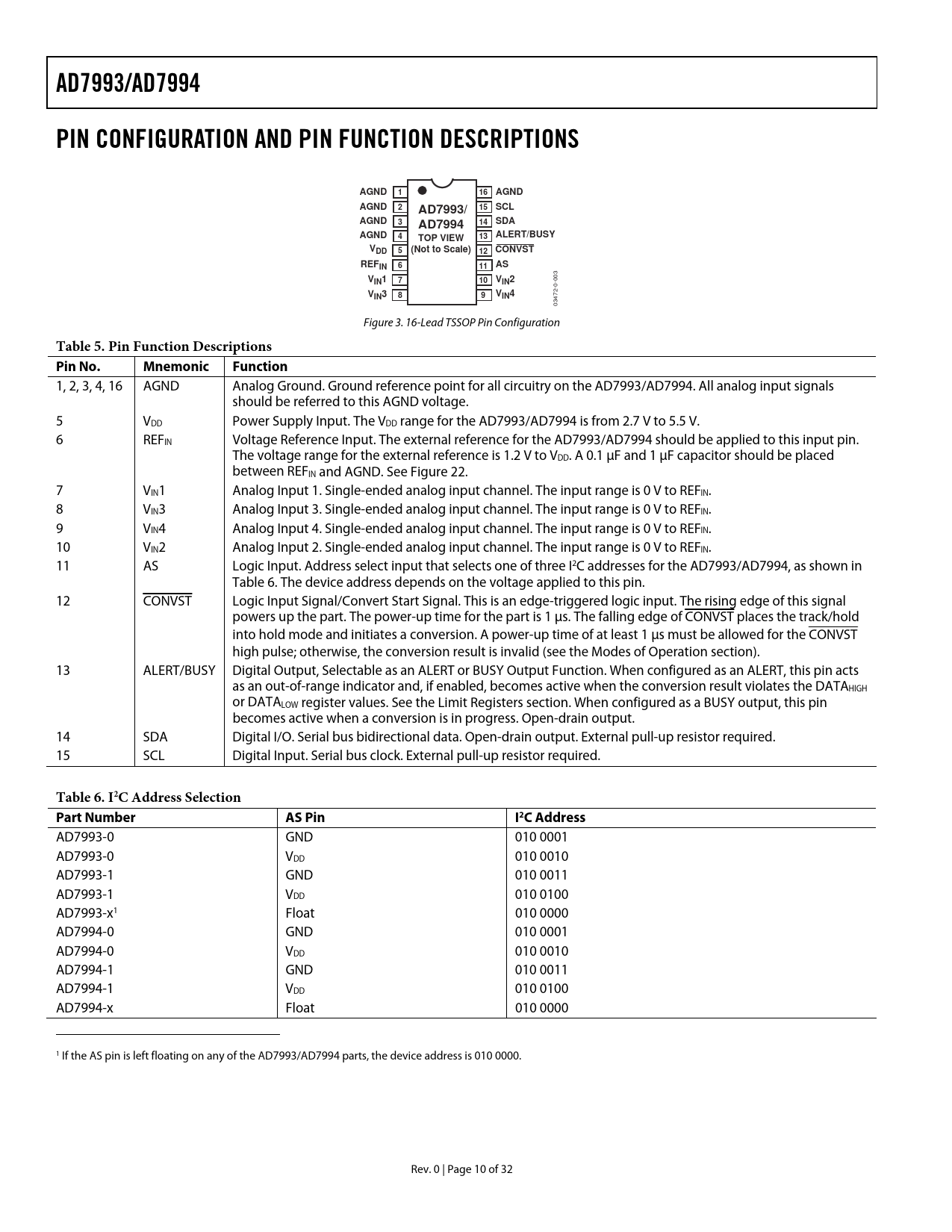 link to page 16 link to page 10 link to page 28 link to page 20 link to page 10 link to page 31 AD7993/AD7994PIN CONFIGURATION AND PIN FUNCTION DESCRIPTIONSAGND116AGNDAGND2AD7993/15SCLAGND3AD799414SDAAGND4TOP VIEW13ALERT/BUSYVDD5(Not to Scale) 12 CONVSTREFIN611ASVIN1710VIN2VIN389VIN4 03472-0-003 Figure 3. 16-Lead TSSOP Pin Configuration Table 5. Pin Function Descriptions Pin No.MnemonicFunction 1, 2, 3, 4, 16 AGND Analog Ground. Ground reference point for all circuitry on the AD7993/AD7994. All analog input signals should be referred to this AGND voltage. 5 VDD Power Supply Input. The VDD range for the AD7993/AD7994 is from 2.7 V to 5.5 V. 6 REFIN Voltage Reference Input. The external reference for the AD7993/AD7994 should be applied to this input pin. The voltage range for the external reference is 1.2 V to VDD. A 0.1 µF and 1 µF capacitor should be placed between REFIN and AGND. See Figure 22. 7 VIN1 Analog Input 1. Single-ended analog input channel. The input range is 0 V to REFIN. 8 VIN3 Analog Input 3. Single-ended analog input channel. The input range is 0 V to REFIN. 9 VIN4 Analog Input 4. Single-ended analog input channel. The input range is 0 V to REFIN. 10 VIN2 Analog Input 2. Single-ended analog input channel. The input range is 0 V to REFIN. 11 AS Logic Input. Address select input that selects one of three I2C addresses for the AD7993/AD7994, as shown in Table 6. The device address depends on the voltage applied to this pin. 12 CONVST Logic Input Signal/Convert Start Signal. This is an edge-triggered logic input. The rising edge of this signal powers up the part. The power-up time for the part is 1 µs. The falling edge of CONVST places the track/hold into hold mode and initiates a conversion. A power-up time of at least 1 µs must be allowed for the CONVST high pulse; otherwise, the conversion result is invalid (see the Modes of Operation section). 13 ALERT/BUSY Digital Output, Selectable as an ALERT or BUSY Output Function. When configured as an ALERT, this pin acts as an out-of-range indicator and, if enabled, becomes active when the conversion result violates the DATAHIGH or DATALOW register values. See the Limit Registers section. When configured as a BUSY output, this pin becomes active when a conversion is in progress. Open-drain output. 14 SDA Digital I/O. Serial bus bidirectional data. Open-drain output. External pull-up resistor required. 15 SCL Digital Input. Serial bus clock. External pull-up resistor required. Table 6. I2C Address Selection Part NumberAS PinI2C Address AD7993-0 GND 010 0001 AD7993-0 VDD 010 0010 AD7993-1 GND 010 0011 AD7993-1 VDD 010 0100 AD7993-x1 Float 010 0000 AD7994-0 GND 010 0001 AD7994-0 VDD 010 0010 AD7994-1 GND 010 0011 AD7994-1 VDD 010 0100 AD7994-x Float 010 0000 1 1 If the AS pin is left floating on any of the AD7993/AD7994 parts, the device address is 010 0000. Rev. 0 | Page 10 of 32 Document Outline FEATURES GENERAL DESCRIPTION FUNCTIONAL BLOCK DIAGRAM PRODUCT HIGHLIGHTS AD7993 SPECIFICATIONS AD7994 SPECIFICATIONS I2C TIMING SPECIFICATIONS ABSOLUTE MAXIMUM RATINGS ESD CAUTION PIN CONFIGURATION AND PIN FUNCTION DESCRIPTIONS TERMINOLOGY TYPICAL PERFORMANCE CHARACTERISTICS CIRCUIT INFORMATION CONVERTER OPERATION TYPICAL CONNECTION DIAGRAM ANALOG INPUT INTERNAL REGISTER STRUCTURE ADDRESS POINTER REGISTER CONFIGURATION REGISTER CONVERSION RESULT REGISTER LIMIT REGISTERS ALERT STATUS REGISTER CYCLE TIMER REGISTER SAMPLE DELAY AND BIT TRIAL DELAY SERIAL INTERFACE SERIAL BUS ADDRESS WRITING TO THE AD7993/AD7994 WRITING TO THE ADDRESS POINTER REGISTER FOR A SUBSEQUENT REA WRITING A SINGLE BYTE OF DATA TO THE ALERT STATUS REGISTER O WRITING TWO BYTES OF DATA TO A LIMIT OR HYSTERESIS REGISTER READING DATA FROM THE AD7993/AD7994 ALERT/BUSY PIN SMBus ALERT BUSY PLACING THE AD7993-1/AD7994-1 INTO HIGH SPEED MODE THE ADDRESS SELECT (AS) PIN MODES OF OPERATION MODE 1—USING THE CONVST PIN MODE 2—COMMAND MODE MODE 3—AUTOMATIC CYCLE INTERVAL MODE OUTLINE DIMENSIONS ORDERING GUIDE RELATED PARTS IN I2C-COMPATIBLE ADC PRODUCT FAMILY