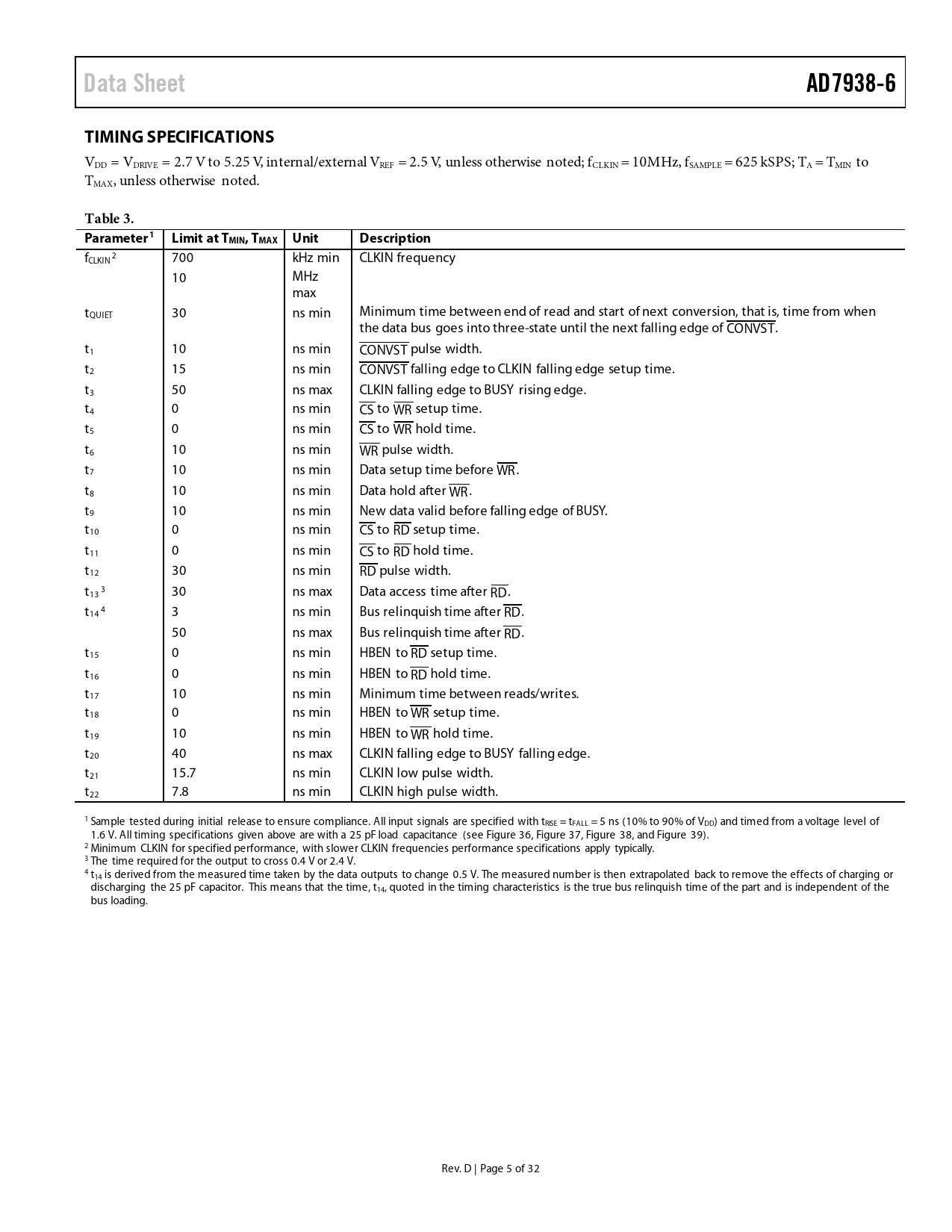 link to page 24 link to page 25 link to page 26 link to page 26 Data SheetAD7938-6TIMING SPECIFICATIONS VDD = VDRIVE = 2.7 V to 5.25 V, internal/external VREF = 2.5 V, unless otherwise noted; fCLKIN = 10MHz, fSAMPLE = 625 kSPS; TA = TMIN to TMAX, unless otherwise noted. Table 3. Parameter1 Limit at TMIN, TMAX UnitDescription f 2 CLKIN 700 kHz min CLKIN frequency 10 MHz max tQUIET 30 ns min Minimum time between end of read and start of next conversion, that is, time from when the data bus goes into three-state until the next falling edge of CONVST. t1 10 ns min CONVST pulse width. t2 15 ns min CONVST falling edge to CLKIN falling edge setup time. t3 50 ns max CLKIN falling edge to BUSY rising edge. t4 0 ns min CS to WR setup time. t5 0 ns min CS to WR hold time. t6 10 ns min WR pulse width. t7 10 ns min Data setup time before WR. t8 10 ns min Data hold after WR. t9 10 ns min New data valid before falling edge of BUSY. t10 0 ns min CS to RD setup time. t11 0 ns min CS to RD hold time. t12 30 ns min RD pulse width. t 3 13 30 ns max Data access time after RD. t 4 14 3 ns min Bus relinquish time after RD. 50 ns max Bus relinquish time after RD. t15 0 ns min HBEN to RD setup time. t16 0 ns min HBEN to RD hold time. t17 10 ns min Minimum time between reads/writes. t18 0 ns min HBEN to WR setup time. t19 10 ns min HBEN to WR hold time. t20 40 ns max CLKIN falling edge to BUSY falling edge. t21 15.7 ns min CLKIN low pulse width. t22 7.8 ns min CLKIN high pulse width. 1 Sample tested during initial release to ensure compliance. All input signals are specified with tRISE = tFALL = 5 ns (10% to 90% of VDD) and timed from a voltage level of 1.6 V. All timing specifications given above are with a 25 pF load capacitance (see Figure 36, Figure 37, Figure 38, and Figure 39). 2 Minimum CLKIN for specified performance, with slower CLKIN frequencies performance specifications apply typical y. 3 The time required for the output to cross 0.4 V or 2.4 V. 4 t14 is derived from the measured time taken by the data outputs to change 0.5 V. The measured number is then extrapolated back to remove the effects of charging or discharging the 25 pF capacitor. This means that the time, t14, quoted in the timing characteristics is the true bus relinquish time of the part and is independent of the bus loading. Rev. D | Page 5 of 32 Document Outline FEATURES FUNCTIONAL BLOCK DIAGRAM GENERAL DESCRIPTION PRODUCT HIGHLIGHTS REVISION HISTORY SPECIFICATIONS TIMING SPECIFICATIONS ABSOLUTE MAXIMUM RATINGS ESD CAUTION PIN CONFIGURATION AND FUNCTION DESCRIPTIONS TYPICAL PERFORMANCE CHARACTERISTICS TERMINOLOGY ON-CHIP REGISTERS CONTROL REGISTER SEQUENCER OPERATION Writing to the Control Register to Program the Sequencer SHADOW REGISTER CIRCUIT INFORMATION CONVERTER OPERATION ADC TRANSFER FUNCTION TYPICAL CONNECTION DIAGRAM ANALOG INPUT STRUCTURE ANALOG INPUTS Single-Ended Mode Differential Mode Driving Differential Inputs Using an Op Amp Pair Pseudo Differential Mode ANALOG INPUT SELECTION Traditional Multichannel Operation (SEQ = 0, SHDW = 0) Using the Sequencer: Programmable Sequence (SEQ = 0, SHDW = 1 ) Consecutive Sequence (SEQ = 1, SHDW = 1) REFERENCE Digital Inputs VDRIVE Input PARALLEL INTERFACE Reading Data from the AD7938-6 Writing Data to the AD7938-6 POWER MODES OF OPERATION Normal Mode (PM1 = PM0 = 0) Autoshutdown (PM1 = 0; PM0 = 1) Autostandby (PM1 = 1; PM0 = 0) Full Shutdown Mode (PM1 =1; PM0 = 1) POWER vs. THROUGHPUT RATE MICROPROCESSOR INTERFACING AD7938-6 to ADSP-21xx Interface AD7938-6 to ADSP-21065L Interface AD7938-6 to TMS32020, TMS320C25, and TMS320C5x Interface AD7938-6 to 80C186 Interface APPLICATION HINTS GROUNDING AND LAYOUT PCB DESIGN GUIDELINES FOR CHIP SCALE PACKAGE EVALUATING THE AD7938-6 PERFORMANCE OUTLINE DIMENSIONS ORDERING GUIDE