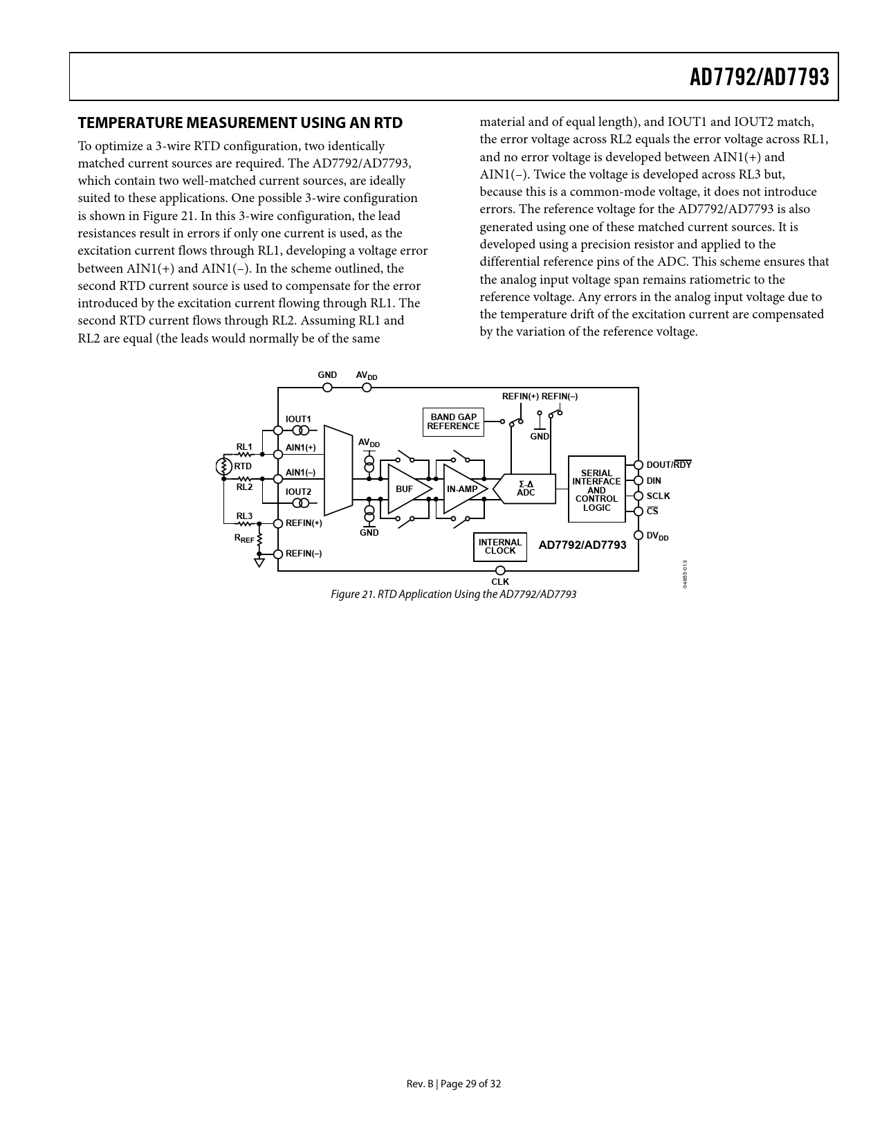 link to page 29 AD7792/AD7793TEMPERATURE MEASUREMENT USING AN RTD material and of equal length), and IOUT1 and IOUT2 match, To optimize a 3-wire RTD configuration, two identically the error voltage across RL2 equals the error voltage across RL1, matched current sources are required. The AD7792/AD7793, and no error voltage is developed between AIN1(+) and which contain two well-matched current sources, are ideally AIN1(–). Twice the voltage is developed across RL3 but, suited to these applications. One possible 3-wire configuration because this is a common-mode voltage, it does not introduce is shown in Figure 21. In this 3-wire configuration, the lead errors. The reference voltage for the AD7792/AD7793 is also resistances result in errors if only one current is used, as the generated using one of these matched current sources. It is excitation current flows through RL1, developing a voltage error developed using a precision resistor and applied to the between AIN1(+) and AIN1(–). In the scheme outlined, the differential reference pins of the ADC. This scheme ensures that second RTD current source is used to compensate for the error the analog input voltage span remains ratiometric to the introduced by the excitation current flowing through RL1. The reference voltage. Any errors in the analog input voltage due to second RTD current flows through RL2. Assuming RL1 and the temperature drift of the excitation current are compensated RL2 are equal (the leads would normally be of the same by the variation of the reference voltage. GNDAVDDREFIN(+) REFIN(–)IOUT1BAND GAPREFERENCEGNDAVDDRL1AIN1(+)RTDDOUT/RDYAIN1(–)SERIALINTERFACEDINRL2BUFIN-AMPΣ-ΔIOUT2ANDADCSCLKCONTROLLOGICCSRL3REFIN(+)GNDDVRDDREFINTERNALAD7792/AD7793REFIN(–)CLOCK 13 0 5- 85 CLK 04 Figure 21. RTD Application Using the AD7792/AD7793 Rev. B | Page 29 of 32 Document Outline FEATURES APPLICATIONS FUNCTIONAL BLOCK DIAGRAM GENERAL DESCRIPTION TABLE OF CONTENTS REVISION HISTORY SPECIFICATIONS TIMING CHARACTERISTICS TIMING DIAGRAMS ABSOLUTE MAXIMUM RATINGS ESD CAUTION PIN CONFIGURATION AND FUNCTION DESCRIPTIONS OUTPUT NOISE AND RESOLUTION SPECIFICATIONS EXTERNAL REFERENCE INTERNAL REFERENCE TYPICAL PERFORMANCE CHARACTERISTICS ON-CHIP REGISTERS COMMUNICATIONS REGISTER RS2, RS1, RS0 = 0, 0, 0 STATUS REGISTER RS2, RS1, RS0 = 0, 0, 0; Power-On/Reset = 0x80 (AD7792)/0x88 (AD7793) MODE REGISTER RS2, RS1, RS0 = 0, 0, 1; Power-On/Reset = 0x000A CONFIGURATION REGISTER RS2, RS1, RS0 = 0, 1, 0; Power-On/Reset = 0x0710 DATA REGISTER RS2, RS1, RS0 = 0, 1, 1; Power-On/Reset = 0x0000(00) ID REGISTER RS2, RS1, RS0 = 1, 0, 0; Power-On/Reset = 0xXA (AD7792)/0xXB (AD7793) IO REGISTER RS2, RS1, RS0 = 1, 0, 1; Power-On/Reset = 0x00 OFFSET REGISTER RS2, RS1, RS0 = 1, 1, 0; Power-On/Reset = 0x8000 (AD7792)/0x800000 (AD7793) FULL-SCALE REGISTER RS2, RS1, RS0 = 1, 1, 1; Power-On/Reset = 0x5XXX (AD7792)/0x5XXX00 (AD7793) ADC CIRCUIT INFORMATION OVERVIEW DIGITAL INTERFACE Single Conversion Mode Continuous Conversion Mode Continuous Read CIRCUIT DESCRIPTION ANALOG INPUT CHANNEL INSTRUMENTATION AMPLIFIER BIPOLAR/UNIPOLAR CONFIGURATION DATA OUTPUT CODING BURNOUT CURRENTS EXCITATION CURRENTS BIAS VOLTAGE GENERATOR REFERENCE RESET AVDD MONITOR CALIBRATION GROUNDING AND LAYOUT APPLICATIONS INFORMATION TEMPERATURE MEASUREMENT USING A THERMOCOUPLE TEMPERATURE MEASUREMENT USING AN RTD OUTLINE DIMENSIONS ORDERING GUIDE