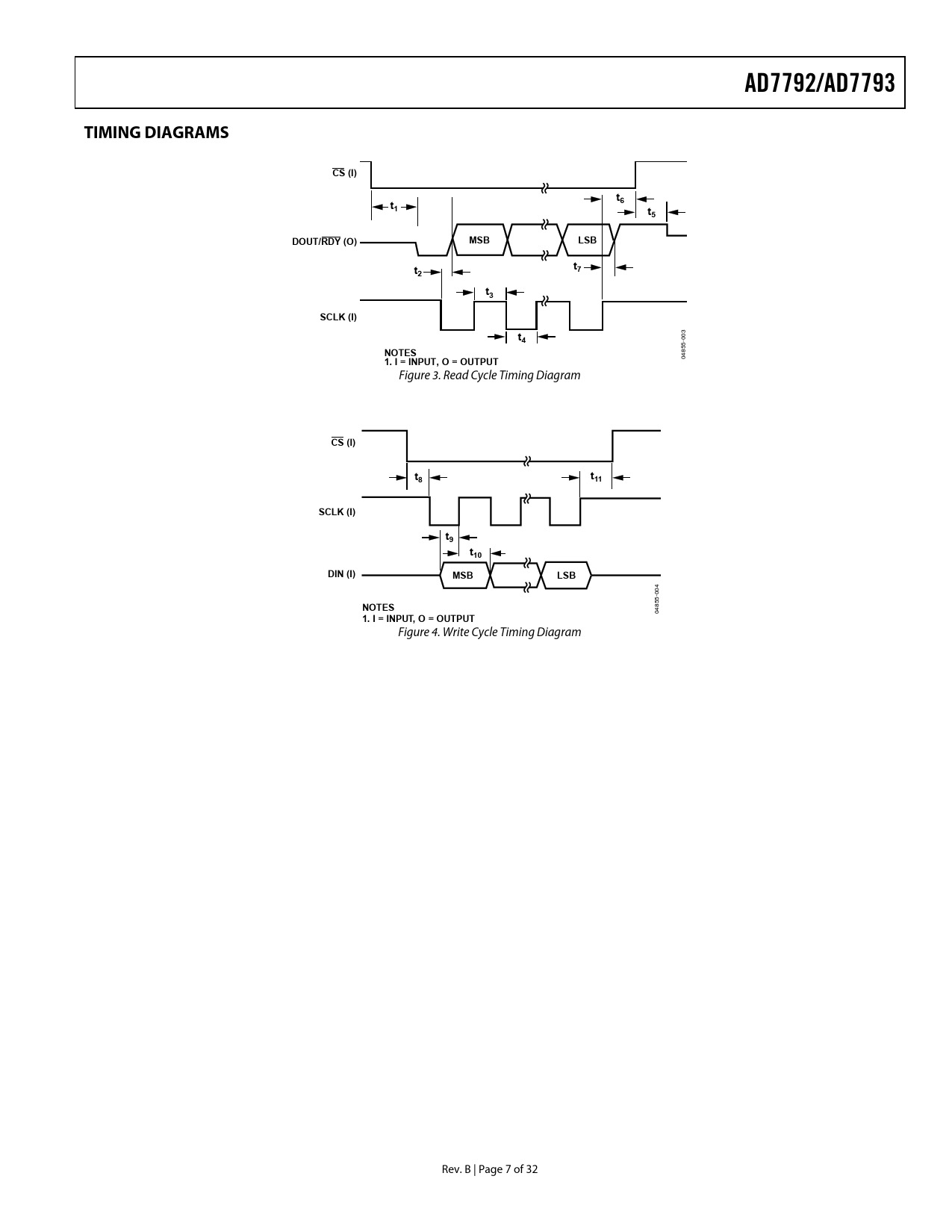 AD7792/AD7793. TIMING DIAGRAMS. CS (I). DOUT/RDY (O). MSB. LSB. SCLK (I). NOTES. 1. I = INPUT, O = OUTPUT. t11. t10. DIN (I)