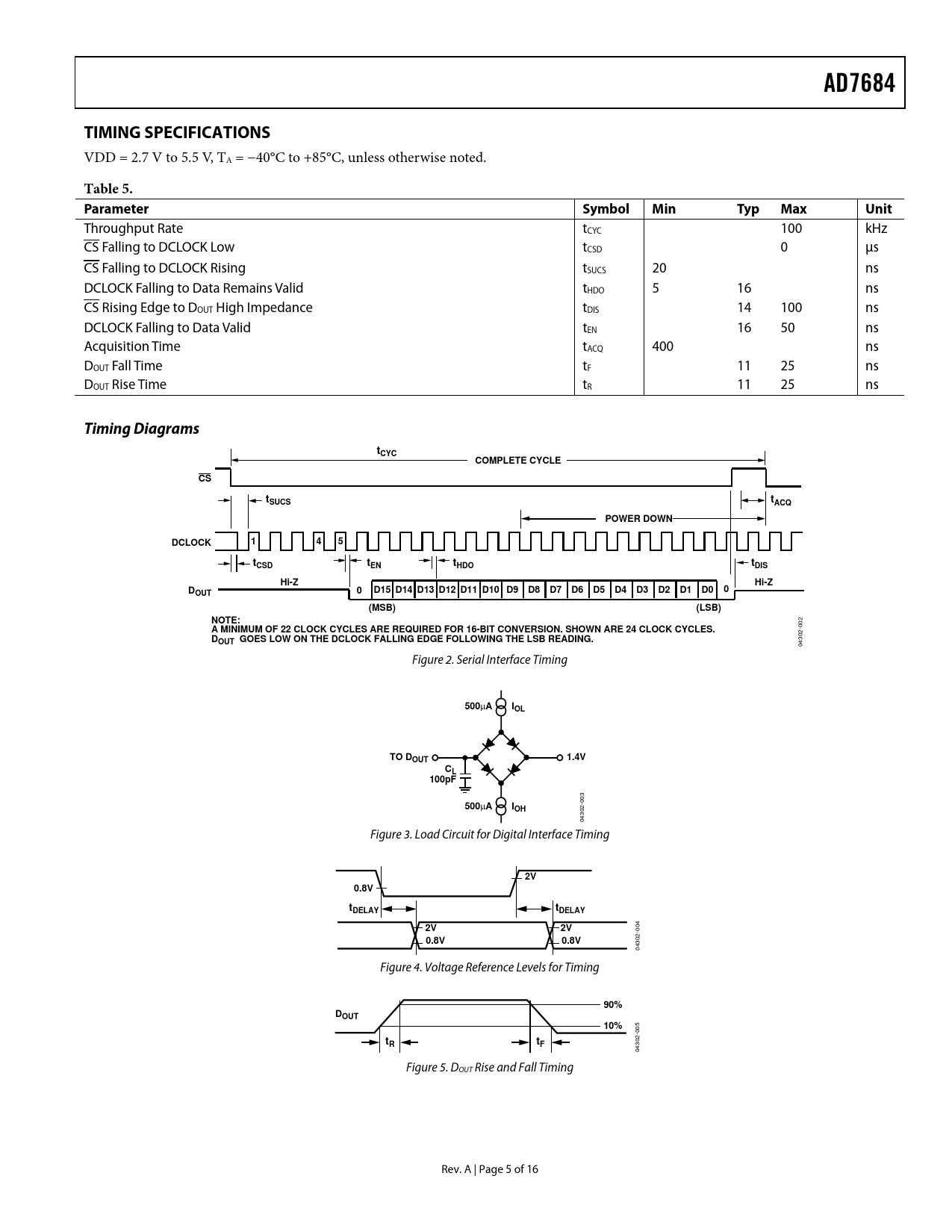 Pages / Page17 / 6 — AD7684. TIMING SPECIFICATIONS. Table 5. Parameter Symbol. Min. Typ. Max. …