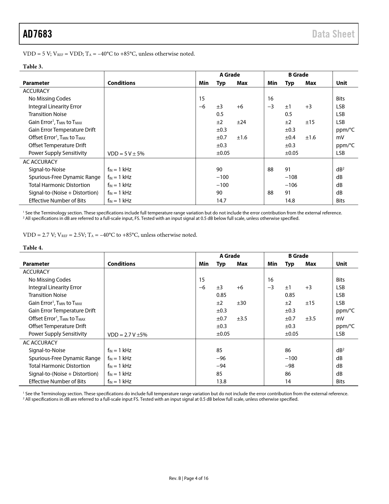 AD7683 Data Sheet Table 3 A Grade B Grade Parameter Conditions Min Typ Max Unit Table 4