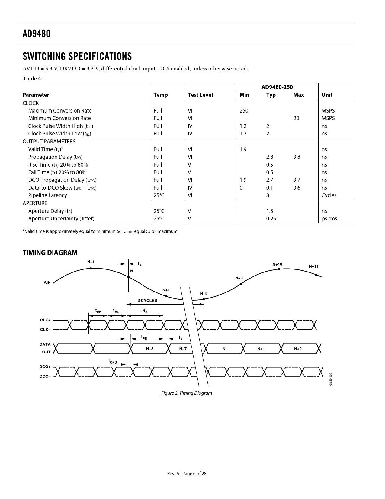 link to page 7 AD9480SWITCHING SPECIFICATIONS AVDD = 3.3 V, DRVDD = 3.3 V, differential clock input, DCS enabled, unless otherwise noted. Table 4.AD9480-250Parameter TempTestLevelMinTypMaxUnit CLOCK Maximum Conversion Rate Full VI 250 MSPS Minimum Conversion Rate Full VI 20 MSPS Clock Pulse Width High (tEH) Full IV 1.2 2 ns Clock Pulse Width Low (tEL) Full IV 1.2 2 ns OUTPUT PARAMETERS Valid Time (tV)1 Full VI 1.9 ns Propagation Delay (tPD) Full VI 2.8 3.8 ns Rise Time (tR) 20% to 80% Full V 0.5 ns Fall Time (tF) 20% to 80% Full V 0.5 ns DCO Propagation Delay (tCPD) Full VI 1.9 2.7 3.7 ns Data-to-DCO Skew (tPD − tCPD) Full IV 0 0.1 0.6 ns Pipeline Latency 25°C VI 8 Cycles APERTURE Aperture Delay (tA) 25°C V 1.5 ns Aperture Uncertainty (Jitter) 25°C V 0.25 ps rms 1 Valid time is approximately equal to minimum tPD. CLOAD equals 5 pF maximum. TIMING DIAGRAMN–1tAN+10N+11NN+9AINN+1N+88 CYCLEStEHtEL1/fSCLK+CLK–tPDtVDATAN–8N–7NN+1N+2OUTtCPDDCO+DCO– 04619-002 Figure 2. Timing Diagram Rev. A | Page 6 of 28 Document Outline FEATURES APPLICATIONS FUNCTIONAL BLOCK DIAGRAM GENERAL DESCRIPTION PRODUCT HIGHLIGHTS TABLE OF CONTENTS REVISION HISTORY DC SPECIFICATIONS DIGITAL SPECIFICATIONS AC SPECIFICATIONS SWITCHING SPECIFICATIONS TIMING DIAGRAM ABSOLUTE MAXIMUM RATINGS EXPLANATION OF TEST LEVELS ESD CAUTION PIN CONFIGURATION AND FUNCTION DESCRIPTIONS TERMINOLOGY TYPICAL PERFORMANCE CHARACTERISTICS EQUIVALENT CIRCUITS APPLICATION NOTES CLOCKING THE AD9480 ANALOG INPUTS VOLTAGE REFERENCE Fixed Reference External Reference Programmable Reference DIGITAL OUTPUTS OUTPUT CODING INTERLEAVING TWO AD9480s DATA CLOCK OUT POWER-DOWN AD9480 EVALUATION BOARD POWER CONNECTOR ANALOG INPUTS GAIN OPTIONAL OPERATIONAL AMPLIFIER CLOCK OPTIONAL CLOCK BUFFER OPTIONAL XTAL VOLTAGE REFERENCE DATA OUTPUTS EVALUATION BOARD BILL OF MATERIALS (BOM) PCB SCHEMATICS PCB LAYERS OUTLINE DIMENSIONS ORDERING GUIDE