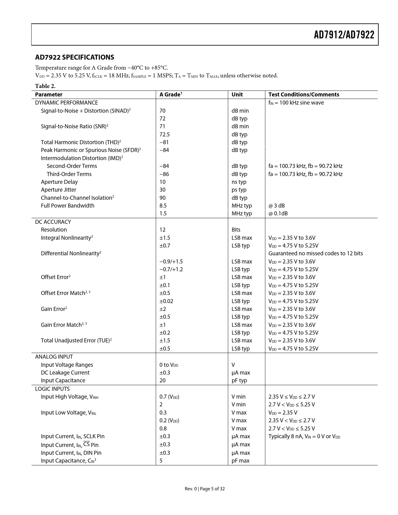 AD7912/AD7922. AD7922 SPECIFICATIONS. Table 2. Parameter A. Grade1. Unit. Test Conditions/Comments