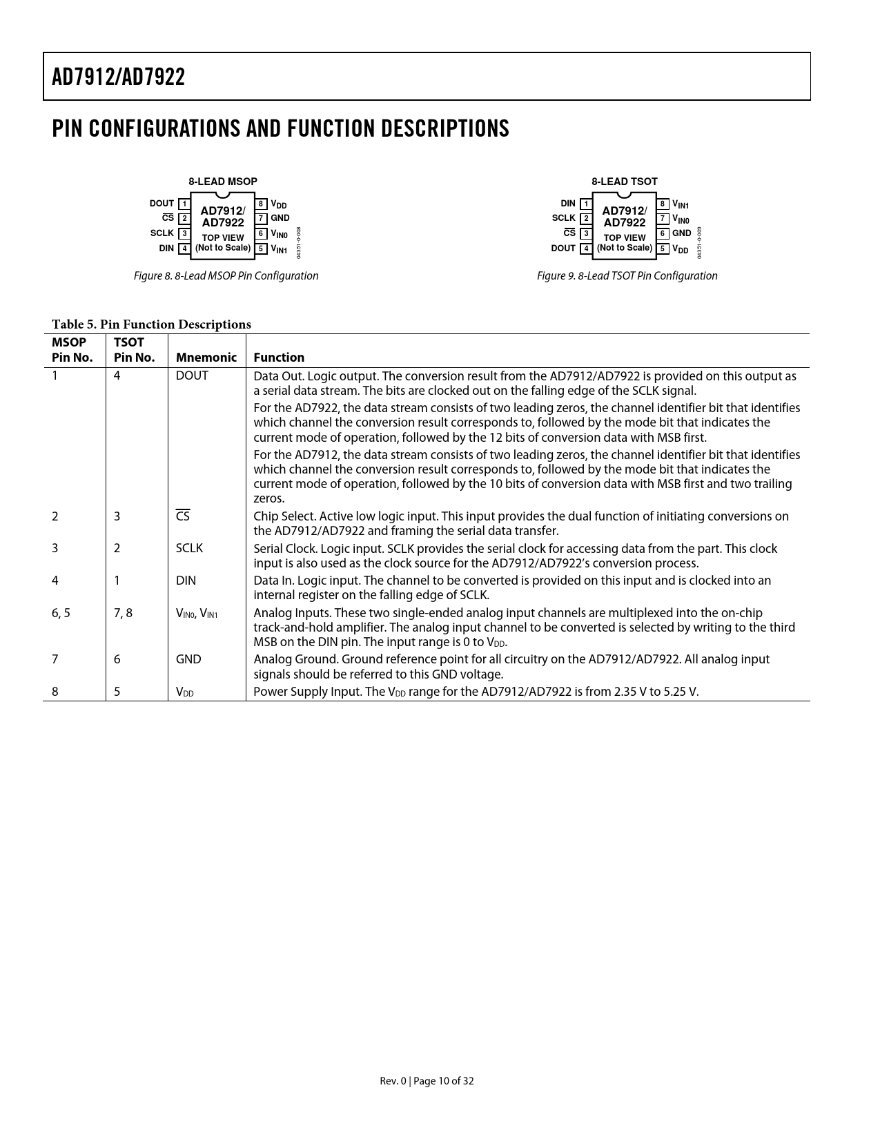 AD7912/AD7922PIN CONFIGURATIONS AND FUNCTION DESCRIPTIONS8-LEAD MSOP8-LEAD TSOTDOUT18VDDDIN18VAD7912/IN1AD7912/CS27GNDAD7922SCLK27VIN0AD7922SCLK36VIN0CS36GNDTOP VIEWTOP VIEWDIN4(Not to Scale)5VIN1DOUT4(Not to Scale)5VDD 04351-0-008 04351-0-009 Figure 8. 8-Lead MSOP Pin Configuration Figure 9. 8-Lead TSOT Pin Configuration Table 5. Pin Function Descriptions MSOPTSOTPin No.Pin No.Mnemonic Function 1 4 DOUT Data Out. Logic output. The conversion result from the AD7912/AD7922 is provided on this output as a serial data stream. The bits are clocked out on the falling edge of the SCLK signal. For the AD7922, the data stream consists of two leading zeros, the channel identifier bit that identifies which channel the conversion result corresponds to, followed by the mode bit that indicates the current mode of operation, followed by the 12 bits of conversion data with MSB first. For the AD7912, the data stream consists of two leading zeros, the channel identifier bit that identifies which channel the conversion result corresponds to, followed by the mode bit that indicates the current mode of operation, followed by the 10 bits of conversion data with MSB first and two trailing zeros. 2 3 CS Chip Select. Active low logic input. This input provides the dual function of initiating conversions on the AD7912/AD7922 and framing the serial data transfer. 3 2 SCLK Serial Clock. Logic input. SCLK provides the serial clock for accessing data from the part. This clock input is also used as the clock source for the AD7912/AD7922’s conversion process. 4 1 DIN Data In. Logic input. The channel to be converted is provided on this input and is clocked into an internal register on the falling edge of SCLK. 6, 5 7, 8 VIN0, VIN1 Analog Inputs. These two single-ended analog input channels are multiplexed into the on-chip track-and-hold amplifier. The analog input channel to be converted is selected by writing to the third MSB on the DIN pin. The input range is 0 to VDD. 7 6 GND Analog Ground. Ground reference point for all circuitry on the AD7912/AD7922. All analog input signals should be referred to this GND voltage. 8 5 VDD Power Supply Input. The VDD range for the AD7912/AD7922 is from 2.35 V to 5.25 V. Rev. 0 | Page 10 of 32 Document Outline FEATURES APPLICATIONS FUNCTIONAL BLOCK DIAGRAM GENERAL DESCRIPTION PRODUCT HIGHLIGHTS SPECIFICATIONS AD7912 SPECIFICATIONS AD7922 SPECIFICATIONS TIMING SPECIFICATIONS TIMING DIAGRAMS TIMING EXAMPLES Timing Example 1 Timing Example 2 ABSOLUTE MAXIMUM RATINGS ESD CAUTION PIN CONFIGURATIONS AND FUNCTION DESCRIPTIONS TERMINOLOGY TYPICAL PERFORMANCE CHARACTERISTICS CIRCUIT INFORMATION CONVERTER OPERATION ADC TRANSFER FUNCTION TYPICAL CONNECTION DIAGRAM ANALOG INPUT DIGITAL INPUTS DIN INPUT DOUT OUTPUT MODES OF OPERATION NORMAL MODE POWER-DOWN MODE POWER-UP TIME DAISY-CHAIN MODE DAISY-CHAIN EXAMPLE POWER VS. THROUGHPUT RATE SERIAL INTERFACE MICROPROCESSOR INTERFACING AD7912/AD7922 to TMS320C541 Interface AD7912/AD7922 to ADSP-218x AD7912/AD7922 to DSP563xx Interface APPLICATION HINTS GROUNDING AND LAYOUT EVALUATING AD7912/AD7922 PERFORMANCE OUTLINE DIMENSIONS ORDERING GUIDE