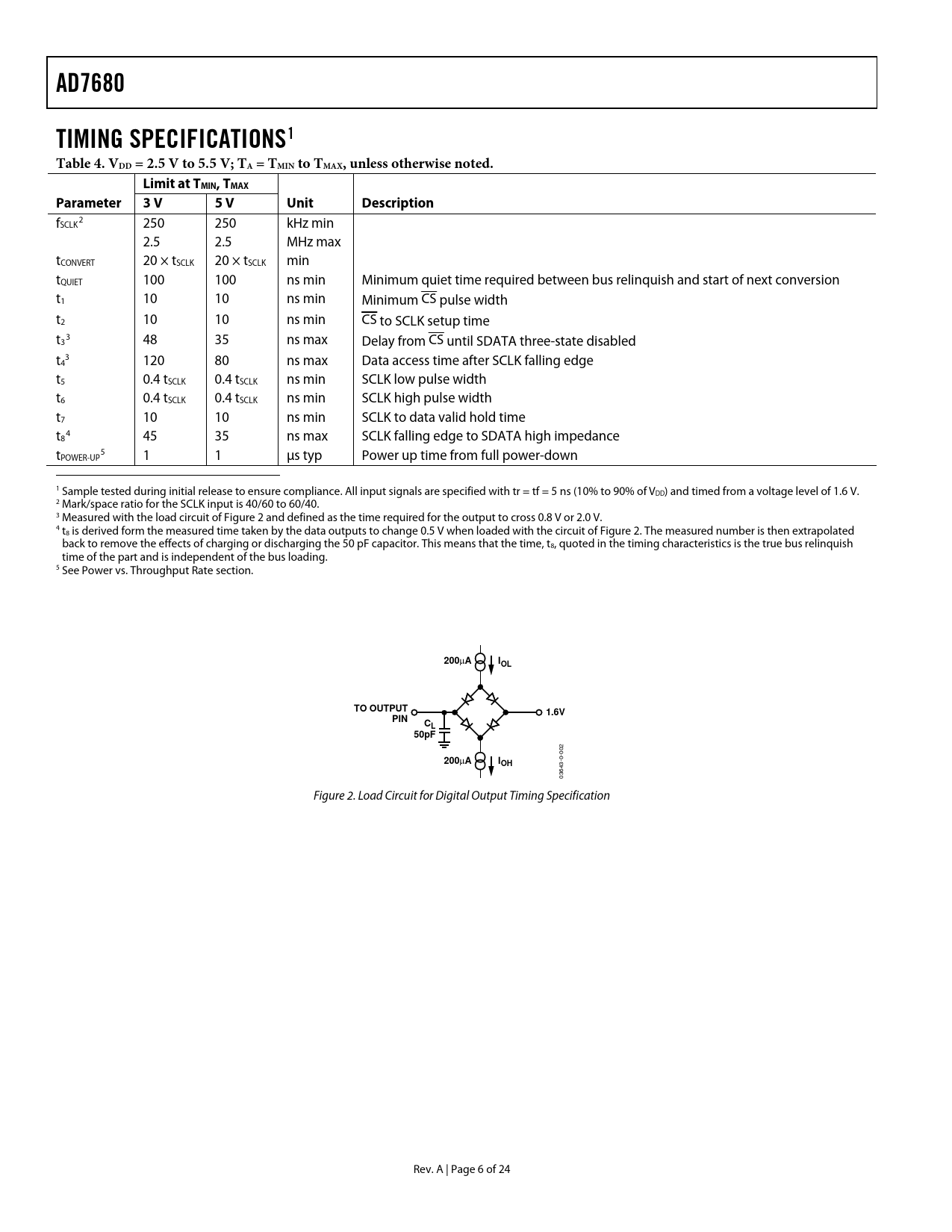 AD7680 TIMING SPECIFICATIONS Table 4 VDD = 2.5 V to 5.5 V; TA = TMIN to TMAX, unless otherwise noted Limit at TMIN, TMAX