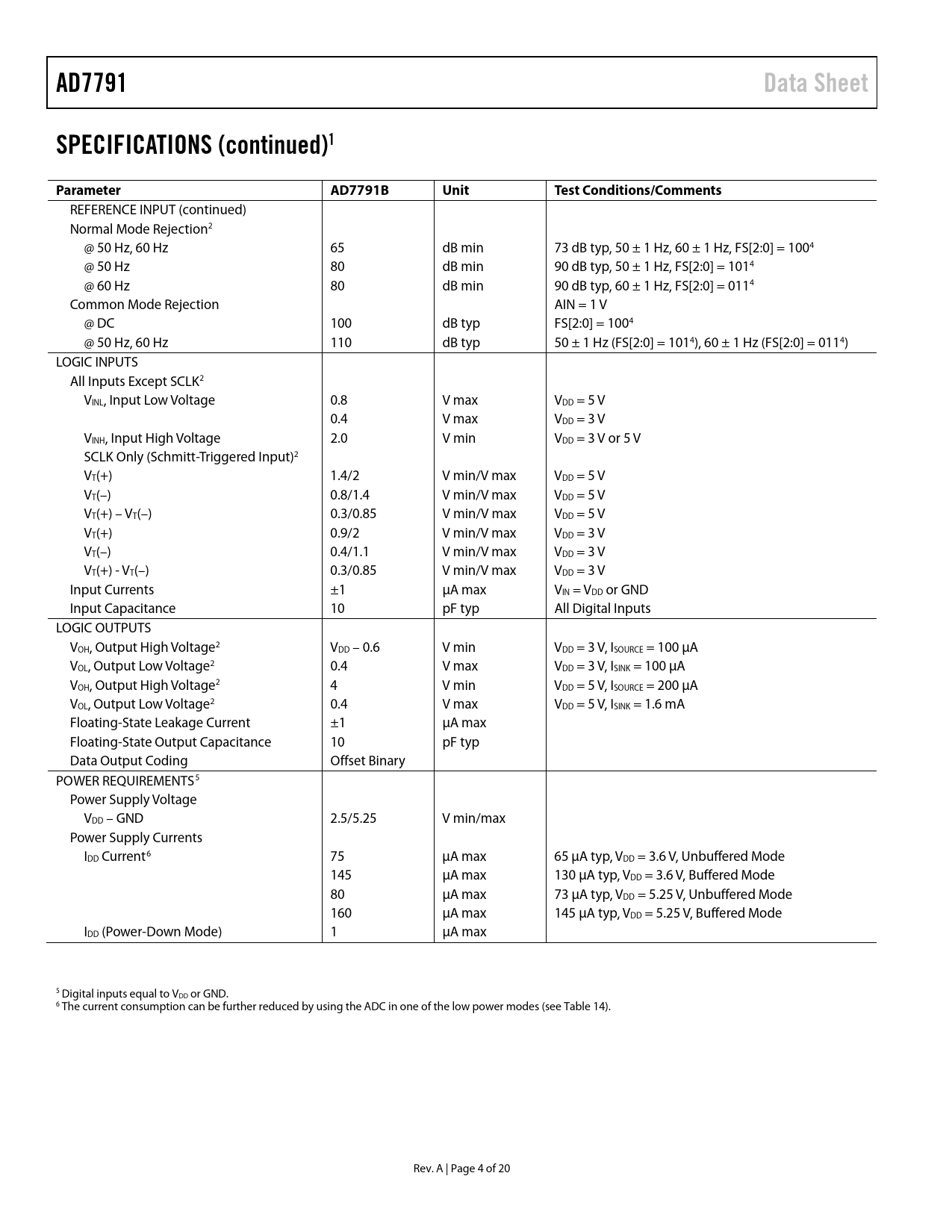 AD7791. Data Sheet. SPECIFICATIONS (continued)1. Parameter. AD7791B. Unit. Test Conditions/Comments