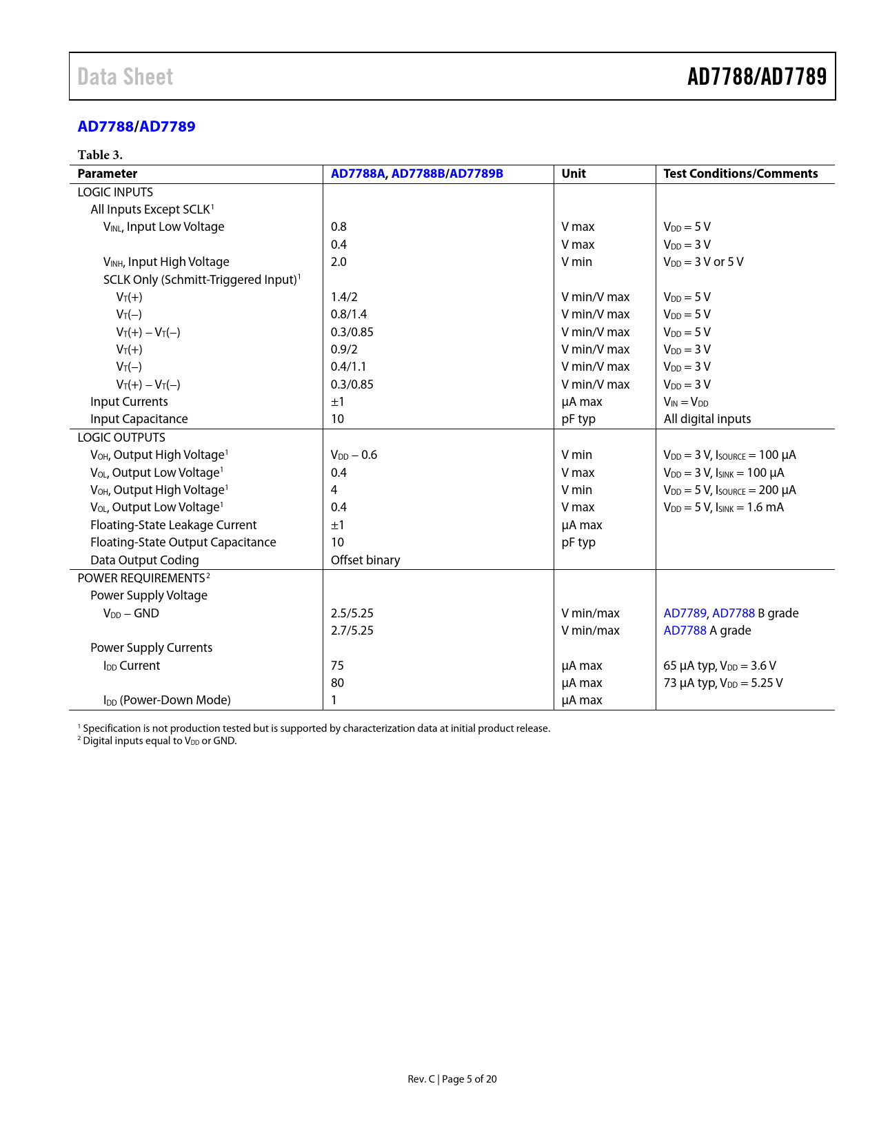 Data Sheet. AD7788/AD7789. AD7788/. AD7789. Table 3. Parameter. AD7788A, AD7788B/. AD7789B. Unit. Test Conditions/Comments