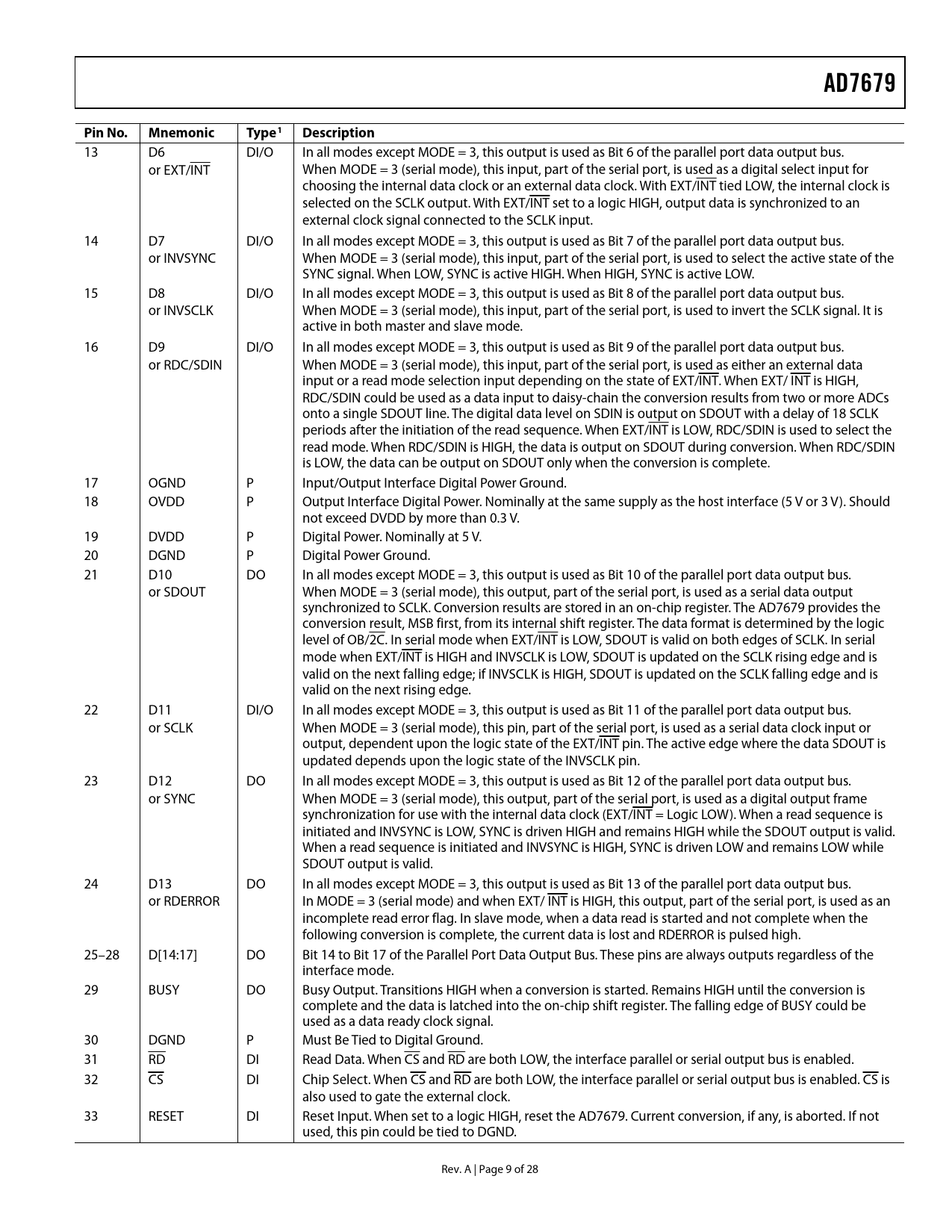 link to page 11 AD7679Pin No.MnemonicType1 Description 13 D6 DI/O In all modes except MODE = 3, this output is used as Bit 6 of the parallel port data output bus. or EXT/INT When MODE = 3 (serial mode), this input, part of the serial port, is used as a digital select input for choosing the internal data clock or an external data clock. With EXT/INT tied LOW, the internal clock is selected on the SCLK output. With EXT/INT set to a logic HIGH, output data is synchronized to an external clock signal connected to the SCLK input. 14 D7 DI/O In all modes except MODE = 3, this output is used as Bit 7 of the parallel port data output bus. or INVSYNC When MODE = 3 (serial mode), this input, part of the serial port, is used to select the active state of the SYNC signal. When LOW, SYNC is active HIGH. When HIGH, SYNC is active LOW. 15 D8 DI/O In all modes except MODE = 3, this output is used as Bit 8 of the parallel port data output bus. or INVSCLK When MODE = 3 (serial mode), this input, part of the serial port, is used to invert the SCLK signal. It is active in both master and slave mode. 16 D9 DI/O In all modes except MODE = 3, this output is used as Bit 9 of the parallel port data output bus. or RDC/SDIN When MODE = 3 (serial mode), this input, part of the serial port, is used as either an external data input or a read mode selection input depending on the state of EXT/INT. When EXT/ INT is HIGH, RDC/SDIN could be used as a data input to daisy-chain the conversion results from two or more ADCs onto a single SDOUT line. The digital data level on SDIN is output on SDOUT with a delay of 18 SCLK periods after the initiation of the read sequence. When EXT/INT is LOW, RDC/SDIN is used to select the read mode. When RDC/SDIN is HIGH, the data is output on SDOUT during conversion. When RDC/SDIN is LOW, the data can be output on SDOUT only when the conversion is complete. 17 OGND P Input/Output Interface Digital Power Ground. 18 OVDD P Output Interface Digital Power. Nominally at the same supply as the host interface (5 V or 3 V). Should not exceed DVDD by more than 0.3 V. 19 DVDD P Digital Power. Nominally at 5 V. 20 DGND P Digital Power Ground. 21 D10 DO In all modes except MODE = 3, this output is used as Bit 10 of the parallel port data output bus. or SDOUT When MODE = 3 (serial mode), this output, part of the serial port, is used as a serial data output synchronized to SCLK. Conversion results are stored in an on-chip register. The AD7679 provides the conversion result, MSB first, from its internal shift register. The data format is determined by the logic level of OB/2C. In serial mode when EXT/INT is LOW, SDOUT is valid on both edges of SCLK. In serial mode when EXT/INT is HIGH and INVSCLK is LOW, SDOUT is updated on the SCLK rising edge and is valid on the next falling edge; if INVSCLK is HIGH, SDOUT is updated on the SCLK falling edge and is valid on the next rising edge. 22 D11 DI/O In all modes except MODE = 3, this output is used as Bit 11 of the parallel port data output bus. or SCLK When MODE = 3 (serial mode), this pin, part of the serial port, is used as a serial data clock input or output, dependent upon the logic state of the EXT/INT pin. The active edge where the data SDOUT is updated depends upon the logic state of the INVSCLK pin. 23 D12 DO In all modes except MODE = 3, this output is used as Bit 12 of the parallel port data output bus. or SYNC When MODE = 3 (serial mode), this output, part of the serial port, is used as a digital output frame synchronization for use with the internal data clock (EXT/INT = Logic LOW). When a read sequence is initiated and INVSYNC is LOW, SYNC is driven HIGH and remains HIGH while the SDOUT output is valid. When a read sequence is initiated and INVSYNC is HIGH, SYNC is driven LOW and remains LOW while SDOUT output is valid. 24 D13 DO In all modes except MODE = 3, this output is used as Bit 13 of the parallel port data output bus. or RDERROR In MODE = 3 (serial mode) and when EXT/ INT is HIGH, this output, part of the serial port, is used as an incomplete read error flag. In slave mode, when a data read is started and not complete when the following conversion is complete, the current data is lost and RDERROR is pulsed high. 25–28 D[14:17] DO Bit 14 to Bit 17 of the Parallel Port Data Output Bus. These pins are always outputs regardless of the interface mode. 29 BUSY DO Busy Output. Transitions HIGH when a conversion is started. Remains HIGH until the conversion is complete and the data is latched into the on-chip shift register. The falling edge of BUSY could be used as a data ready clock signal. 30 DGND P Must Be Tied to Digital Ground. 31 RD DI Read Data. When CS and RD are both LOW, the interface parallel or serial output bus is enabled. 32 CS DI Chip Select. When CS and RD are both LOW, the interface parallel or serial output bus is enabled. CS is also used to gate the external clock. 33 RESET DI Reset Input. When set to a logic HIGH, reset the AD7679. Current conversion, if any, is aborted. If not used, this pin could be tied to DGND. Rev. A | Page 9 of 28 Document Outline FEATURES APPLICATIONS FUNCTIONAL BLOCK DIAGRAM GENERAL DESCRIPTION PRODUCT HGHLIGHTS TABLE OF CONTENTS REVISION HISTORY SPECIFICATIONS TIMING SPECIFICATIONS ABSOLUTE MAXIMUM RATINGS ESD CAUTION PIN CONFIGURATION AND FUNCTION DESCRIPTIONS DEFINITION OF SPECIFICATIONS TYPICAL PERFORMANCE CHARACTERISTICS CIRCUIT INFORMATION CONVERTER OPERATION Transfer Functions TYPICAL CONNECTION DIAGRAM Analog Inputs Driver Amplifier Choice Single-to-Differential Driver Voltage Reference Power Supply POWER DISSIPATION VERSUS THROUGHPUT CONVERSION CONTROL DIGITAL INTERFACE PARALLEL INTERFACE SERIAL INTERFACE MASTER SERIAL INTERFACE Internal Clock SLAVE SERIAL INTERFACE External Clock External Discontinuous Clock Data Read after Conversion External Clock Data Read during Conversion MICROPROCESSOR INTERFACING SPI Interface (ADSP-219x) APPLICATION HINTS LAYOUT EVALUATING THE AD7679’S PERFORMANCE