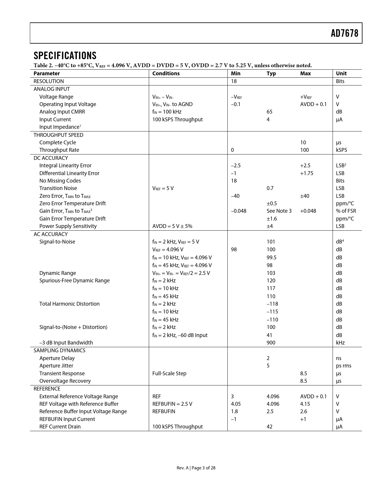 link to page 4 link to page 5 link to page 5 link to page 5 AD7678SPECIFICATIONS Table 2. –40°C to +85°C, VREF = 4.096 V, AVDD = DVDD = 5 V, OVDD = 2.7 V to 5.25 V, unless otherwise noted. Parameter ConditionsMinTypMaxUnit RESOLUTION 18 Bits ANALOG INPUT Voltage Range VIN+ – VIN– –VREF +VREF V Operating Input Voltage VIN+, VIN– to AGND –0.1 AVDD + 0.1 V Analog Input CMRR fIN = 100 kHz 65 dB Input Current 100 kSPS Throughput 4 μA Input Impedance1 THROUGHPUT SPEED Complete Cycle 10 μs Throughput Rate 0 100 kSPS DC ACCURACY Integral Linearity Error –2.5 +2.5 LSB2 Differential Linearity Error –1 +1.75 LSB No Missing Codes 18 Bits Transition Noise VREF = 5 V 0.7 LSB Zero Error, TMIN to TMAX –40 ±40 LSB Zero Error Temperature Drift ±0.5 ppm/°C Gain Error, T 3 MIN to TMAX –0.048 See Note 3 +0.048 % of FSR Gain Error Temperature Drift ±1.6 ppm/°C Power Supply Sensitivity AVDD = 5 V ± 5% ±4 LSB AC ACCURACY Signal-to-Noise fIN = 2 kHz, VREF = 5 V 101 dB4 VREF = 4.096 V 98 100 dB fIN = 10 kHz, VREF = 4.096 V 99.5 dB fIN = 45 kHz, VREF = 4.096 V 98 dB Dynamic Range VIN+ = VIN– = VREF/2 = 2.5 V 103 dB Spurious-Free Dynamic Range fIN = 2 kHz 120 dB fIN = 10 kHz 117 dB fIN = 45 kHz 110 dB Total Harmonic Distortion fIN = 2 kHz –118 dB fIN = 10 kHz –115 dB fIN = 45 kHz –110 dB Signal-to-(Noise + Distortion) fIN = 2 kHz 100 dB fIN = 2 kHz, –60 dB Input 41 dB –3 dB Input Bandwidth 900 kHz SAMPLING DYNAMICS Aperture Delay 2 ns Aperture Jitter 5 ps rms Transient Response Full-Scale Step 8.5 μs Overvoltage Recovery 8.5 μs REFERENCE External Reference Voltage Range REF 3 4.096 AVDD + 0.1 V REF Voltage with Reference Buffer REFBUFIN = 2.5 V 4.05 4.096 4.15 V Reference Buffer Input Voltage Range REFBUFIN 1.8 2.5 2.6 V REFBUFIN Input Current –1 +1 μA REF Current Drain 100 kSPS Throughput 42 μA Rev. A | Page 3 of 28 Document Outline Specifications Timing Specifications Absolute Maximum Ratings ESD Caution Pin Configuration and Function Descriptions Definition of Specifications Integral Nonlinearity Error (INL) Differential Nonlinearity Error (DNL) Gain Error Zero Error Spurious-Free Dynamic Range (SFDR) Effective Number of Bits (ENOB) Total Harmonic Distortion (THD) Dynamic Range Signal-to-Noise Ratio (SNR) Signal-to-(Noise + Distortion) Ratio (S/[N+D]) Aperture Delay Transient Response Typical Performance Characteristics Circuit Information Converter Operation Transfer Functions Typical Connection Diagram Analog Inputs Driver Amplifier Choice Single-to-Differential Driver Voltage Reference Power Supply Power Dissipation versus Throughput Conversion Control Digital Interface Parallel Interface Serial Interface Master Serial Interface Internal Clock Slave Serial Interface External Clock External Discontinuous Clock Data Read after Conversion External Clock Data Read during Conversion Microprocessor Interfacing SPI Interface (ADSP-219x) Application Hints Layout Evaluating the AD7678’s Performance Outline Dimensions Ordering Guide