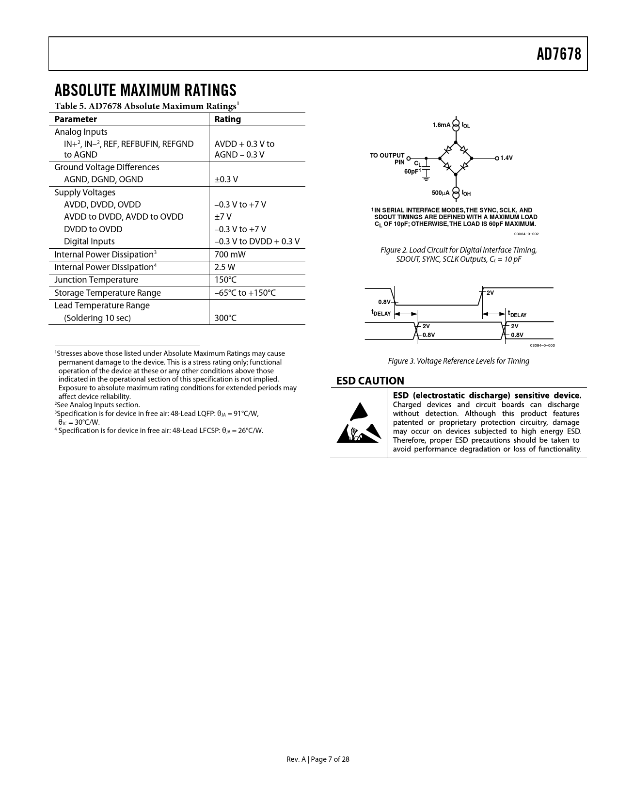 link to page 18 link to page 8 link to page 8 link to page 8 link to page 8 link to page 8 AD7678ABSOLUTE MAXIMUM RATINGS Table 5. AD7678 Absolute Maximum Ratings1Parameter Rating1.6mAIOL Analog Inputs IN+2, IN–2, REF, REFBUFIN, REFGND AVDD + 0.3 V to to AGND AGND – 0.3 V TO OUTPUT1.4VPIN Ground Voltage Differences CL60pF1 AGND, DGND, OGND ±0.3 V Supply Voltages 500 AIOH AVDD, DVDD, OVDD –0.3 V to +7 V 1 IN SERIAL INTERFACE MODES,THE SYNC, SCLK, AND AVDD to DVDD, AVDD to OVDD ±7 V SDOUT TIMINGS ARE DEFINED WITH A MAXIMUM LOAD C DVDD to OVDD –0.3 V to +7 V L OF 10pF; OTHERWISE,THE LOAD IS 60pF MAXIMUM. 03084–0–002 Digital Inputs –0.3 V to DVDD + 0.3 V Figure 2. Load Circuit for Digital Interface Timing, Internal Power Dissipation3 700 mW SDOUT, SYNC, SCLK Outputs, CL = 10 pF Internal Power Dissipation4 2.5 W Junction Temperature 150°C Storage Temperature Range –65°C to +150°C 2V Lead Temperature Range 0.8VtDELAYt (Soldering 10 sec) 300°C DELAY2V2V0.8V0.8V 03084–0–003 1Stresses above those listed under Absolute Maximum Ratings may cause permanent damage to the device. This is a stress rating only; functional Figure 3. Voltage Reference Levels for Timing operation of the device at these or any other conditions above those indicated in the operational section of this specification is not implied. ESD CAUTION Exposure to absolute maximum rating conditions for extended periods may affect device reliability. 2See Analog Inputs section. 3Specification is for device in free air: 48-Lead LQFP: θJA = 91°C/W, θJC = 30°C/W. 4 Specification is for device in free air: 48-Lead LFCSP: θJA = 26°C/W. Rev. A | Page 7 of 28 Document Outline Specifications Timing Specifications Absolute Maximum Ratings ESD Caution Pin Configuration and Function Descriptions Definition of Specifications Integral Nonlinearity Error (INL) Differential Nonlinearity Error (DNL) Gain Error Zero Error Spurious-Free Dynamic Range (SFDR) Effective Number of Bits (ENOB) Total Harmonic Distortion (THD) Dynamic Range Signal-to-Noise Ratio (SNR) Signal-to-(Noise + Distortion) Ratio (S/[N+D]) Aperture Delay Transient Response Typical Performance Characteristics Circuit Information Converter Operation Transfer Functions Typical Connection Diagram Analog Inputs Driver Amplifier Choice Single-to-Differential Driver Voltage Reference Power Supply Power Dissipation versus Throughput Conversion Control Digital Interface Parallel Interface Serial Interface Master Serial Interface Internal Clock Slave Serial Interface External Clock External Discontinuous Clock Data Read after Conversion External Clock Data Read during Conversion Microprocessor Interfacing SPI Interface (ADSP-219x) Application Hints Layout Evaluating the AD7678’s Performance Outline Dimensions Ordering Guide