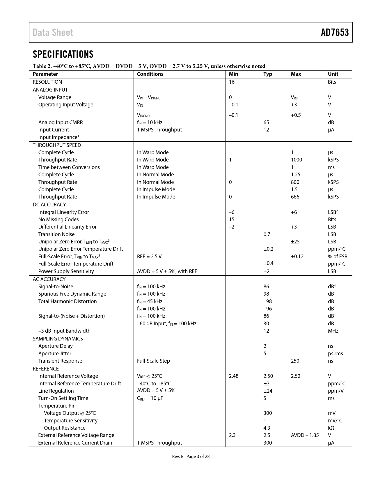 Data Sheet AD7653 SPECIFICATIONS Table 2. –40°C to +85°C, AVDD = DVDD = 5 V, OVDD = 2.7 V to 5.25 V, unless otherwise noted Parameter Conditions Min Typ Max Unit