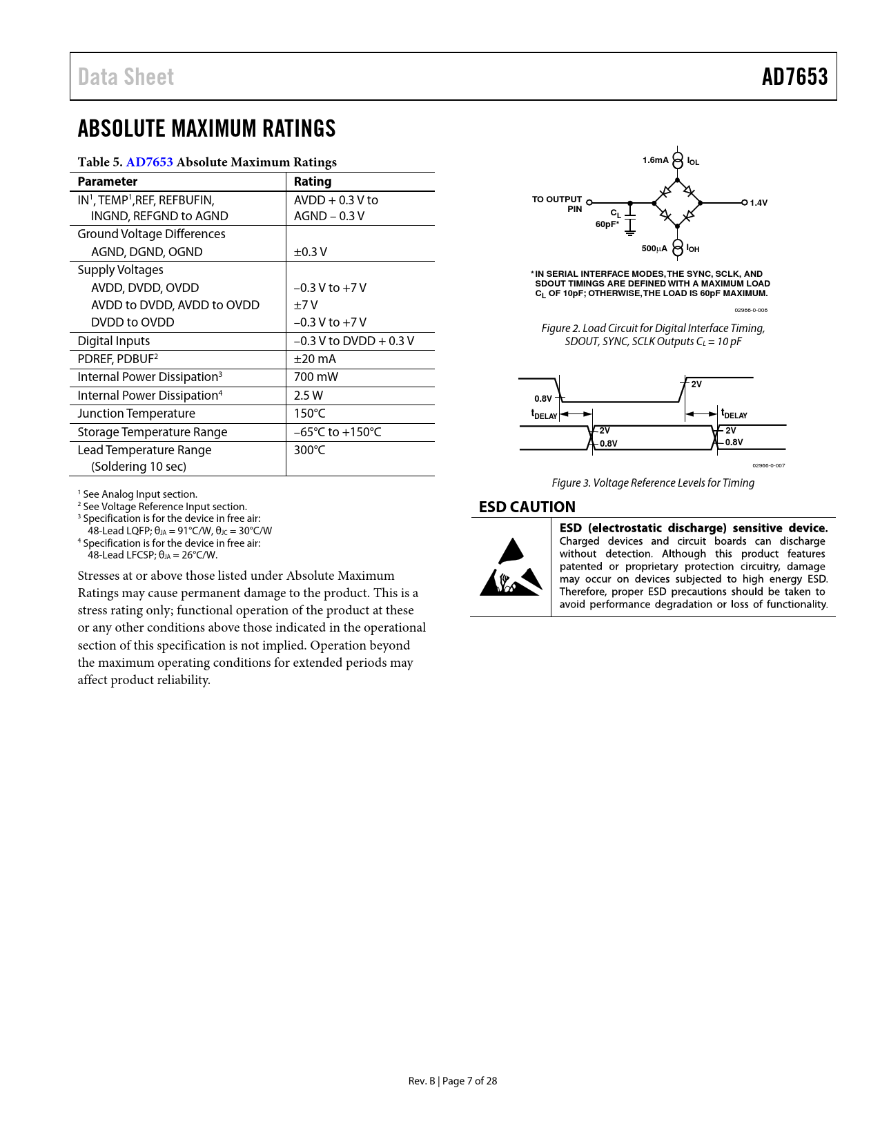 link to page 18 link to page 19 Data SheetAD7653ABSOLUTE MAXIMUM RATINGSTable 5. AD7653 Absolute Maximum Ratings1.6mAIOLParameter Rating IN1, TEMP1,REF, REFBUFIN, AVDD + 0.3 V to TO OUTPUT1.4VPIN INGND, REFGND to AGND AGND – 0.3 V CL60pF* Ground Voltage Differences AGND, DGND, OGND ±0.3 V 500 AIOH Supply Voltages * IN SERIAL INTERFACE MODES,THE SYNC, SCLK, AND AVDD, DVDD, OVDD –0.3 V to +7 V SDOUT TIMINGS ARE DEFINED WITH A MAXIMUM LOAD CL OF 10pF; OTHERWISE,THE LOAD IS 60pF MAXIMUM. AVDD to DVDD, AVDD to OVDD ±7 V 02966-0-006 DVDD to OVDD –0.3 V to +7 V Figure 2. Load Circuit for Digital Interface Timing, Digital Inputs –0.3 V to DVDD + 0.3 V SDOUT, SYNC, SCLK Outputs CL = 10 pF PDREF, PDBUF2 ±20 mA Internal Power Dissipation3 700 mW 2V Internal Power Dissipation4 2.5 W 0.8V Junction Temperature 150°C ttDELAYDELAY Storage Temperature Range –65°C to +150°C 2V2V0.8V0.8V Lead Temperature Range 300°C (Soldering 10 sec) 02966-0-007 Figure 3. Voltage Reference Levels for Timing 1 See Analog Input section. 2 See Voltage Reference Input section. ESD CAUTION 3 Specification is for the device in free air: 48-Lead LQFP; θJA = 91°C/W, θJC = 30°C/W 4 Specification is for the device in free air: 48-Lead LFCSP; θJA = 26°C/W. Stresses at or above those listed under Absolute Maximum Ratings may cause permanent damage to the product. This is a stress rating only; functional operation of the product at these or any other conditions above those indicated in the operational section of this specification is not implied. Operation beyond the maximum operating conditions for extended periods may affect product reliability. Rev. B | Page 7 of 28 Document Outline Features Applications General Description Functional Block Diagram Product Hightlights Revision History Specifications Timing Specifications Absolute Maximum Ratings ESD Caution Pin Configuration and Function Descriptions Definitions of Specifications Integral Nonlinearity Error (INL) Differential Nonlinearity Error (DNL) Full-Scale Error Unipolar Zero Error Spurious-Free Dynamic Range (SFDR) Effective Number of Bits (ENOB) Total Harmonic Distortion (THD) Signal-to-Noise Ratio (SNR) Signal-to-(Noise + Distortion) Ratio (S/[N+D]) Aperture Delay Transient Response Overvoltage Recovery Reference Voltage Temperature Coefficient Typical Performance Characteristics Circuit Information Converter Operation Modes of Operation Transfer Functions Typical Connection Diagram Analog Input Driver Amplifier Choice Voltage Reference Input Power Supply Power Dissipation vs. Throughput Conversion Control Digital Interface Parallel Interface Serial Interface Master Serial Interface Internal Clock Slave Serial Interface External Clock External Discontinuous Clock Data Read After Conversion External Clock Data Read During Conversion Microprocessor Interfacing SPI Interface (ADSP-2191M) Application Hints Bipolar and Wider Input Ranges Layout Outline Dimensions Ordering Guide