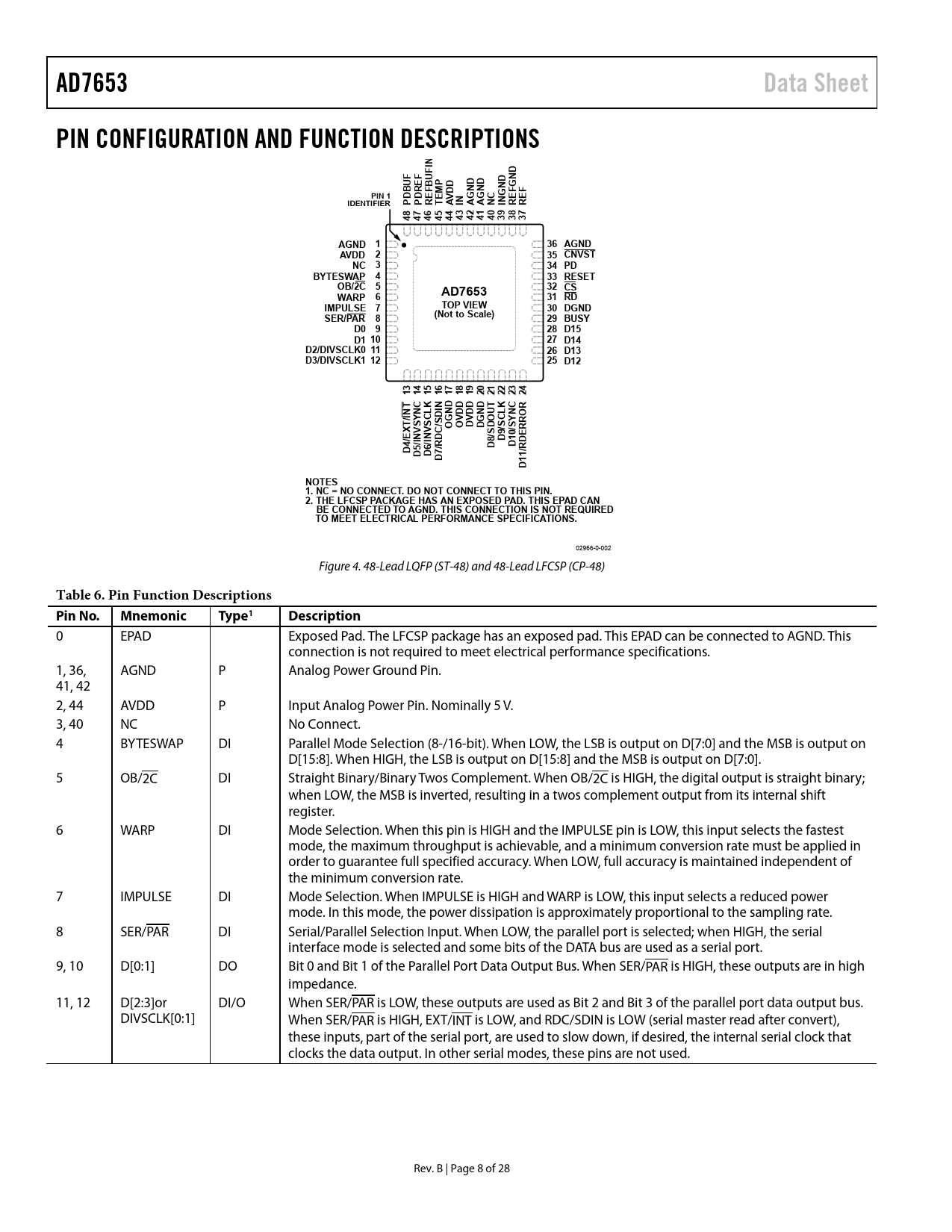 link to page 11 AD7653Data SheetPIN CONFIGURATION AND FUNCTION DESCRIPTIONSINFNDFBUFND NDND FG FPIN 1IDENTIFIERPDBUF PDRE RE TEMP AVDD IN AG AG NC ING RE RE 48 47 46 45 44 43 42 41 40 39 38 37AGND 136 AGNDAVDD 235 CNVSTNC 334 PDBYTESWAP 433 RESETOB/2C 532 CSWARP 6AD765331 RDIMPULSE 7TOP VIEW30 DGNDSER/PAR(Not to Scale)829 BUSYD0 928 D15D1 1027 D14D2/DIVSCLK0 1126 D13D3/DIVSCLK1 1225 D1213 14 15 16 17 18 19 20 21 22 23 24TK N DKDD ND UTRSYNC SCL SDIVDDOGN O DV DGSCL SYNC RROEXT/INSDOINV INV RDC/D9/ D10/D4/D8/RDED5/ D6/ D7/11/ DNOTES1. NC = NO CONNECT. DO NOT CONNECT TO THIS PIN.2. THE LFCSP PACKAGE HAS AN EXPOSED PAD. THIS EPAD CANBE CONNECTED TO AGND. THIS CONNECTION IS NOT REQUIREDTO MEET ELECTRICAL PERFORMANCE SPECIFICATIONS. 02966-0-002 Figure 4. 48-Lead LQFP (ST-48) and 48-Lead LFCSP (CP-48) Table 6. Pin Function Descriptions Pin No.MnemonicType1Description 0 EPAD Exposed Pad. The LFCSP package has an exposed pad. This EPAD can be connected to AGND. This connection is not required to meet electrical performance specifications. 1, 36, AGND P Analog Power Ground Pin. 41, 42 2, 44 AVDD P Input Analog Power Pin. Nominally 5 V. 3, 40 NC No Connect. 4 BYTESWAP DI Parallel Mode Selection (8-/16-bit). When LOW, the LSB is output on D[7:0] and the MSB is output on D[15:8]. When HIGH, the LSB is output on D[15:8] and the MSB is output on D[7:0]. 5 OB/2C DI Straight Binary/Binary Twos Complement. When OB/2C is HIGH, the digital output is straight binary; when LOW, the MSB is inverted, resulting in a twos complement output from its internal shift register. 6 WARP DI Mode Selection. When this pin is HIGH and the IMPULSE pin is LOW, this input selects the fastest mode, the maximum throughput is achievable, and a minimum conversion rate must be applied in order to guarantee full specified accuracy. When LOW, full accuracy is maintained independent of the minimum conversion rate. 7 IMPULSE DI Mode Selection. When IMPULSE is HIGH and WARP is LOW, this input selects a reduced power mode. In this mode, the power dissipation is approximately proportional to the sampling rate. 8 SER/PAR DI Serial/Parallel Selection Input. When LOW, the parallel port is selected; when HIGH, the serial interface mode is selected and some bits of the DATA bus are used as a serial port. 9, 10 D[0:1] DO Bit 0 and Bit 1 of the Parallel Port Data Output Bus. When SER/PAR is HIGH, these outputs are in high impedance. 11, 12 D[2:3]or DI/O When SER/PAR is LOW, these outputs are used as Bit 2 and Bit 3 of the parallel port data output bus. DIVSCLK[0:1] When SER/PAR is HIGH, EXT/INT is LOW, and RDC/SDIN is LOW (serial master read after convert), these inputs, part of the serial port, are used to slow down, if desired, the internal serial clock that clocks the data output. In other serial modes, these pins are not used. Rev. B | Page 8 of 28 Document Outline Features Applications General Description Functional Block Diagram Product Hightlights Revision History Specifications Timing Specifications Absolute Maximum Ratings ESD Caution Pin Configuration and Function Descriptions Definitions of Specifications Integral Nonlinearity Error (INL) Differential Nonlinearity Error (DNL) Full-Scale Error Unipolar Zero Error Spurious-Free Dynamic Range (SFDR) Effective Number of Bits (ENOB) Total Harmonic Distortion (THD) Signal-to-Noise Ratio (SNR) Signal-to-(Noise + Distortion) Ratio (S/[N+D]) Aperture Delay Transient Response Overvoltage Recovery Reference Voltage Temperature Coefficient Typical Performance Characteristics Circuit Information Converter Operation Modes of Operation Transfer Functions Typical Connection Diagram Analog Input Driver Amplifier Choice Voltage Reference Input Power Supply Power Dissipation vs. Throughput Conversion Control Digital Interface Parallel Interface Serial Interface Master Serial Interface Internal Clock Slave Serial Interface External Clock External Discontinuous Clock Data Read After Conversion External Clock Data Read During Conversion Microprocessor Interfacing SPI Interface (ADSP-2191M) Application Hints Bipolar and Wider Input Ranges Layout Outline Dimensions Ordering Guide