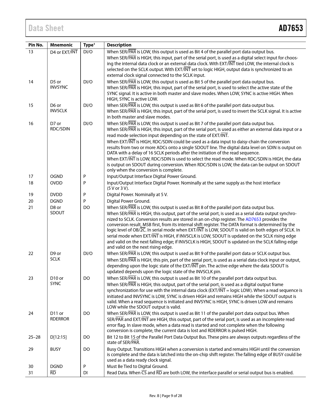 13 D4 or EXT/INT DI/O When SER/PAR is LOW, this output is used as Bit 4 of the parallel port data output bus. When SER/PAR is HIGH, this input, part of the serial port, is used as a digital select input for choos- ing the internal data clock or an external data clock. With EXT/INT tied LOW, the internal clock is selected on the SCLK output. With EXT/INT set to logic HIGH, output data is synchronized to an external clock signal connected to the SCLK input. 14 D5 or DI/O When SER/PAR is LOW, this output is used as Bit 5 of the parallel port data output bus. INVSYNC When SER/PAR is HIGH, this input, part of the serial port, is used to select the active state of the SYNC signal. It is active in both master and slave modes. When LOW, SYNC is active HIGH. When HIGH, SYNC is active LOW. 15 D6 or DI/O When SER/PAR is LOW, this output is used as Bit 6 of the parallel port data output bus. INVSCLK When SER/PAR is HIGH, this input, part of the serial port, is used to invert the SCLK signal. It is active in both master and slave modes. 16 D7 or DI/O When SER/PAR is LOW, this output is used as Bit 7 of the parallel port data output bus. RDC/SDIN When SER/PAR is HIGH, this input, part of the serial port, is used as either an external data input or a read mode selection input depending on the state of EXT/INT. When EXT/INT is HIGH, RDC/SDIN could be used as a data input to daisy-chain the conversion results from two or more ADCs onto a single SDOUT line. The digital data level on SDIN is output on DATA with a delay of 16 SCLK periods after the initiation of the read sequence. When EXT/INT is LOW, RDC/SDIN is used to select the read mode. When RDC/SDIN is HIGH, the data is output on SDOUT during conversion. When RDC/SDIN is LOW, the data can be output on SDOUT only when the conversion is complete. 17 OGND P Input/Output Interface Digital Power Ground. 18 OVDD P Input/Output Interface Digital Power. Nominally at the same supply as the host interface (5 V or 3 V). 19 DVDD P Digital Power. Nominally at 5 V. 20 DGND P Digital Power Ground. 21 D8 or DO When SER/PAR is LOW, this output is used as Bit 8 of the parallel port data output bus. SDOUT When SER/PAR is HIGH, this output, part of the serial port, is used as a serial data output synchro- nized to SCLK. Conversion results are stored in an on-chip register. The AD7653 provides the conversion result, MSB first, from its internal shift register. The DATA format is determined by the logic level of OB/2C. In serial mode when EXT/INT is LOW, SDOUT is valid on both edges of SCLK. In serial mode when EXT/INT is HIGH, if INVSCLK is LOW, SDOUT is updated on the SCLK rising edge and valid on the next falling edge; if INVSCLK is HIGH, SDOUT is updated on the SCLK falling edge and valid on the next rising edge. 22 D9 or DI/O When SER/PAR is LOW, this output is used as Bit 9 of the parallel port data or SCLK output bus. SCLK When SER/PAR is HIGH, this pin, part of the serial port, is used as a serial data clock input or output, depending upon the logic state of the EXT/INT pin. The active edge where the data SDOUT is updated depends upon the logic state of the INVSCLK pin. 23 D10 or DO When SER/PAR is LOW, this output is used as Bit 10 of the parallel port data output bus. SYNC When SER/PAR is HIGH, this output, part of the serial port, is used as a digital output frame synchronization for use with the internal data clock (EXT/INT = logic LOW). When a read sequence is initiated and INVSYNC is LOW, SYNC is driven HIGH and remains HIGH while the SDOUT output is valid. When a read sequence is initiated and INVSYNC is HIGH, SYNC is driven LOW and remains LOW while the SDOUT output is valid. 24 D11 or DO When SER/PAR is LOW, this output is used as Bit 11 of the parallel port data output bus. When RDERROR SER/PAR and EXT/INT are HIGH, this output, part of the serial port, is used as an incomplete read error flag. In slave mode, when a data read is started and not complete when the following conversion is complete, the current data is lost and RDERROR is pulsed HIGH. 25–28 D[12:15] DO Bit 12 to Bit 15 of the Parallel Port Data Output Bus. These pins are always outputs regardless of the state of SER/PAR. 29 BUSY DO Busy Output. Transitions HIGH when a conversion is started and remains HIGH until the conversion is complete and the data is latched into the on-chip shift register. The falling edge of BUSY could be used as a data ready clock signal. 30 DGND P Must Be Tied to Digital Ground. 31 RD DI Read Data. When CS and RD are both LOW, the interface parallel or serial output bus is enabled. Rev. B | Page 9 of 28 Document Outline Features Applications General Description Functional Block Diagram Product Hightlights Revision History Specifications Timing Specifications Absolute Maximum Ratings ESD Caution Pin Configuration and Function Descriptions Definitions of Specifications Integral Nonlinearity Error (INL) Differential Nonlinearity Error (DNL) Full-Scale Error Unipolar Zero Error Spurious-Free Dynamic Range (SFDR) Effective Number of Bits (ENOB) Total Harmonic Distortion (THD) Signal-to-Noise Ratio (SNR) Signal-to-(Noise + Distortion) Ratio (S/[N+D]) Aperture Delay Transient Response Overvoltage Recovery Reference Voltage Temperature Coefficient Typical Performance Characteristics Circuit Information Converter Operation Modes of Operation Transfer Functions Typical Connection Diagram Analog Input Driver Amplifier Choice Voltage Reference Input Power Supply Power Dissipation vs. Throughput Conversion Control Digital Interface Parallel Interface Serial Interface Master Serial Interface Internal Clock Slave Serial Interface External Clock External Discontinuous Clock Data Read After Conversion External Clock Data Read During Conversion Microprocessor Interfacing SPI Interface (ADSP-2191M) Application Hints Bipolar and Wider Input Ranges Layout Outline Dimensions Ordering Guide