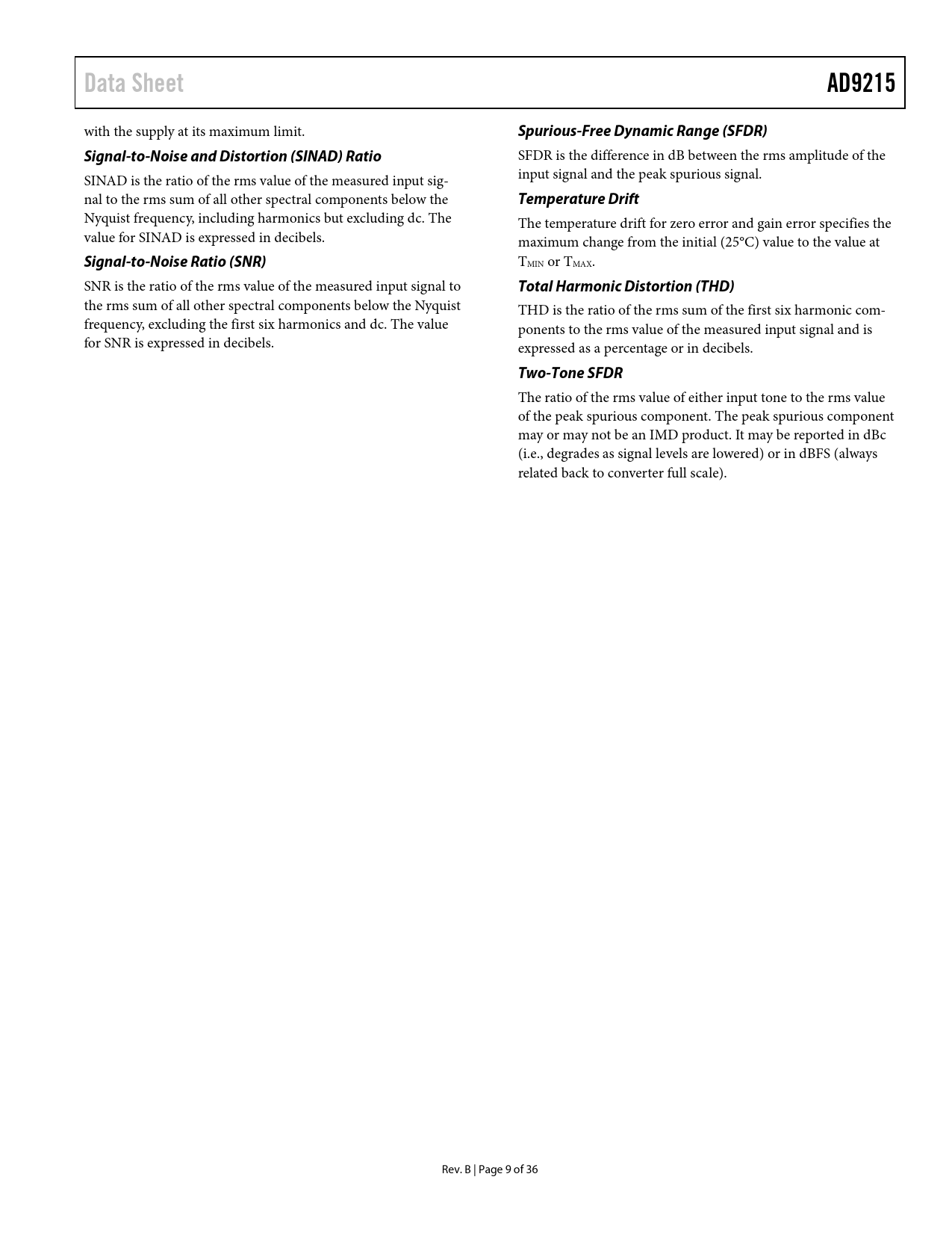 Data Sheet AD9215 Spurious-Free Dynamic Range (SFDR) Signal-to-Noise and Distortion (SINAD) Ratio Temperature Drift