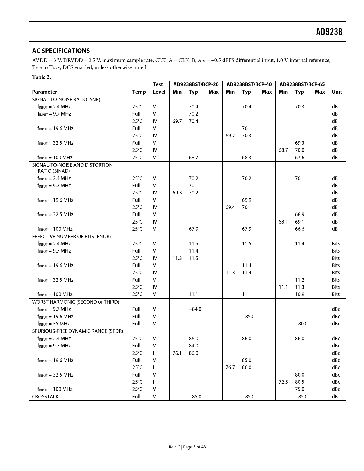 AD9238AC SPECIFICATIONS AVDD = 3 V, DRVDD = 2.5 V, maximum sample rate, CLK_A = CLK_B; AIN = −0.5 dBFS differential input, 1.0 V internal reference, TMIN to TMAX, DCS enabled, unless otherwise noted. Table 2.TestAD9238BST/BCP-20AD9238BST/BCP-40AD9238BST/BCP-65ParameterTempLevelMinTypMaxMinTypMaxMinTypMaxUnit SIGNAL-TO-NOISE RATIO (SNR) fINPUT = 2.4 MHz 25°C V 70.4 70.4 70.3 dB fINPUT = 9.7 MHz Full V 70.2 dB 25°C IV 69.7 70.4 dB fINPUT = 19.6 MHz Full V 70.1 dB 25°C IV 69.7 70.3 dB fINPUT = 32.5 MHz Full V 69.3 dB 25°C IV 68.7 70.0 dB fINPUT = 100 MHz 25°C V 68.7 68.3 67.6 dB SIGNAL-TO-NOISE AND DISTORTION RATIO (SINAD) fINPUT = 2.4 MHz 25°C V 70.2 70.2 70.1 dB fINPUT = 9.7 MHz Full V 70.1 dB 25°C IV 69.3 70.2 dB fINPUT = 19.6 MHz Full V 69.9 dB 25°C IV 69.4 70.1 dB fINPUT = 32.5 MHz Full V 68.9 dB 25°C IV 68.1 69.1 dB fINPUT = 100 MHz 25°C V 67.9 67.9 66.6 dB EFFECTIVE NUMBER OF BITS (ENOB) fINPUT = 2.4 MHz 25°C V 11.5 11.5 11.4 Bits fINPUT = 9.7 MHz Full V 11.4 Bits 25°C IV 11.3 11.5 Bits fINPUT = 19.6 MHz Full V 11.4 Bits 25°C IV 11.3 11.4 Bits fINPUT = 32.5 MHz Full V 11.2 Bits 25°C IV 11.1 11.3 Bits fINPUT = 100 MHz 25°C V 11.1 11.1 10.9 Bits WORST HARMONIC (SECOND or THIRD) fINPUT = 9.7 MHz Full V −84.0 dBc fINPUT = 19.6 MHz Full V −85.0 dBc fINPUT = 35 MHz Full V −80.0 dBc SPURIOUS-FREE DYNAMIC RANGE (SFDR) fINPUT = 2.4 MHz 25°C V 86.0 86.0 86.0 dBc fINPUT = 9.7 MHz Full V 84.0 dBc 25°C I 76.1 86.0 dBc fINPUT = 19.6 MHz Full V 85.0 dBc 25°C I 76.7 86.0 dBc fINPUT = 32.5 MHz Full V 80.0 dBc 25°C I 72.5 80.5 dBc fINPUT = 100 MHz 25°C V 75.0 dBc CROSSTALK Full V −85.0 −85.0 −85.0 dB Rev. C | Page 5 of 48 Document Outline FEATURES APPLICATIONS GENERAL DESCRIPTION FUNCTIONAL BLOCK DIAGRAM PRODUCT HIGHLIGHTS TABLE OF CONTENTS REVISION HISTORY SPECIFICATIONS DC SPECIFICATIONS AC SPECIFICATIONS DIGITAL SPECIFICATIONS SWITCHING SPECIFICATIONS ABSOLUTE MAXIMUM RATINGS EXPLANATION OF TEST LEVELS ESD CAUTION PIN CONFIGURATION AND FUNCTION DESCRIPTIONS TERMINOLOGY TYPICAL PERFORMANCE CHARACTERISTICS EQUIVALENT CIRCUITS THEORY OF OPERATION ANALOG INPUT Differential Input Configurations Single-Ended Input Configuration CLOCK INPUT AND CONSIDERATIONS POWER DISSIPATION AND STANDBY MODE DIGITAL OUTPUTS TIMING DATA FORMAT VOLTAGE REFERENCE Internal Reference Connection External Reference Operation AD9238 LQFP EVALUATION BOARD CLOCK CIRCUITRY ANALOG INPUTS REFERENCE CIRCUITRY DIGITAL CONTROL LOGIC OUTPUTS LQFP EVALUATION BOARD BILL OF MATERIALS (BOM) LQFP EVALUATION BOARD SCHEMATICS LQFP PCB LAYERS DUAL ADC LFCSP PCB POWER CONNECTOR ANALOG INPUTS OPTIONAL OPERATIONAL AMPLIFIER CLOCK VOLTAGE REFERENCE DATA OUTPUTS LFCSP EVALUATION BOARD BILL OF MATERIALS (BOM) LFCSP PCB SCHEMATICS LFCSP PCB LAYERS THERMAL CONSIDERATIONS OUTLINE DIMENSIONS ORDERING GUIDE
