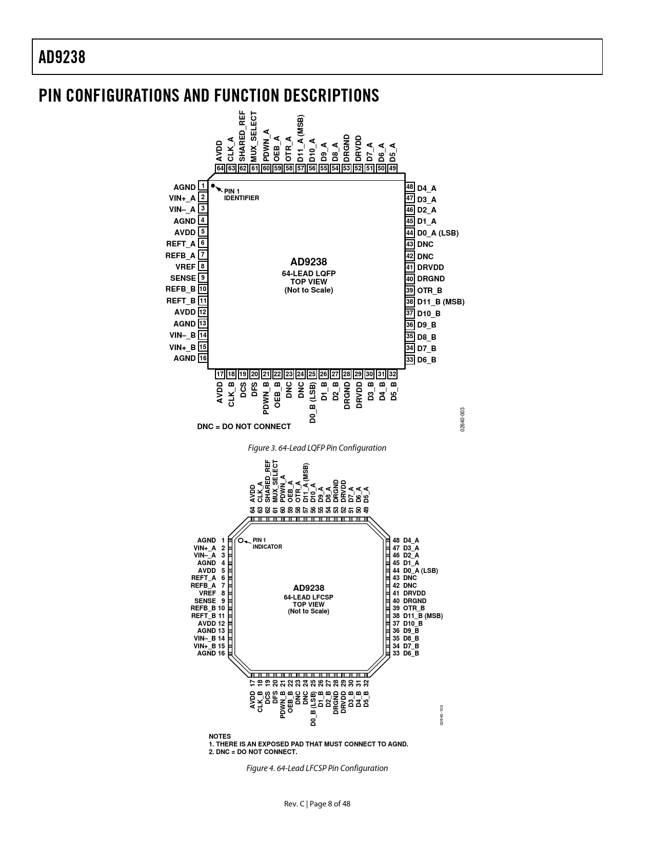 F T ) C E B L S D_RE A M _ A N A _ _ A ( A ND DD DD K_A X_SE W B _ _ A R HARE AV CL S MU PD OE OT D11 D10 D9_A D8_A DRG DRV D7_A D6_ D5_A 64 63 62 61 60 59 58 57 56 55 54 53 52 51 50 49 AGND 1 PIN 1 48 D4_A VIN+_A INDICATOR 2 47 D3_A VIN–_A 3 46 D2_A AGND 4 45 D1_A AVDD 5 44 D0_A (LSB) REFT_A 6 43 DNC REFB_A 7 42 DNC AD9238 VREF 8 41 DRVDD 64-LEAD LFCSP SENSE 9 40 DRGND TOP VIEW REFB_B 10 39 OTR_B (Not to Scale) REFT_B 11 38 D11_B (MSB) AVDD 12 37 D10_B AGND 13 36 D9_B VIN–_B 14 35 D8_B VIN+_B 15 34 D7_B AGND 16 33 D6_B 17 18 19 20 21 22 23 24 25 26 27 28 29 30 31 32 D S B B C C ) D D _ _ B N DD K_B DCS DF B DN DN S L D1_B D2_B G V D3_B D4_B D5_B AV CL WN OE