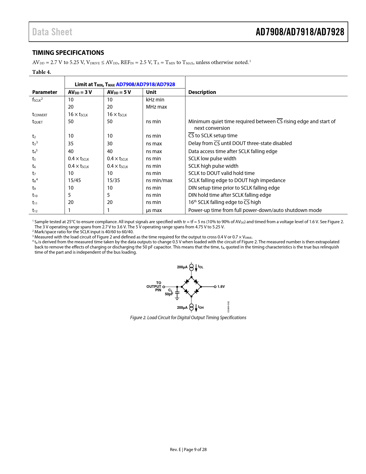 Pages / Page28 / 9 — Data Sheet. AD7908/AD7918/AD7928. TIMING SPECIFICATIONS. Table 4. Limit …