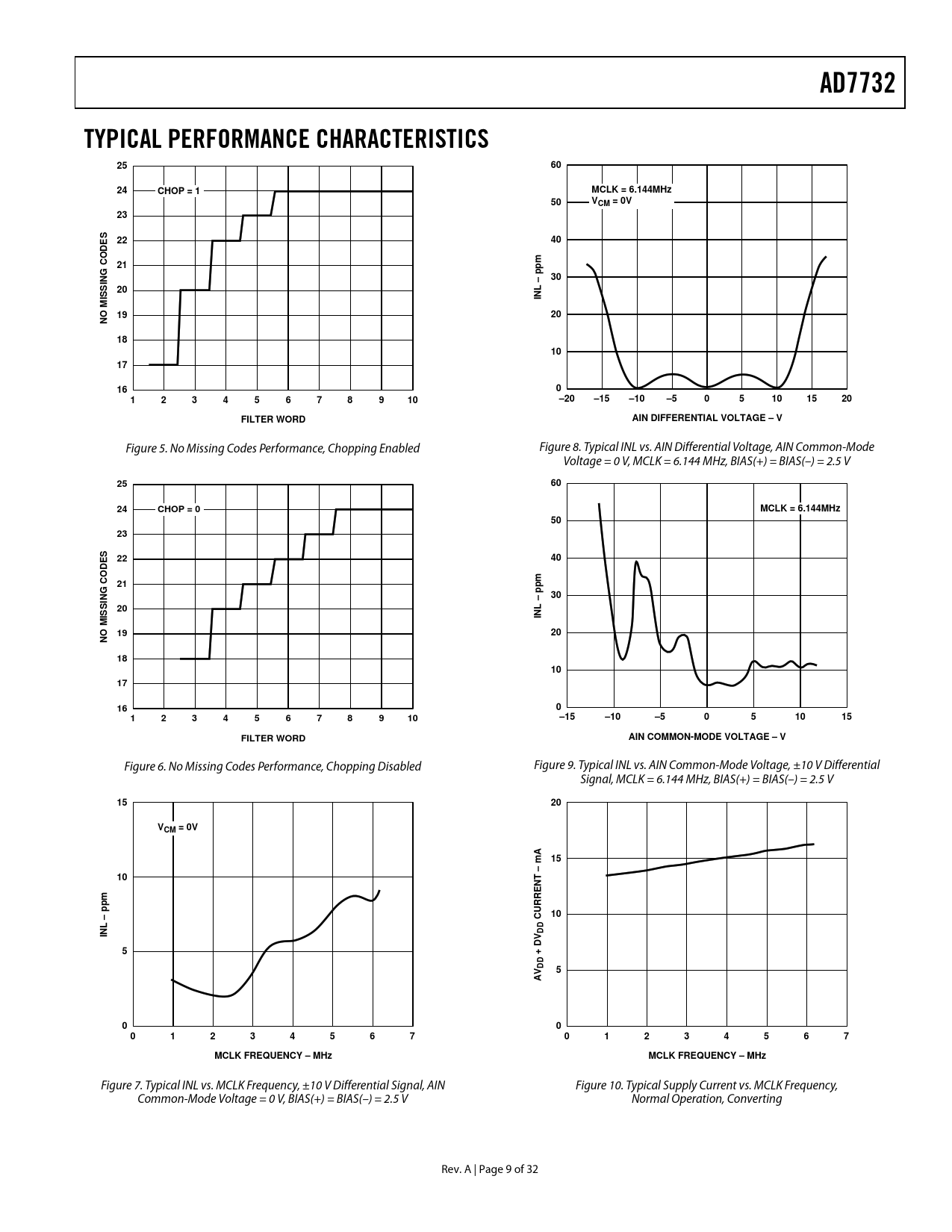 AD7732TYPICAL PERFORMANCE CHARACTERISTICS256024CHOP = 1MCLK = 6.144MHz50VCM = 0V23S224021ppm –30ING CODE S20INL1920NO MIS18101716012345678910–20–15–10–505101520FILTER WORDAIN DIFFERENTIAL VOLTAGE – V Figure 5. No Missing Codes Performance, Chopping Enabled Figure 8. Typical INL vs. AIN Differential Voltage, AIN Common-Mode Voltage = 0 V, MCLK = 6.144 MHz, BIAS(+) = BIAS(–) = 2.5 V 256024CHOP = 0MCLK = 6.144MHz5023S224021ppm –30ING CODE S20INL1920NO MIS18101716012345678910–15–10–5051015FILTER WORDAIN COMMON-MODE VOLTAGE – V Figure 6. No Missing Codes Performance, Chopping Disabled Figure 9. Typical INL vs. AIN Common-Mode Voltage, ±10 V Differential Signal, MCLK = 6.144 MHz, BIAS(+) = BIAS(–) = 2.5 V 1520VCM = 0V15– mA10NTppm –10CURREINLDD5+ DVDD5AV000123456701234567MCLK FREQUENCY – MHzMCLK FREQUENCY – MHz Figure 7. Typical INL vs. MCLK Frequency, ±10 V Differential Signal, AIN Figure 10. Typical Supply Current vs. MCLK Frequency, Common-Mode Voltage = 0 V, BIAS(+) = BIAS(–) = 2.5 V Normal Operation, Converting Rev. A | Page 9 of 32 Document Outline FEATURES APPLICATIONS GENERAL DESCRIPTION FUNCTIONAL BLOCK DIAGRAM REVISION HISTORY AD7732—SPECIFICATIONS Table 1. (–40°C to +105°C; AVDD = 5 V ± 5%; DVDD = 2.7 V to 3.6 V, or 5 V ± 5%; BIAS (all), REFIN(+) = 2.5 V; REFIN(–) = AGND; RA, RB, RC, RD open circuit; AIN Range = ±10 V; fMCLKIN = 6.144 MHz; unless otherwise noted.) TIMING SPECIFICATIONS Table 2. (AVDD = 5 V ± 5%; DVDD = 2.7 V to 3.6 V, or 5 V ± 5%; Input Logic 0 = 0 V; Logic 1 = DVDD; unless otherwise noted.) ABSOLUTE MAXIMUM RATINGS Table 3. TA = 25°C, unless otherwise noted. TYPICAL PERFORMANCE CHARACTERISTICS OUTPUT NOISE AND RESOLUTION SPECIFICATION Chopping Enabled Table 4. Typical Output RMS Noise in µV vs. Conversion Time and Input Range with Chopping Enabled Table 5. Typical Effective Resolution in Bits vs. Conversion Time and Input Range with Chopping Enabled Table 6. Typical Peak-to-Peak Resolution in Bits vs. Conversion Time and Input Range with Chopping Enabled Chopping Disabled Table 7. Typical Output RMS Noise in µV vs. Conversion Time and Input Range with Chopping Disabled Table 8. Typical Effective Resolution in Bits vs. Conversion Time and Input Range with Chopping Disabled Table 9. Typical Peak-to-Peak Resolution in Bits vs. Conversion Time and Input Range with Chopping Disabled PIN CONFIGURATIONS AND FUNCTIONAL DESCRIPTIONS Table 10. Pin Function Descriptions—28-Lead TSSOP REGISTER DESCRIPTION Table 11. Register Summary Table 12. Operational Mode Summary Table 13. Input Range Summary Register Access Communications Register Table 14. I/O Port Register Revision Register Test Register ADC Status Register Checksum Register ADC Zero-Scale Calibration Register ADC Full-Scale Register Channel Data Registers Channel Zero-Scale Calibration Registers Channel Full-Scale Calibration Registers Channel Status Registers Channel Setup Registers Table 15. Channel Conversion Time Registers Mode Register DIGITAL INTERFACE DESCRIPTION Hardware Reset Access the AD7732 Registers Single Conversion and Reading Data Dump Mode Continuous Conversion Mode Continuous Read (Continuous Conversion) Mode CIRCUIT DESCRIPTION Analog Front End Analog Input’s Extended Voltage Range Table 16. Extended Input Voltage Range, Nominal Voltage Range ±10 V, 16 Bits, CLAMP = 0 Table 17. Extended Input Voltage Range, Nominal Voltage Range 0 V to +10 V, 16 Bits, CLAMP = 0 Chopping Multiplexer, Conversion, and Data Output Timing Sigma-Delta ADC Frequency Response Voltage Reference Inputs Reference Detect I/O Port Calibration ADC Zero-Scale Self-Calibration Per Channel System Calibration High Common-Mode Voltage Application OUTLINE DIMENSIONS Ordering Guide