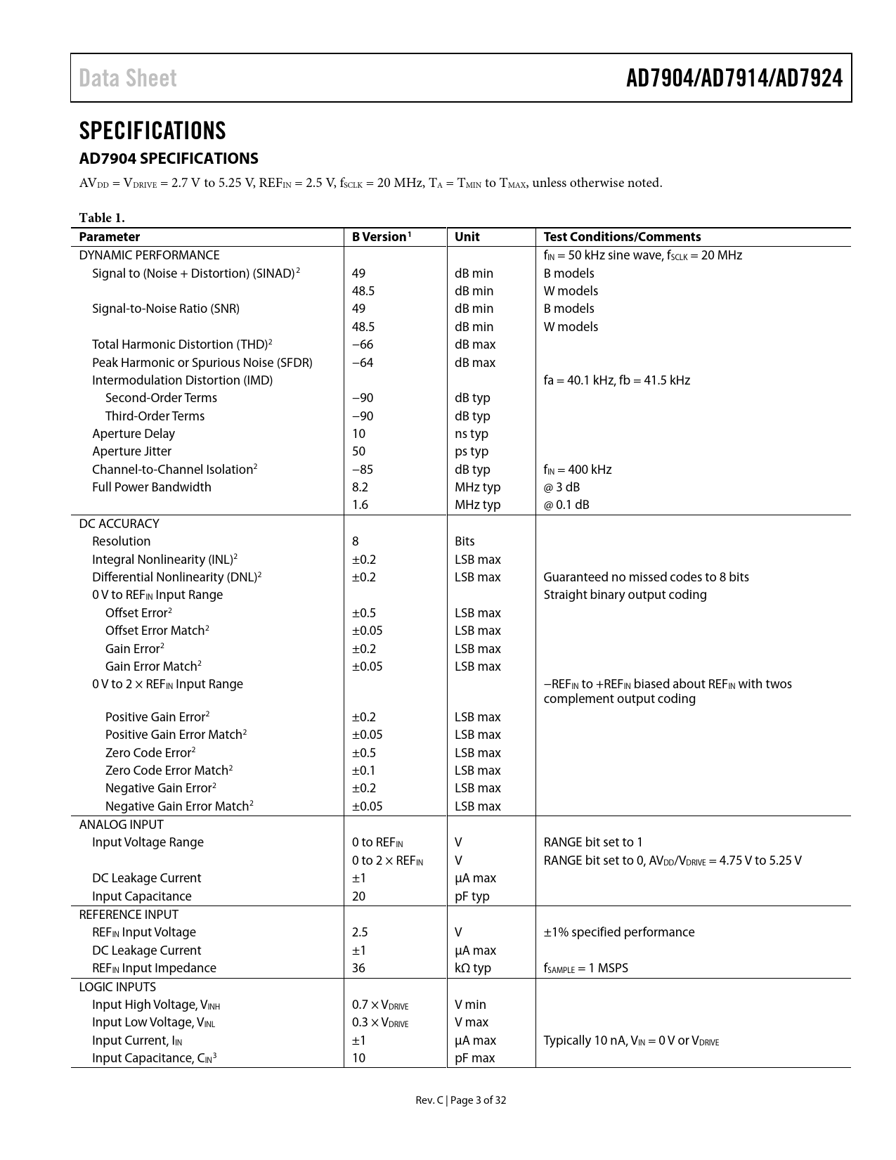 link to page 4 link to page 4 link to page 4 link to page 4 link to page 4 link to page 4 link to page 4 link to page 4 link to page 4 link to page 4 link to page 4 link to page 4 link to page 4 link to page 4 link to page 4 link to page 4 link to page 4 Data SheetAD7904/AD7914/AD7924SPECIFICATIONS AD7904 SPECIFICATIONS AVDD = VDRIVE = 2.7 V to 5.25 V, REFIN = 2.5 V, fSCLK = 20 MHz, TA = TMIN to TMAX, unless otherwise noted. Table 1. ParameterB Version1UnitTest Conditions/Comments DYNAMIC PERFORMANCE fIN = 50 kHz sine wave, fSCLK = 20 MHz Signal to (Noise + Distortion) (SINAD)2 49 dB min B models 48.5 dB min W models Signal-to-Noise Ratio (SNR) 49 dB min B models 48.5 dB min W models Total Harmonic Distortion (THD)2 −66 dB max Peak Harmonic or Spurious Noise (SFDR) −64 dB max Intermodulation Distortion (IMD) fa = 40.1 kHz, fb = 41.5 kHz Second-Order Terms −90 dB typ Third-Order Terms −90 dB typ Aperture Delay 10 ns typ Aperture Jitter 50 ps typ Channel-to-Channel Isolation2 −85 dB typ fIN = 400 kHz Full Power Bandwidth 8.2 MHz typ @ 3 dB 1.6 MHz typ @ 0.1 dB DC ACCURACY Resolution 8 Bits Integral Nonlinearity (INL)2 ±0.2 LSB max Differential Nonlinearity (DNL)2 ±0.2 LSB max Guaranteed no missed codes to 8 bits 0 V to REFIN Input Range Straight binary output coding Offset Error2 ±0.5 LSB max Offset Error Match2 ±0.05 LSB max Gain Error2 ±0.2 LSB max Gain Error Match2 ±0.05 LSB max 0 V to 2 × REFIN Input Range −REFIN to +REFIN biased about REFIN with twos complement output coding Positive Gain Error2 ±0.2 LSB max Positive Gain Error Match2 ±0.05 LSB max Zero Code Error2 ±0.5 LSB max Zero Code Error Match2 ±0.1 LSB max Negative Gain Error2 ±0.2 LSB max Negative Gain Error Match2 ±0.05 LSB max ANALOG INPUT Input Voltage Range 0 to REFIN V RANGE bit set to 1 0 to 2 × REFIN V RANGE bit set to 0, AVDD/VDRIVE = 4.75 V to 5.25 V DC Leakage Current ±1 μA max Input Capacitance 20 pF typ REFERENCE INPUT REFIN Input Voltage 2.5 V ±1% specified performance DC Leakage Current ±1 μA max REFIN Input Impedance 36 kΩ typ fSAMPLE = 1 MSPS LOGIC INPUTS Input High Voltage, VINH 0.7 × VDRIVE V min Input Low Voltage, VINL 0.3 × VDRIVE V max Input Current, IIN ±1 μA max Typically 10 nA, VIN = 0 V or VDRIVE Input Capacitance, C 3 IN 10 pF max Rev. C | Page 3 of 32 Document Outline Features Functional Block Diagram General Description Product Highlights Revision History Specifications AD7904 Specifications AD7914 Specifications AD7924 Specifications Timing Specifications Absolute Maximum Ratings ESD Caution Pin Configuration and Function Descriptions Typical Performance Characteristics Terminology Control Register Sequencer Operation Circuit Information Converter Operation Analog Input ADC Transfer Function Handling Bipolar Input Signals Typical Connection Diagram Analog Input Selection Digital Inputs VDRIVE Reference Modes of Operation Normal Mode (PM1 = PM0 = 1) Full Shutdown Mode (PM1 = 1, PM0 = 0) Auto Shutdown Mode (PM1 = 0, PM0 = 1) Powering Up the AD7904/AD7914/AD7924 Power vs. Throughput Rate Serial Interface Applications Information Microprocessor Interfacing AD7904/AD7914/AD7924 to TMS320C541 AD7904/AD7914/AD7924 to ADSP-218x AD7904/AD7914/AD7924 to DSP563xx Grounding and Layout Outline Dimensions Ordering Guide Automotive Products