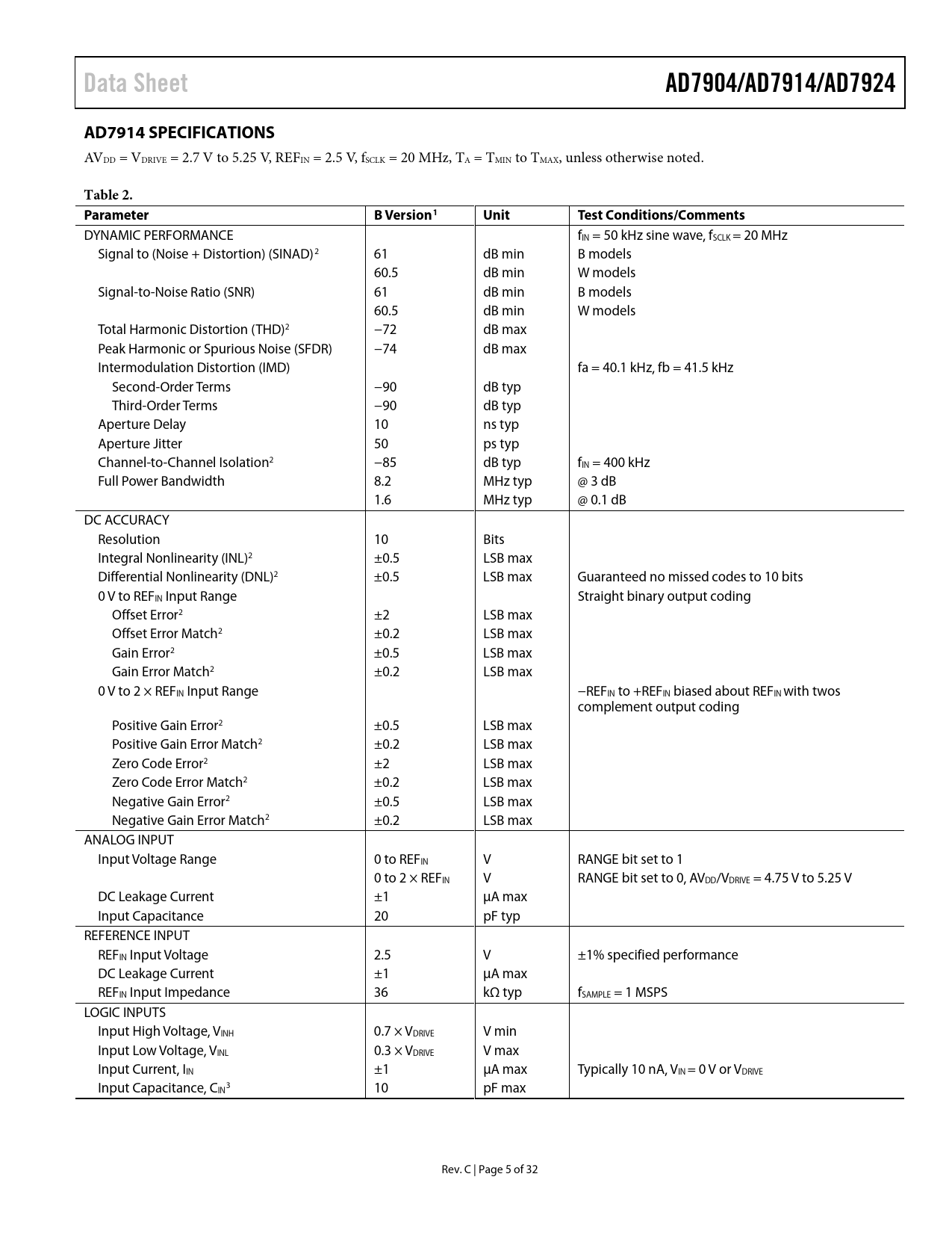 Pages / Page32 / 5 — Data Sheet. AD7904/AD7914/AD7924. AD7914 SPECIFICATIONS. Table 2. …
