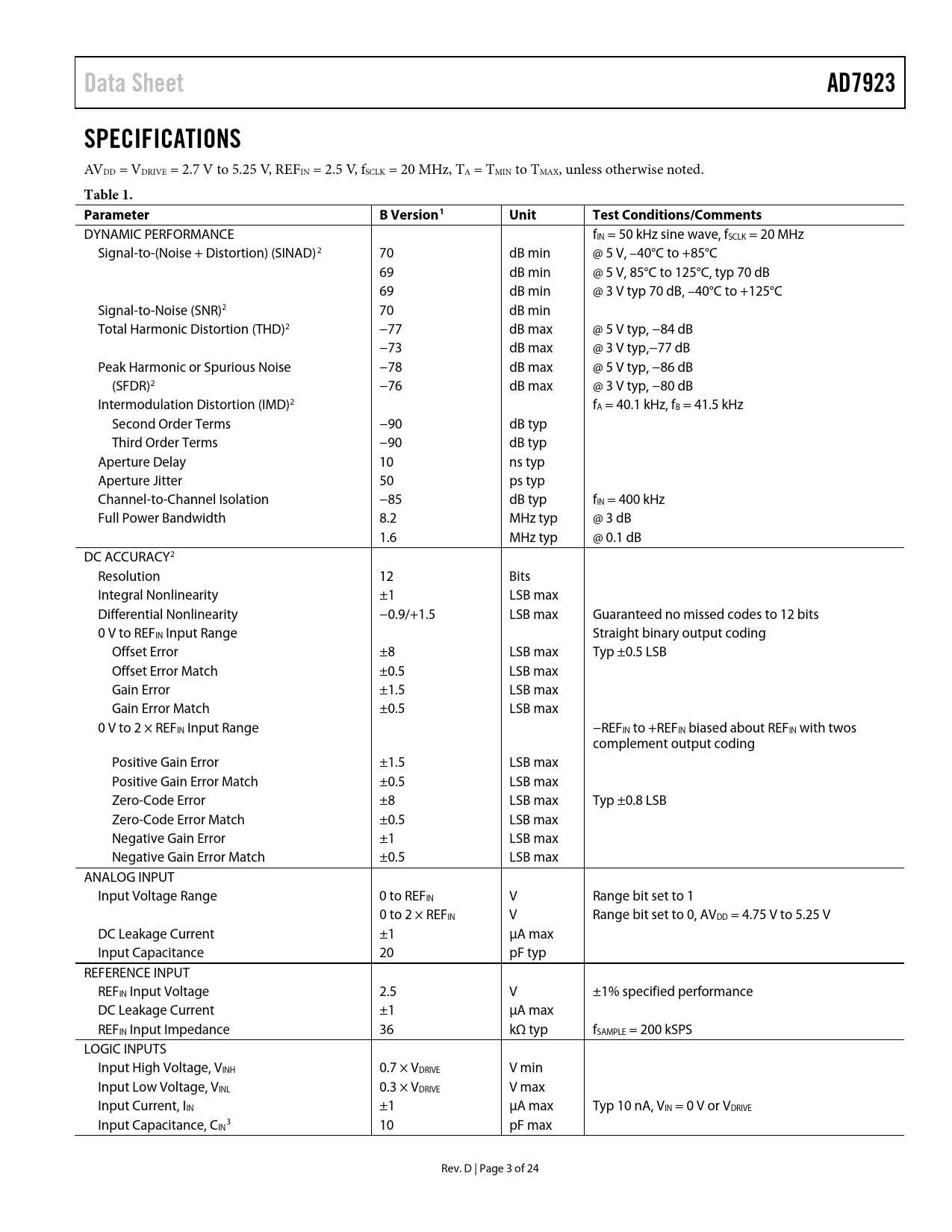 Data Sheet AD7923 SPECIFICATIONS Table 1 Parameter B Version1 Unit Test Conditions/Comments