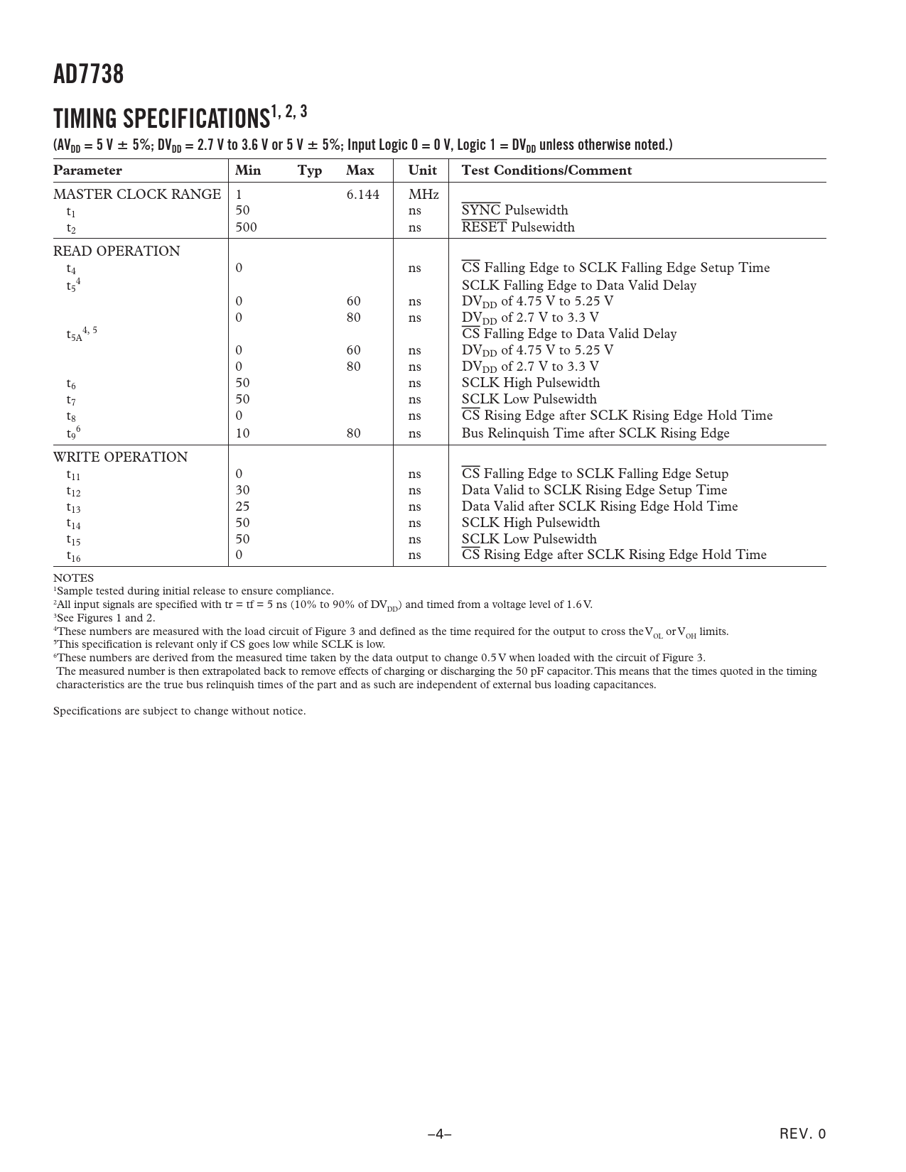 AD7738TIMING SPECIFICATIONS1, 2, 3 (AVDD = 5 V5%; DVDD = 2.7 V to 3.6 V or 5 V5%; Input Logic 0 = 0 V, Logic 1 = DVDD unless otherwise noted.)ParameterMinTypMaxUnitTest Conditions/Comment MASTER CLOCK RANGE 1 6.144 MHz t1 50 ns SYNC Pulsewidth t2 500 ns RESET Pulsewidth READ OPERATION t4 0 ns CS Falling Edge to SCLK Falling Edge Setup Time t 4 5 SCLK Falling Edge to Data Valid Delay 0 60 ns DVDD of 4.75 V to 5.25 V 0 80 ns DVDD of 2.7 V to 3.3 V t 4, 5 CS 5A Falling Edge to Data Valid Delay 0 60 ns DVDD of 4.75 V to 5.25 V 0 80 ns DVDD of 2.7 V to 3.3 V t6 50 ns SCLK High Pulsewidth t7 50 ns SCLK Low Pulsewidth t8 0 ns CS Rising Edge after SCLK Rising Edge Hold Time t 6 9 10 80 ns Bus Relinquish Time after SCLK Rising Edge WRITE OPERATION t11 0 ns CS Falling Edge to SCLK Falling Edge Setup t12 30 ns Data Valid to SCLK Rising Edge Setup Time t13 25 ns Data Valid after SCLK Rising Edge Hold Time t14 50 ns SCLK High Pulsewidth t15 50 ns SCLK Low Pulsewidth t16 0 ns CS Rising Edge after SCLK Rising Edge Hold Time NOTES 1Sample tested during initial release to ensure compliance. 2All input signals are specified with tr = tf = 5 ns (10% to 90% of DV ) and timed from a voltage level of 1.6 V. DD 3See Figures 1 and 2. 4These numbers are measured with the load circuit of Figure 3 and defined as the time required for the output to cross the V or V limits. OL OH 5This specification is relevant only if CS goes low while SCLK is low. 6These numbers are derived from the measured time taken by the data output to change 0.5 V when loaded with the circuit of Figure 3. The measured number is then extrapolated back to remove effects of charging or discharging the 50 pF capacitor. This means that the times quoted in the timing characteristics are the true bus relinquish times of the part and as such are independent of external bus loading capacitances. Specifications are subject to change without notice. –4– REV. 0 Document Outline FEATURES APPLICATIONS GENERAL DESCRIPTION FUNCTIONAL BLOCK DIAGRAM SPECIFICATIONS TIMING SPECIFICATIONS ABSOLUTE MAXIMUM RATINGS ORDERING GUIDE PIN CONFIGURATION PIN FUNCTION DESCRIPTION PIN FUNCTION DESCRIPTION (continued) OUTPUT NOISE AND RESOLUTION SPECIFICATION CHOPPING ENABLED CHOPPING DISABLED Typical Performance Characteristics REGISTER DESCRIPTION Communications Register I/O Port Register Revision Register Test Register ADC Status Register Checksum Register ADC Zero Scale Calibration Register ADC Full-Scale Register Channel Data Registers Channel Zero-Scale Calibration Registers Channel Full-Scale Calibration Registers Channel Status Registers Channel Setup Registers Channel Conversion Time Registers Mode Register DIGITAL INTERFACE DESCRIPTION Hardware Reset Access the AD7738 Registers Single Conversion and Reading Data Dump Mode Continuous Conversion Mode Continuous Read (Continuous Conversion) Mode CIRCUIT DESCRIPTION Analog Front End Sigma-Delta ADC Chopping Multiplexer, Conversion, and Data Output Timing Frequency Response Analog Inputs Voltage Range Analog Inputs Extended Voltage Range Voltage Reference Inputs Reference Detect I/O Port CALIBRATION ADC Zero-Scale Self-Calibration Per Channel System Calibration OUTLINE DIMENSIONS