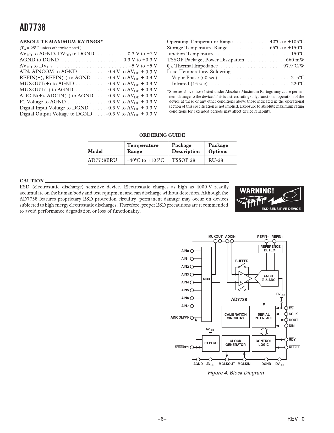 AD7738ABSOLUTE MAXIMUM RATINGS* Operating Temperature Range . –40C to +105C (T Storage Temperature Range . –65C to +150C A = 25C unless otherwise noted.) AVDD to AGND, DVDD to DGND . –0.3 V to +7 V Junction Temperature . 150C AGND to DGND . –0.3 V to +0.3 V TSSOP Package, Power Dissipation . 660 mW AVDD to DVDD . –5 V to +5 V JA Thermal Impedance . 97.9C/W AIN, AINCOM to AGND . –0.3 V to AVDD + 0.3 V Lead Temperature, Soldering REFIN(+), REFIN(–) to AGND . –0.3 V to AVDD + 0.3 V Vapor Phase (60 sec) . 215C MUXOUT(+) to AGND . –0.3 V to AVDD + 0.3 V Infrared (15 sec) . 220C MUXOUT(–) to AGND . –0.3 V to AVDD + 0.3 V *Stresses above those listed under Absolute Maximum Ratings may cause perma- ADCIN(+), ADCIN(–) to AGND . –0.3 V to AVDD + 0.3 V nent damage to the device. This is a stress rating only; functional operation of the P1 Voltage to AGND . –0.3 V to AV device at these or any other conditions above those indicated in the operational DD + 0.3 V Digital Input Voltage to DGND . –0.3 V to AV section of this specification is not implied. Exposure to absolute maximum rating DD + 0.3 V conditions for extended periods may affect device reliability. Digital Output Voltage to DGND . –0.3 V to AVDD + 0.3 V ORDERING GUIDETemperaturePackagePackageModelRangeDescriptionOptions AD7738BRU –40C to +105C TSSOP 28 RU-28 CAUTION ESD (electrostatic discharge) sensitive device. Electrostatic charges as high as 4000 V readily accumulate on the human body and test equipment and can discharge without detection. Although the AD7738 features proprietary ESD protection circuitry, permanent damage may occur on devices subjected to high energy electrostatic discharges. Therefore, proper ESD precautions are recommended to avoid performance degradation or loss of functionality. MUXOUT ADCINREFIN– REFIN+REFERENCEAIN0DETECTAIN1BUFFERAIN2AIN324-BITMUX-ADCAIN4AIN5DVDDAIN6AD7738AIN7CSCALIBRATIONSERIALSCLKAINCOM/P0CIRCUITRYINTERFACEDOUTDINAVDDRDYCLOCKCONTROLI/O PORTGENERATORLOGICSYNC/P1RESETAGNDAVMCLKOUT MCLKINDGNDDVDDDD Figure 4. Block Diagram –6– REV. 0 Document Outline FEATURES APPLICATIONS GENERAL DESCRIPTION FUNCTIONAL BLOCK DIAGRAM SPECIFICATIONS TIMING SPECIFICATIONS ABSOLUTE MAXIMUM RATINGS ORDERING GUIDE PIN CONFIGURATION PIN FUNCTION DESCRIPTION PIN FUNCTION DESCRIPTION (continued) OUTPUT NOISE AND RESOLUTION SPECIFICATION CHOPPING ENABLED CHOPPING DISABLED Typical Performance Characteristics REGISTER DESCRIPTION Communications Register I/O Port Register Revision Register Test Register ADC Status Register Checksum Register ADC Zero Scale Calibration Register ADC Full-Scale Register Channel Data Registers Channel Zero-Scale Calibration Registers Channel Full-Scale Calibration Registers Channel Status Registers Channel Setup Registers Channel Conversion Time Registers Mode Register DIGITAL INTERFACE DESCRIPTION Hardware Reset Access the AD7738 Registers Single Conversion and Reading Data Dump Mode Continuous Conversion Mode Continuous Read (Continuous Conversion) Mode CIRCUIT DESCRIPTION Analog Front End Sigma-Delta ADC Chopping Multiplexer, Conversion, and Data Output Timing Frequency Response Analog Inputs Voltage Range Analog Inputs Extended Voltage Range Voltage Reference Inputs Reference Detect I/O Port CALIBRATION ADC Zero-Scale Self-Calibration Per Channel System Calibration OUTLINE DIMENSIONS