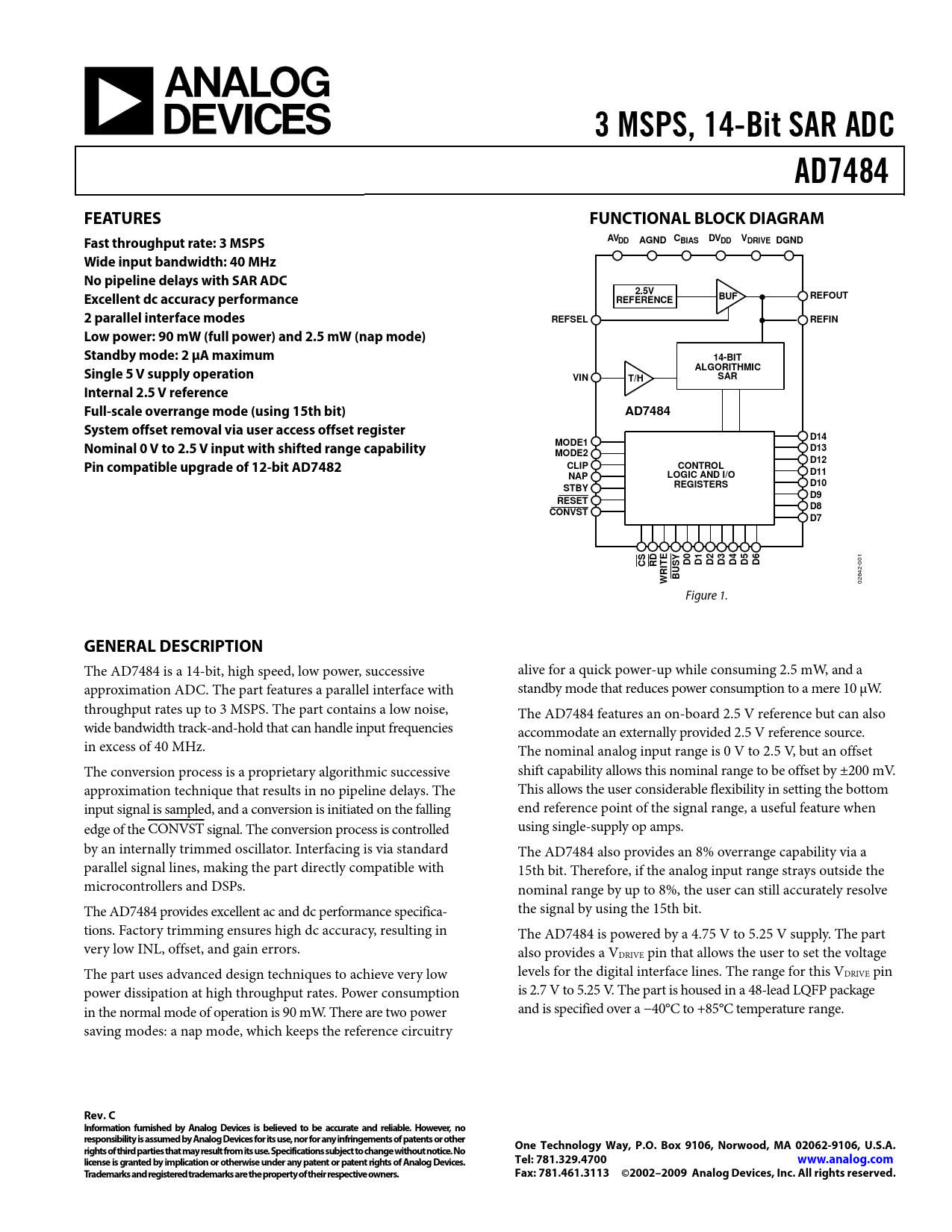| Pages / Page | 21 / 1 — 3 MSPS, 14-Bit SAR ADC. AD7484. FEATURES. FUNCTIONAL BLOCK DIAGRAM. Fast … |