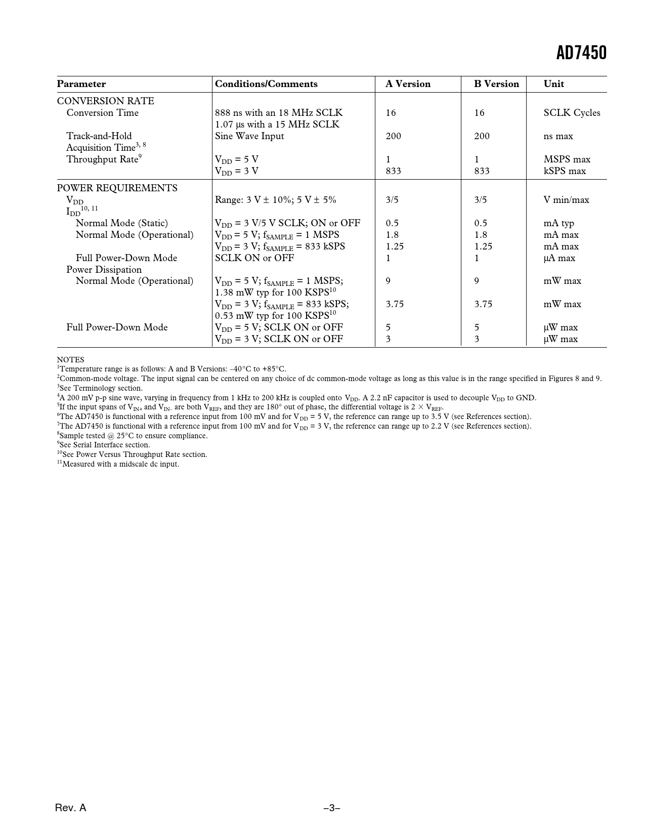 AD7450ParameterConditions/CommentsA VersionB VersionUnit CONVERSION RATE Conversion Time 888 ns with an 18 MHz SCLK 16 16 SCLK Cycles 1.07 µs with a 15 MHz SCLK Track-and-Hold Sine Wave Input 200 200 ns max Acquisition Time3, 8 Throughput Rate9 VDD = 5 V 1 1 MSPS max VDD = 3 V 833 833 kSPS max POWER REQUIREMENTS VDD Range: 3 V ± 10%; 5 V ± 5% 3/5 3/5 V min/max I 10, 11 DD Normal Mode (Static) VDD = 3 V/5 V SCLK; ON or OFF 0.5 0.5 mA typ Normal Mode (Operational) VDD = 5 V; fSAMPLE = 1 MSPS 1.8 1.8 mA max VDD = 3 V; fSAMPLE = 833 kSPS 1.25 1.25 mA max Full Power-Down Mode SCLK ON or OFF 1 1 µA max Power Dissipation Normal Mode (Operational) VDD = 5 V; fSAMPLE = 1 MSPS; 9 9 mW max 1.38 mW typ for 100 KSPS10 VDD = 3 V; fSAMPLE = 833 kSPS; 3.75 3.75 mW max 0.53 mW typ for 100 KSPS10 Full Power-Down Mode VDD = 5 V; SCLK ON or OFF 5 5 µW max VDD = 3 V; SCLK ON or OFF 3 3 µW max NOTES 1Temperature range is as follows: A and B Versions: –40°C to +85°C. 2Common-mode voltage. The input signal can be centered on any choice of dc common-mode voltage as long as this value is in the range specified in Figures 8 and 9. 3See Terminology section. 4A 200 mV p-p sine wave, varying in frequency from 1 kHz to 200 kHz is coupled onto VDD. A 2.2 nF capacitor is used to decouple VDD to GND. 5If the input spans of VIN+ and VIN– are both VREF, and they are 180° out of phase, the differential voltage is 2 ⫻ VREF. 6The AD7450 is functional with a reference input from 100 mV and for V DD = 5 V, the reference can range up to 3.5 V (see References section). 7The AD7450 is functional with a reference input from 100 mV and for V DD = 3 V, the reference can range up to 2.2 V (see References section). 8Sample tested @ 25°C to ensure compliance. 9See Serial Interface section. 10See Power Versus Throughput Rate section. 11Measured with a midscale dc input. Rev. A –3–