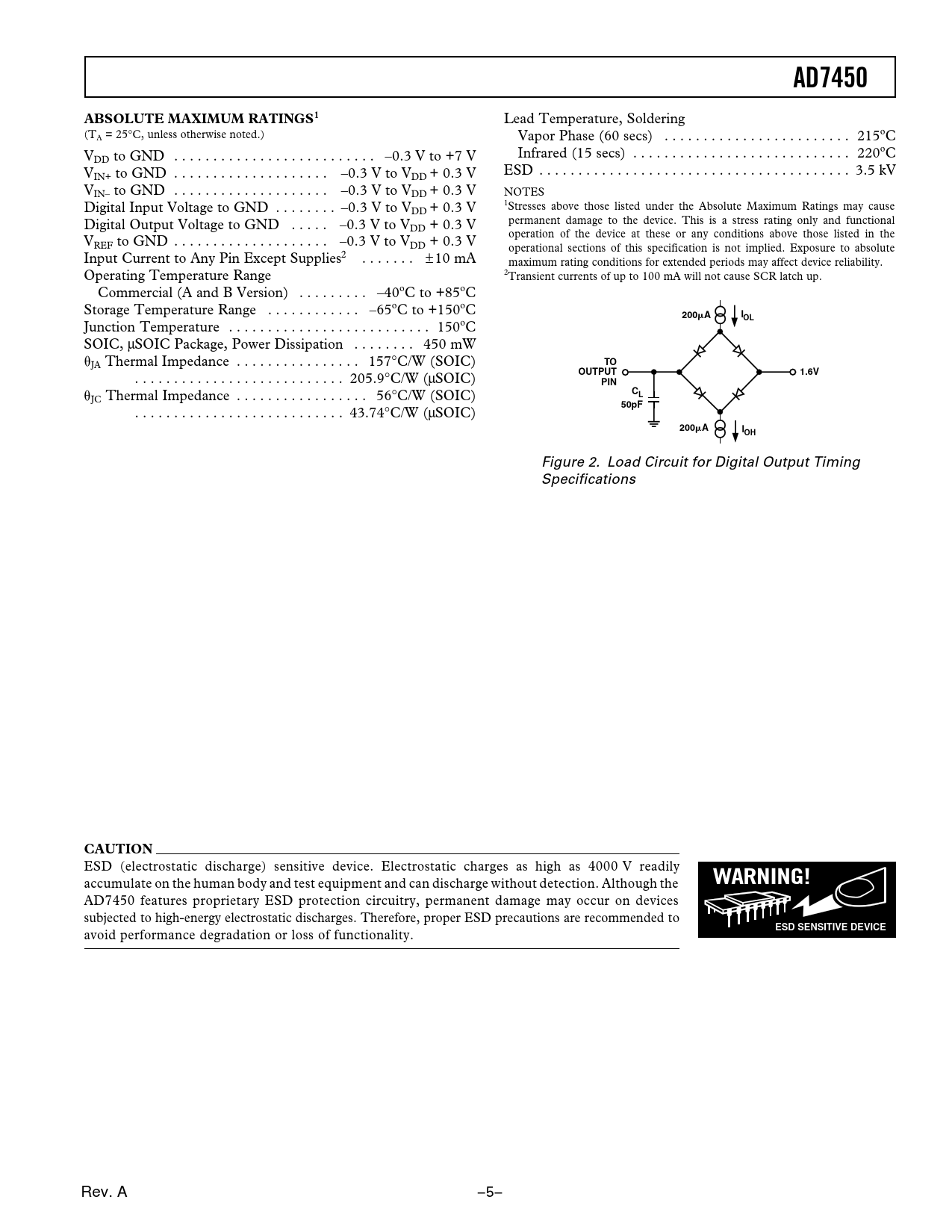 AD7450. ABSOLUTE MAXIMUM RATINGS1. 200. IOL. OUTPUT. 1.6V. PIN. 50pF. IOH. CAUTION. WARNING!. ESD SENSITIVE DEVICE