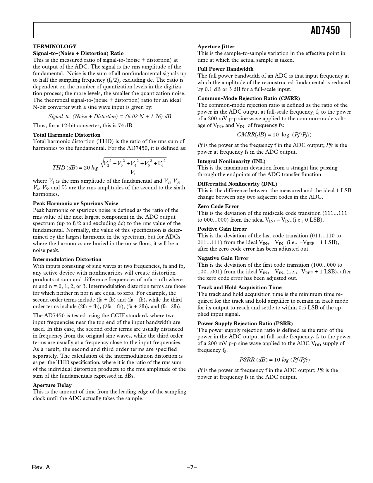 CMRR(dB) = 10 log (Pf /Pfs) Total harmonic distortion (THD) is the ratio of the rms sum of Pf is the power at the frequency f in the ADC output; Pfs is the harmonics to the fundamental. For the AD7450, it is defined as: power at frequency fs in the ADC output. 2 2 2 2 2 V +V