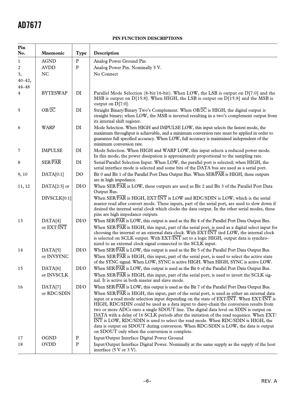 AD7677 PIN FUNCTION DESCRIPTIONS Pin No Mnemonic Type Description