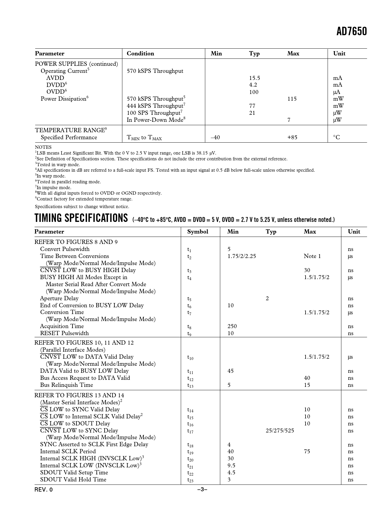 AD7650AD7650ParameterConditionMinTypMaxUnit POWER SUPPLIES (continued) Operating Current5 570 kSPS Throughput AVDD 15.5 mA DVDD6 4.2 mA OVDD6 100 µA Power Dissipation6 570 kSPS Throughput5 115 mW 444 kSPS Throughput7 77 mW 100 SPS Throughput7 21 µW In Power-Down Mode8 7 µW TEMPERATURE RANGE9 Specified Performance TMIN to TMAX –40 +85 °C NOTES 1LSB means Least Significant Bit. With the 0 V to 2.5 V input range, one LSB is 38.15 µV. 2See Definition of Specifications section. These specifications do not include the error contribution from the external reference. 3Tested in warp mode. 4All specifications in dB are referred to a full-scale input FS. Tested with an input signal at 0.5 dB below full-scale unless otherwise specified. 5In warp mode. 6Tested in parallel reading mode. 7In impulse mode. 8With all digital inputs forced to OVDD or OGND respectively. 9Contact factory for extended temperature range. Specifications subject to change without notice. TIMING SPECIFICATIONS (–40 ⴗ C to +85 ⴗ C, AVDD = DVDD = 5 V, OVDD = 2.7 V to 5.25 V, unless otherwise noted.) ParameterSymbolMinTypMaxUnit REFER TO FIGURES 8 AND 9 Convert Pulsewidth t1 5 ns Time Between Conversions t2 1.75/2/2.25 Note 1 µs (Warp Mode/Normal Mode/Impulse Mode) CNVST LOW to BUSY HIGH Delay t3 30 ns BUSY HIGH All Modes Except in t4 1.5/1.75/2 µs Master Serial Read After Convert Mode (Warp Mode/Normal Mode/Impulse Mode) Aperture Delay t5 2 ns End of Conversion to BUSY LOW Delay t6 10 ns Conversion Time t7 1.5/1.75/2 µs (Warp Mode/Normal Mode/Impulse Mode) Acquisition Time t8 250 ns RESET Pulsewidth t9 10 ns REFER TO FIGURES 10, 11 AND 12 (Parallel Interface Modes) CNVST LOW to DATA Valid Delay t10 1.5/1.75/2 µs (Warp Mode/Normal Mode/Impulse Mode) DATA Valid to BUSY LOW Delay t11 45 ns Bus Access Request to DATA Valid t12 40 ns Bus Relinquish Time t13 5 15 ns REFER TO FIGURES 13 AND 14 (Master Serial Interface Modes)2 CS LOW to SYNC Valid Delay t14 10 ns CS LOW to Internal SCLK Valid Delay2 t15 10 ns CS LOW to SDOUT Delay t16 10 ns CNVST LOW to SYNC Delay t17 25/275/525 ns (Warp Mode/Normal Mode/Impulse Mode) SYNC Asserted to SCLK First Edge Delay t18 4 ns Internal SCLK Period t19 40 75 ns Internal SCLK HIGH (INVSCLK Low)3 t20 30 ns Internal SCLK LOW (INVSCLK Low)3 t21 9.5 ns SDOUT Valid Setup Time t22 4.5 ns SDOUT Valid Hold Time t23 3 ns REV. 0 –3–