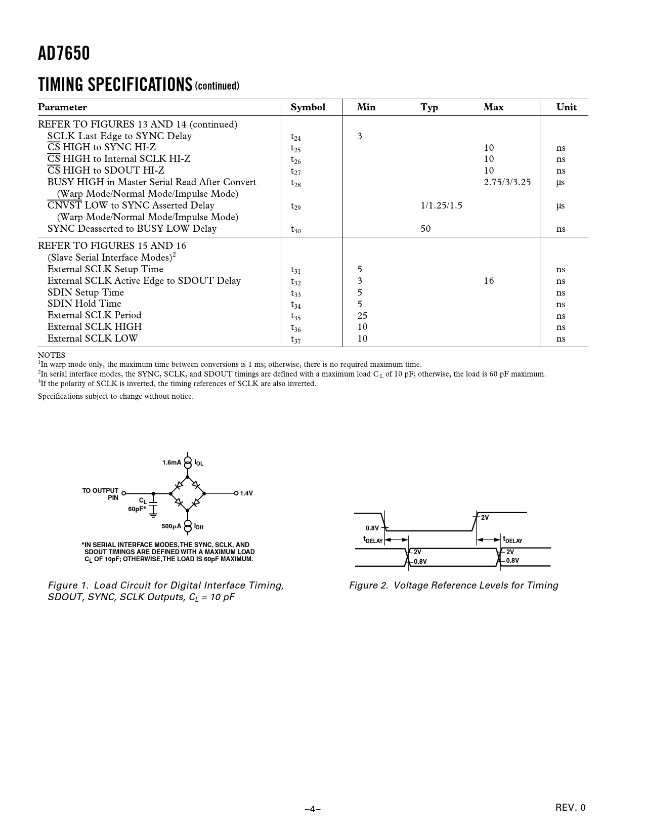 AD7650TIMING SPECIFICATIONS (continued)ParameterSymbolMinTypMaxUnit REFER TO FIGURES 13 AND 14 (continued) SCLK Last Edge to SYNC Delay t24 3 CS HIGH to SYNC HI-Z t25 10 ns CS HIGH to Internal SCLK HI-Z t26 10 ns CS HIGH to SDOUT HI-Z t27 10 ns BUSY HIGH in Master Serial Read After Convert t28 2.75/3/3.25 µs (Warp Mode/Normal Mode/Impulse Mode) CNVST LOW to SYNC Asserted Delay t29 1/1.25/1.5 µs (Warp Mode/Normal Mode/Impulse Mode) SYNC Deasserted to BUSY LOW Delay t30 50 ns REFER TO FIGURES 15 AND 16 (Slave Serial Interface Modes)2 External SCLK Setup Time t31 5 ns External SCLK Active Edge to SDOUT Delay t32 3 16 ns SDIN Setup Time t33 5 ns SDIN Hold Time t34 5 ns External SCLK Period t35 25 ns External SCLK HIGH t36 10 ns External SCLK LOW t37 10 ns NOTES 1In warp mode only, the maximum time between conversions is 1 ms; otherwise, there is no required maximum time. 2In serial interface modes, the SYNC, SCLK, and SDOUT timings are defined with a maximum load C L of 10 pF; otherwise, the load is 60 pF maximum. 3If the polarity of SCLK is inverted, the timing references of SCLK are also inverted. Specifications subject to change without notice. 1.6mAIOLTO OUTPUT1.4VPINCL60pF*2V500I AOH0.8VttDELAYDELAY*IN SERIAL INTERFACE MODES, THE SYNC, SCLK, AND SDOUT TIMINGS ARE DEFINED WITH A MAXIMUM LOAD2V2VCL OF 10pF; OTHERWISE, THE LOAD IS 60pF MAXIMUM.0.8V0.8V Figure 1. Load Circuit for Digital Interface Timing, Figure 2. Voltage Reference Levels for Timing SDOUT, SYNC, SCLK Outputs, CL = 10 pF REV. 0 –4–