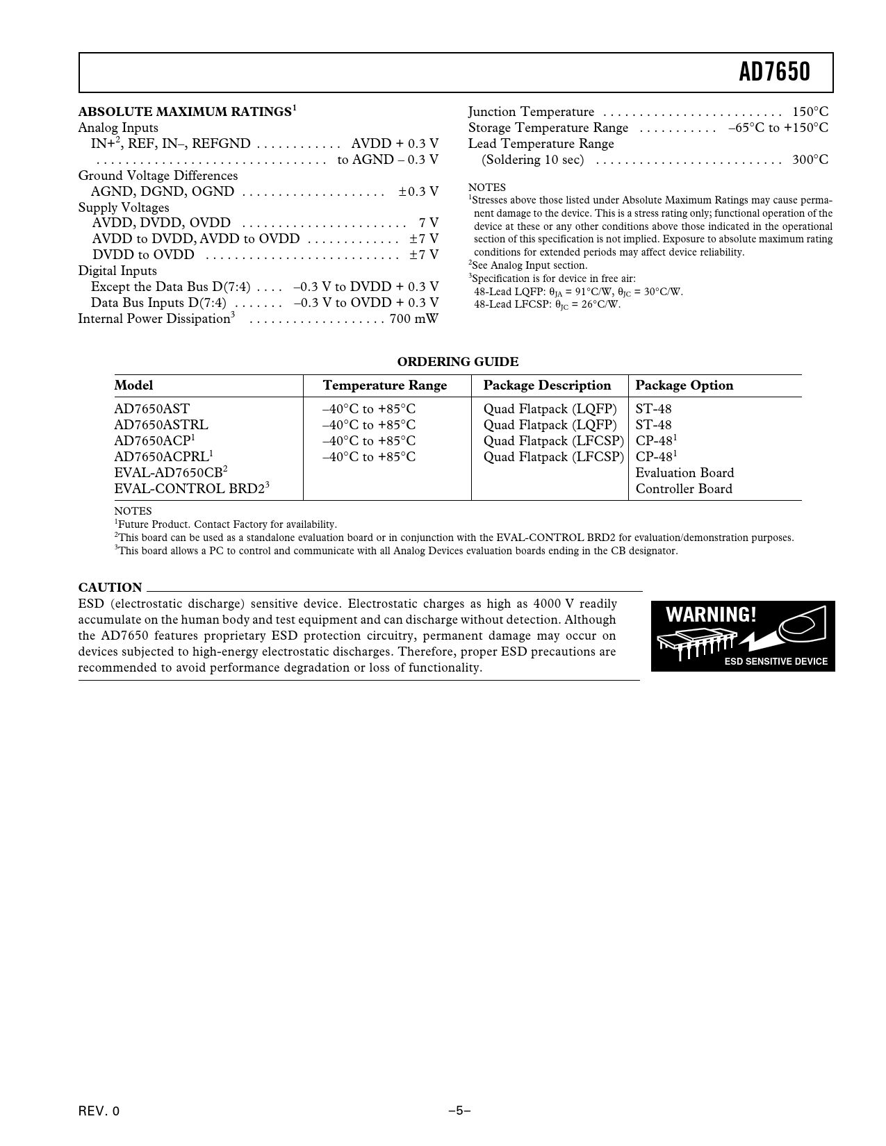 AD7650. ABSOLUTE MAXIMUM RATINGS1. ORDERING GUIDE. Model. Temperature Range. Package Description. Package Option. CAUTION. WARNING!