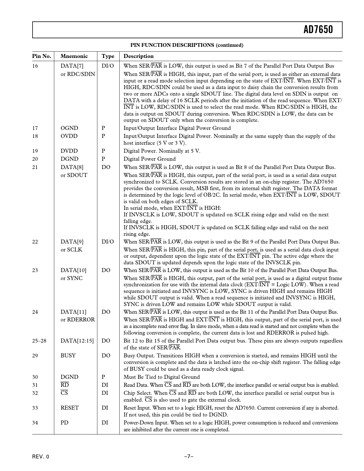 AD7650PIN FUNCTION DESCRIPTIONS (continued)Pin No.MnemonicTypeDescription 16 DATA[7] DI/O When SER/PAR is LOW, this output is used as Bit 7 of the Parallel Port Data Output Bus or RDC/SDIN When SER/PAR is HIGH, this input, part of the serial port, is used as either an external data input or a read mode selection input depending on the state of EXT/INT. When EXT/INT is HIGH, RDC/SDIN could be used as a data input to daisy chain the conversion results from two or more ADCs onto a single SDOUT line. The digital data level on SDIN is output on DATA with a delay of 16 SCLK periods after the initiation of the read sequence. When EXT/ INT is LOW, RDC/SDIN is used to select the read mode. When RDC/SDIN is HIGH, the data is output on SDOUT during conversion. When RDC/SDIN is LOW, the data can be output on SDOUT only when the conversion is complete. 17 OGND P Input/Output Interface Digital Power Ground 18 OVDD P Input/Output Interface Digital Power. Nominally at the same supply than the supply of the host interface (5 V or 3 V). 19 DVDD P Digital Power. Nominally at 5 V. 20 DGND P Digital Power Ground 21 DATA[8] DO When SER/PAR is LOW, this output is used as Bit 8 of the Parallel Port Data Output Bus. or SDOUT When SER/PAR is HIGH, this output, part of the serial port, is used as a serial data output synchronized to SCLK. Conversion results are stored in an on-chip register. The AD7650 provides the conversion result, MSB first, from its internal shift register. The DATA format is determined by the logic level of OB/2C. In serial mode, when EXT/INT is LOW, SDOUT is valid on both edges of SCLK. In serial mode, when EXT/INT is HIGH: If INVSCLK is LOW, SDOUT is updated on SCLK rising edge and valid on the next falling edge. If INVSCLK is HIGH, SDOUT is updated on SCLK falling edge and valid on the next rising edge. 22 DATA[9] DI/O When SER/PAR is LOW, this output is used as the Bit 9 of the Parallel Port Data Output Bus. or SCLK When SER/PAR is HIGH, this pin, part of the serial port, is used as a serial data clock input or output, dependent upon the logic state of the EXT/INT pin. The active edge where the data SDOUT is updated depends upon the logic state of the INVSCLK pin. 23 DATA[10] DO When SER/PAR is LOW, this output is used as the Bit 10 of the Parallel Port Data Output Bus. or SYNC When SER/PAR is HIGH, this output, part of the serial port, is used as a digital output frame synchronization for use with the internal data clock (EXT/INT = Logic LOW). When a read sequence is initiated and INVSYNC is LOW, SYNC is driven HIGH and remains HIGH while SDOUT output is valid. When a read sequence is initiated and INVSYNC is HIGH, SYNC is driven LOW and remains LOW while SDOUT output is valid. 24 DATA[11] DO When SER/PAR is LOW, this output is used as the Bit 11 of the Parallel Port Data Output Bus. or RDERROR When SER/PAR is HIGH and EXT/INT is HIGH, this output, part of the serial port, is used as a incomplete read error flag. In slave mode, when a data read is started and not complete when the following conversion is complete, the current data is lost and RDERROR is pulsed high. 25–28 DATA[12:15] DO Bit 12 to Bit 15 of the Parallel Port Data output bus. These pins are always outputs regardless of the state of SER/PAR. 29 BUSY DO Busy Output. Transitions HIGH when a conversion is started, and remains HIGH until the conversion is complete and the data is latched into the on-chip shift register. The falling edge of BUSY could be used as a data ready clock signal. 30 DGND P Must Be Tied to Digital Ground 31 RD DI Read Data. When CS and RD are both LOW, the interface parallel or serial output bus is enabled. 32 CS DI Chip Select. When CS and RD are both LOW, the interface parallel or serial output bus is enabled. CS is also used to gate the external clock. 33 RESET DI Reset Input. When set to a logic HIGH, reset the AD7650. Current conversion if any is aborted. If not used, this pin could be tied to DGND. 34 PD DI Power-Down Input. When set to a logic HIGH, power consumption is reduced and conversions are inhibited after the current one is completed. REV. 0 –7–
