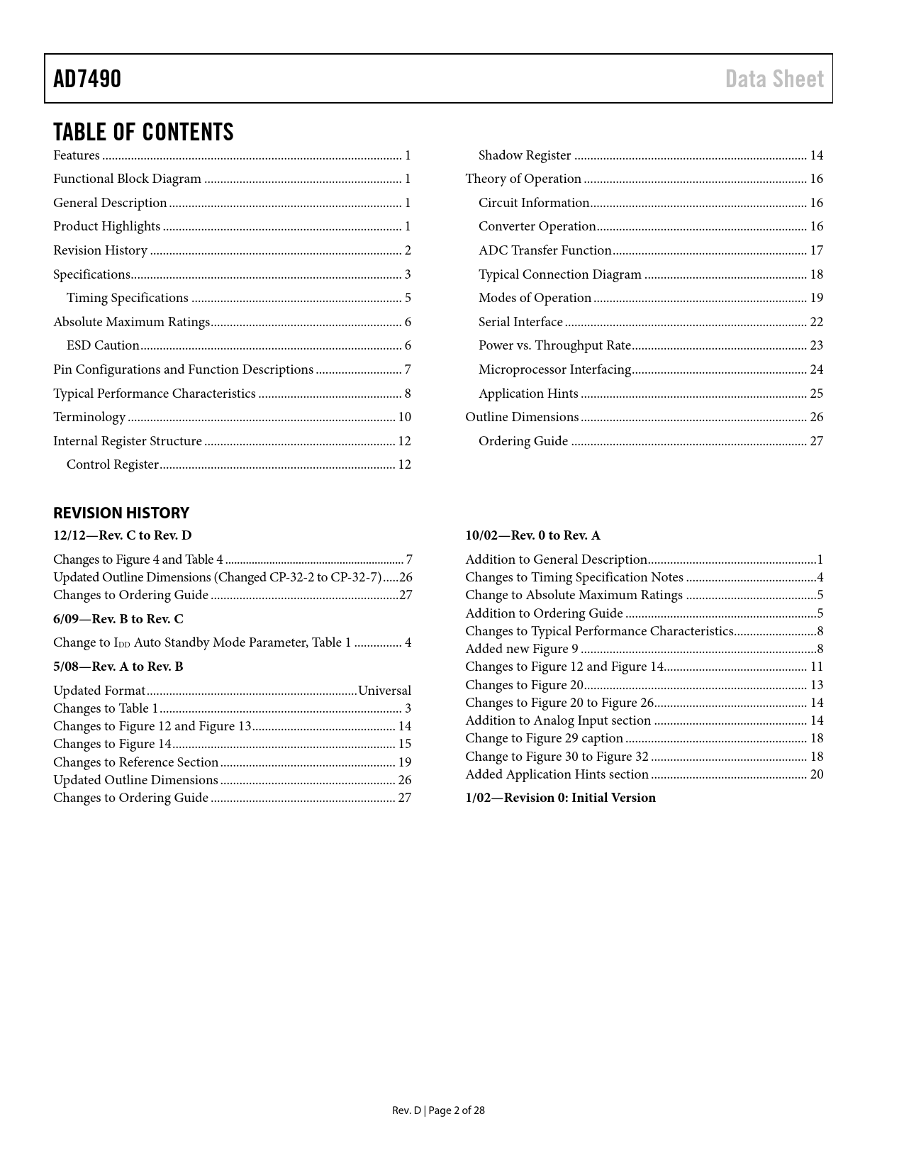 link to page 1 link to page 1 link to page 1 link to page 1 link to page 3 link to page 4 link to page 6 link to page 7 link to page 7 link to page 8 link to page 9 link to page 11 link to page 13 link to page 13 link to page 15 link to page 17 link to page 17 link to page 17 link to page 18 link to page 19 link to page 20 link to page 23 link to page 24 link to page 25 link to page 26 link to page 27 link to page 28 link to page 10 link to page 15 link to page 16 link to page 18 link to page 18 link to page 22 link to page 24 link to page 25 link to page 26 AD7490Data SheetTABLE OF CONTENTS Features .. 1 Shadow Register ... 14 Functional Block Diagram .. 1 Theory of Operation .. 16 General Description ... 1 Circuit Information .. 16 Product Highlights ... 1 Converter Operation .. 16 Revision History ... 2 ADC Transfer Function ... 17 Specifications ... 3 Typical Connection Diagram ... 18 Timing Specifications .. 5 Modes of Operation ... 19 Absolute Maximum Ratings .. 6 Serial Interface .. 22 ESD Caution .. 6 Power vs. Throughput Rate ... 23 Pin Configurations and Function Descriptions ... 7 Microprocessor Interfacing ... 24 Typical Performance Characteristics ... 8 Application Hints ... 25 Terminology .. 10 Outline Dimensions ... 26 Internal Register Structure .. 12 Ordering Guide .. 27 Control Register .. 12 REVISION HISTORY 12/12—Rev. C to Rev. D10/02—Rev. 0 to Rev. A Changes to Figure 4 and Table 4 ... 7 Addition to General Description... 1 Updated Outline Dimensions (Changed CP-32-2 to CP-32-7) ... 26 Changes to Timing Specification Notes ... 4 Changes to Ordering Guide ... 27 Change to Absolute Maximum Ratings ... 5 6/09—Rev. B to Rev. C Addition to Ordering Guide .. 5 Changes to Typical Performance Characteristics .. 8 Change to IDD Auto Standby Mode Parameter, Table 1 ... 4 Added new Figure 9 .. 8 5/08—Rev. A to Rev. B Changes to Figure 12 and Figure 14... 11 Updated Format .. Universal Changes to Figure 20 .. 13 Changes to Table 1 .. 3 Changes to Figure 20 to Figure 26 .. 14 Changes to Figure 12 and Figure 13 ... 14 Addition to Analog Input section .. 14 Changes to Figure 14 .. 15 Change to Figure 29 caption ... 18 Changes to Reference Section ... 19 Change to Figure 30 to Figure 32 ... 18 Updated Outline Dimensions ... 26 Added Application Hints section ... 20 Changes to Ordering Guide .. 27 1/02—Revision 0: Initial Version Rev. D | Page 2 of 28 Document Outline Features Functional Block Diagram General Description Product Highlights Revision History Specifications Timing Specifications Absolute Maximum Ratings ESD Caution Pin Configurations and Function Descriptions Typical Performance Characteristics Terminology Internal Register Structure Control Register Sequencer Operation Shadow Register Theory of Operation Circuit Information Converter Operation Analog Input ADC Transfer Function Handling Bipolar Input Signals Typical Connection Diagram Analog Input Channels Digital Input VDRIVE Reference Section Modes of Operation Normal Mode (PM1 = PM0 = 1) Full Shutdown (PM1 = 1, PM0 = 0) Auto Shutdown (PM1 = 0, PM0 = 1) Auto Standby (PM1 = PM0 = 0) Powering Up the AD7490 Serial Interface Power vs. Throughput Rate Microprocessor Interfacing AD7490 to TMS320C541 AD7490 to ADSP-21xx AD7490 to DSP563xx Application Hints Grounding and Layout PCB Design Guidelines for Chip Scale Package Evaluating the AD7490 Performance Outline Dimensions Ordering Guide