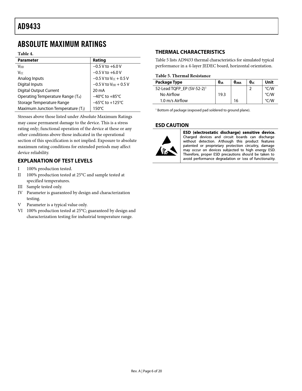 AD9433 ABSOLUTE MAXIMUM RATINGS Table 4 THERMAL CHARACTERISTICS Parameter Rating Table 5 Thermal Resistance Package Type