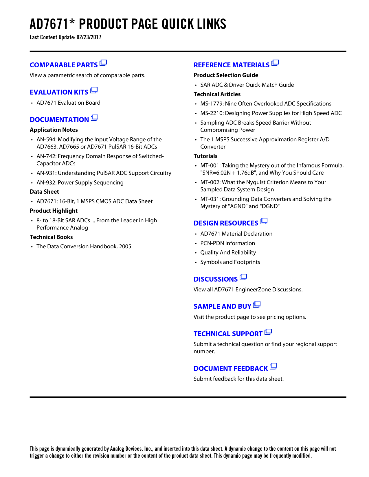 AD7671* PRODUCT PAGE QUICK LINKS Last Content Update: 02/23/2017COMPARABLE PARTSREFERENCE MATERIALS View a parametric search of comparable parts. Product Selection Guide • SAR ADC & Driver Quick-Match Guide EVALUATION KITSTechnical Articles • AD7671 Evaluation Board • MS-1779: Nine Often Overlooked ADC Specifications • MS-2210: Designing Power Supplies for High Speed ADC DOCUMENTATION • Sampling ADC Breaks Speed Barrier Without Application Notes Compromising Power • AN-594: Modifying the Input Voltage Range of the • The 1 MSPS Successive Approximation Register A/D AD7663, AD7665 or AD7671 PulSAR 16-Bit ADCs Converter • AN-742: Frequency Domain Response of Switched- Tutorials Capacitor ADCs • MT-001: Taking the Mystery out of the Infamous Formula, • AN-931: Understanding PulSAR ADC Support Circuitry "SNR=6.02N + 1.76dB", and Why You Should Care • AN-932: Power Supply Sequencing • MT-002: What the Nyquist Criterion Means to Your Data Sheet Sampled Data System Design • AD7671: 16-Bit, 1 MSPS CMOS ADC Data Sheet • MT-031: Grounding Data Converters and Solving the Mystery of "AGND" and "DGND" Product Highlight • 8- to 18-Bit SAR ADCs ... From the Leader in High DESIGN RESOURCES Performance Analog • AD7671 Material Declaration Technical Books • PCN-PDN Information • The Data Conversion Handbook, 2005 • Quality And Reliability • Symbols and Footprints DISCUSSIONS View all AD7671 EngineerZone Discussions. SAMPLE AND BUY Visit the product page to see pricing options. TECHNICAL SUPPORT Submit a technical question or find your regional support number. DOCUMENT FEEDBACK Submit feedback for this data sheet. This page is dynamically generated by Analog Devices, Inc., and inserted into this data sheet. A dynamic change to the content on this page will not trigger a change to either the revision number or the content of the product data sheet. This dynamic page may be frequently modified. Document Outline FEATURES APPLICATIONS GENERAL DESCRIPTION FUNCTIONAL BLOCK DIAGRAM PulSAR Selection PRODUCT HIGHLIGHTS SPECIFICATIONS TIMING SPECIFICATIONS ABSOLUTE MAXIMUM RATINGS PIN CONFIGURATION ORDERING GUIDE PIN FUNCTION DESCRIPTION DEFINITION OF SPECIFICATIONS Integral Nonlinearity Error (INL) Differential Nonlinearity Error (DNL) Full-Scale Error Bipolar Zero Error Unipolar Zero Error Spurious-Free Dynamic Range (SFDR) Effective Number of Bits (ENOB) Total Harmonic Distortion (THD) Signal-to-Noise Ratio (SNR) Signal-to-(Noise + Distortion) Ratio (S/[N+D]) Aperture Delay Transient Response Typical Performance Characteristics CIRCUIT INFORMATION CONVERTER OPERATION Modes of Operation Transfer Functions TYPICAL CONNECTION DIAGRAM Analog Inputs Driver Amplifier Choice Voltage Reference Input Scaler Reference Input (Bipolar Input Ranges) Power Supply POWER DISSIPATION CONVERSION CONTROL DIGITAL INTERFACE PARALLEL INTERFACE SERIAL INTERFACE SLAVE SERIAL INTERFACE External Clock MASTER SERIAL INTERFACE Internal Clock External Discontinuous Clock Data Read after Conversion External Clock Data Read during Conversion MICROPROCESSOR INTERFACING SPI Interface (MC68HC11) ADSP-21065L in Master Serial Interface APPLICATION HINTS Layout Evaluating the AD7671 Performance OUTLINE DIMENSIONS Revision History