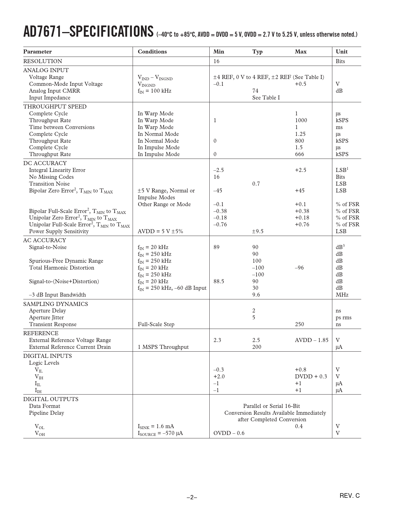AD7671–SPECIFICATIONS (–40 C to +85 C, AVDD = DVDD = 5 V, OVDD = 2.7 V to 5.25 V, unless otherwise noted.) Parameter Conditions Min Typ Max Unit
