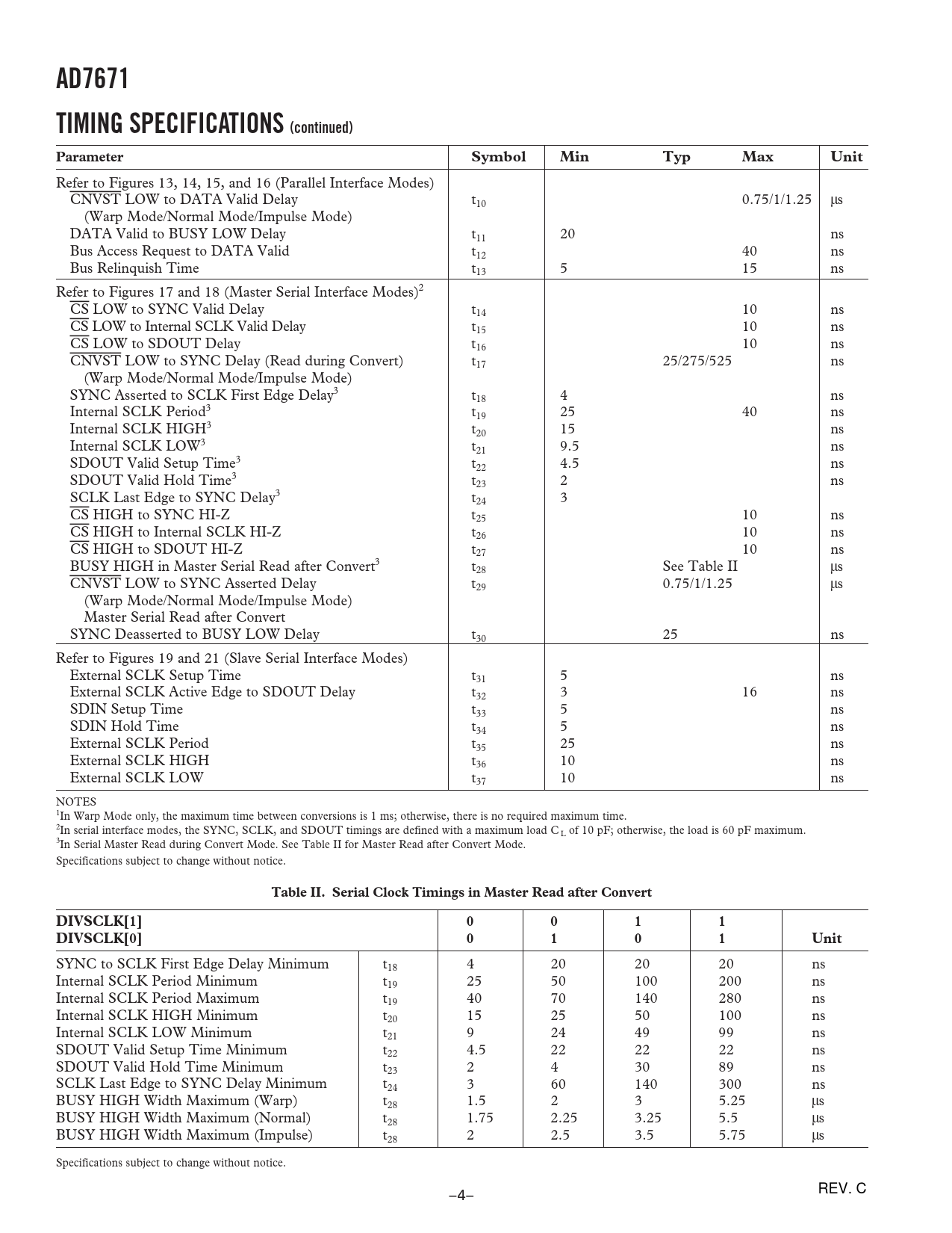 Refer to Figures 13, 14, 15, and 16 (Parallel Interface Modes) CNVST LOW to DATA Valid Delay t10 0.75/1/1.25 ms (Warp Mode/Normal Mode/Impulse Mode) DATA Valid to BUSY LOW Delay t11 20 ns Bus Access Request to DATA Valid t12 40 ns Bus Relinquish Time t13 5 15 ns Refer to Figures 17 and 18 (Master Serial Interface Modes)2 CS LOW to SYNC Valid Delay t14 10 ns CS LOW to Internal SCLK Valid Delay t15 10 ns CS LOW to SDOUT Delay t16 10 ns CNVST LOW to SYNC Delay (Read during Convert) t17 25/275/525 ns (Warp Mode/Normal Mode/Impulse Mode) SYNC Asserted to SCLK First Edge Delay3 t18 4 ns Internal SCLK Period3 t19 25 40 ns Internal SCLK HIGH3 t20 15 ns Internal SCLK LOW3 t21 9.5 ns SDOUT Valid Setup Time3 t22 4.5 ns SDOUT Valid Hold Time3 t23 2 ns SCLK Last Edge to SYNC Delay3 t24 3 CS HIGH to SYNC HI-Z t25 10 ns CS HIGH to Internal SCLK HI-Z t26 10 ns CS HIGH to SDOUT HI-Z t27 10 ns BUSY HIGH in Master Serial Read after Convert3 t28 See Table II ms CNVST LOW to SYNC Asserted Delay t29 0.75/1/1.25 ms (Warp Mode/Normal Mode/Impulse Mode) Master Serial Read after Convert SYNC Deasserted to BUSY LOW Delay t30 25 ns Refer to Figures 19 and 21 (Slave Serial Interface Modes) External SCLK Setup Time t31 5 ns External SCLK Active Edge to SDOUT Delay t32 3 16 ns SDIN Setup Time t33 5 ns SDIN Hold Time t34 5 ns External SCLK Period t35 25 ns External SCLK HIGH t36 10 ns External SCLK LOW t37 10 ns NOTES 1In Warp Mode only, the maximum time between conversions is 1 ms; otherwise, there is no required maximum time. 2In serial interface modes, the SYNC, SCLK, and SDOUT timings are defined with a maximum load C L of 10 pF; otherwise, the load is 60 pF maximum. 3In Serial Master Read during Convert Mode. See Table II for Master Read after Convert Mode. Specifications subject to change without notice.